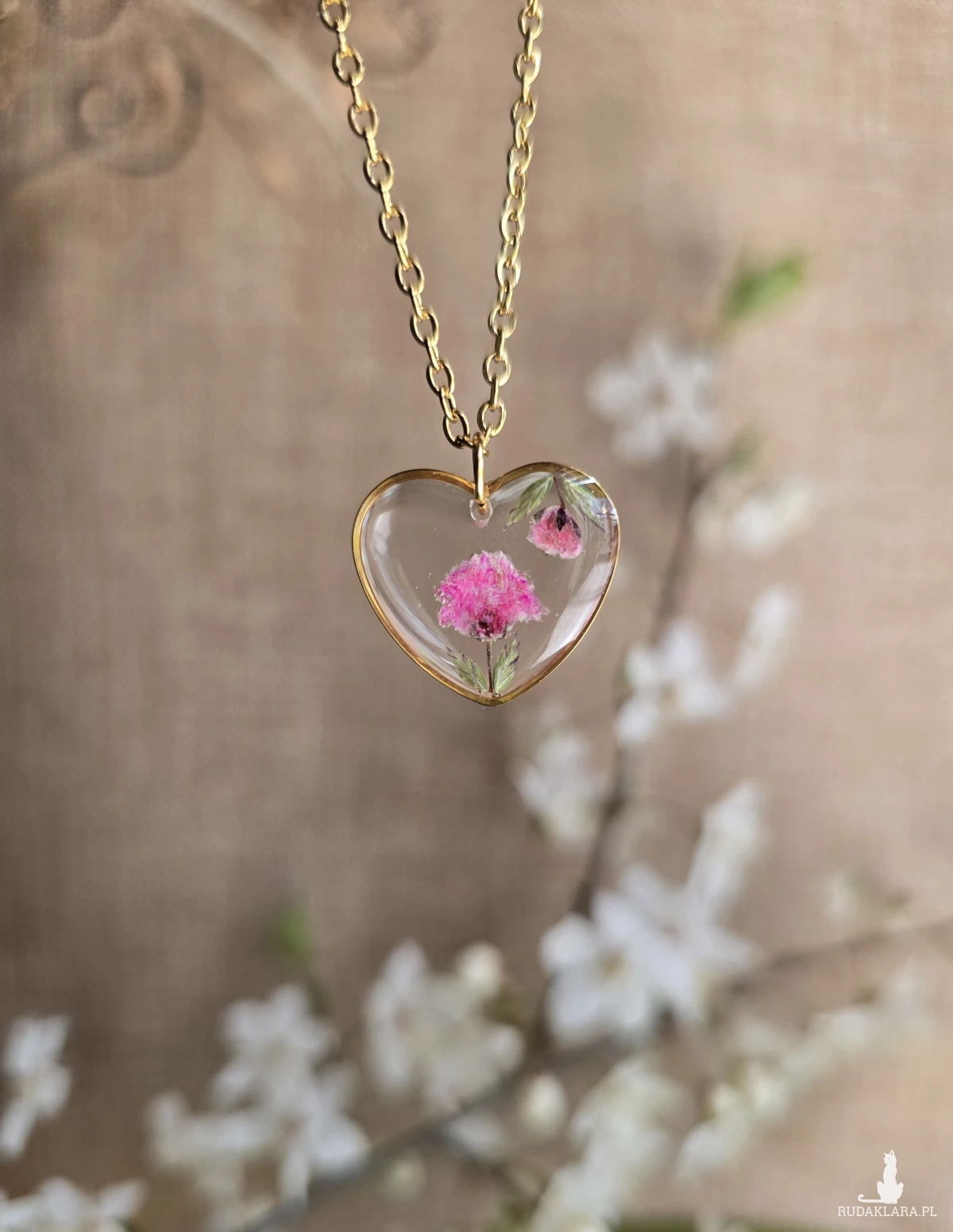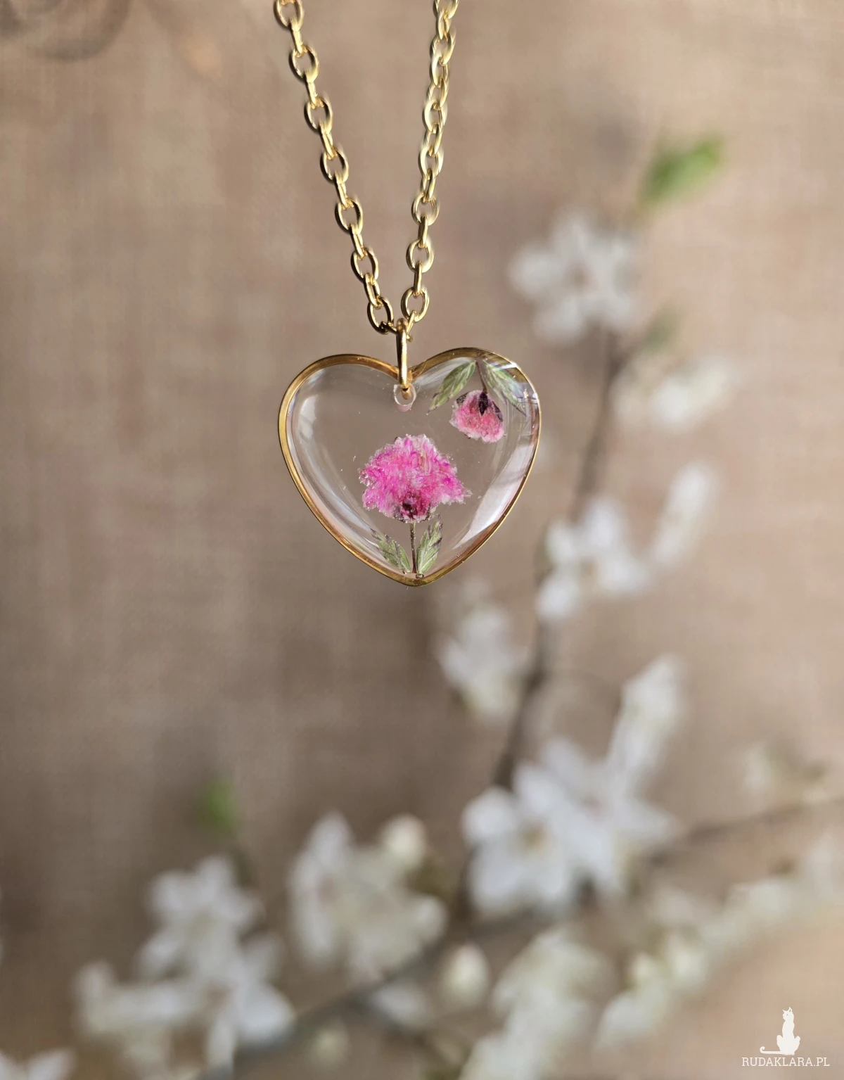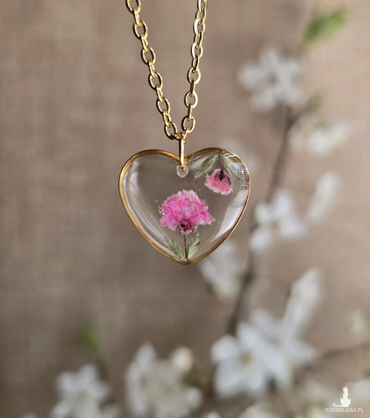 Oferuję Państwu unikalną biżuterię. Zawieszka jest wykonana z suszonych kwiatów i żywicy epoksydowej. Biżuteria jest wspaniałym i oryginalnym prezentem na lata.