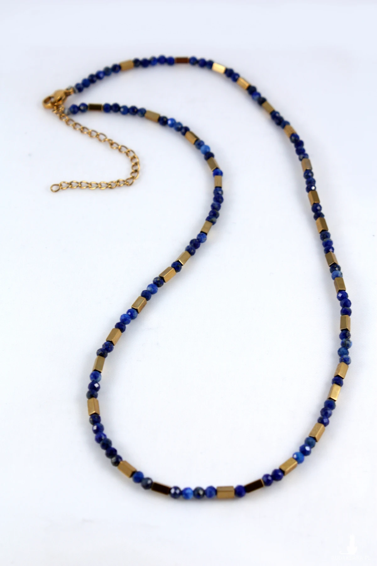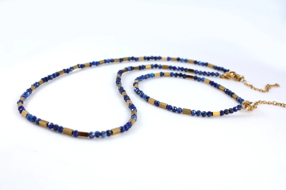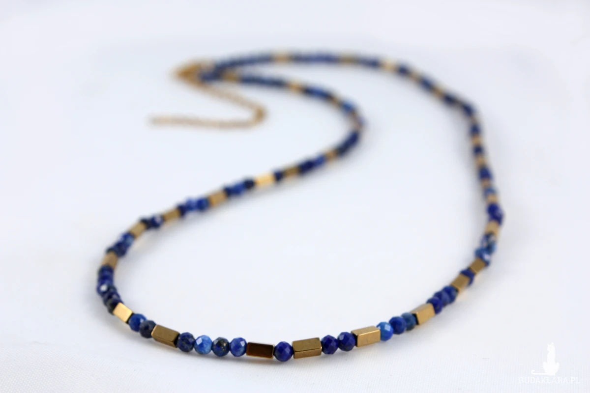 Naszyjnik z naturalnych kamieni lapis lazuli z prostokątnymi elementami w kolorze złota z hematytu. Naszyjnik poosiada możliwość przedłużenia dzięki czemu można go indywidualnie dopasować. Lapis lazuli ma niezwykłe właściwości: reguluje krążenie krwi, wspomaga prawidłowy przepływ krwi i może pomóc w obniżeniu ciśnienia krwi. Łagodzi stany zapalne. Kamień ten ma właściwości przeciwzapalne, co może przynieść ulgę w bólach i obrzękach, szczególnie przy migrenach.