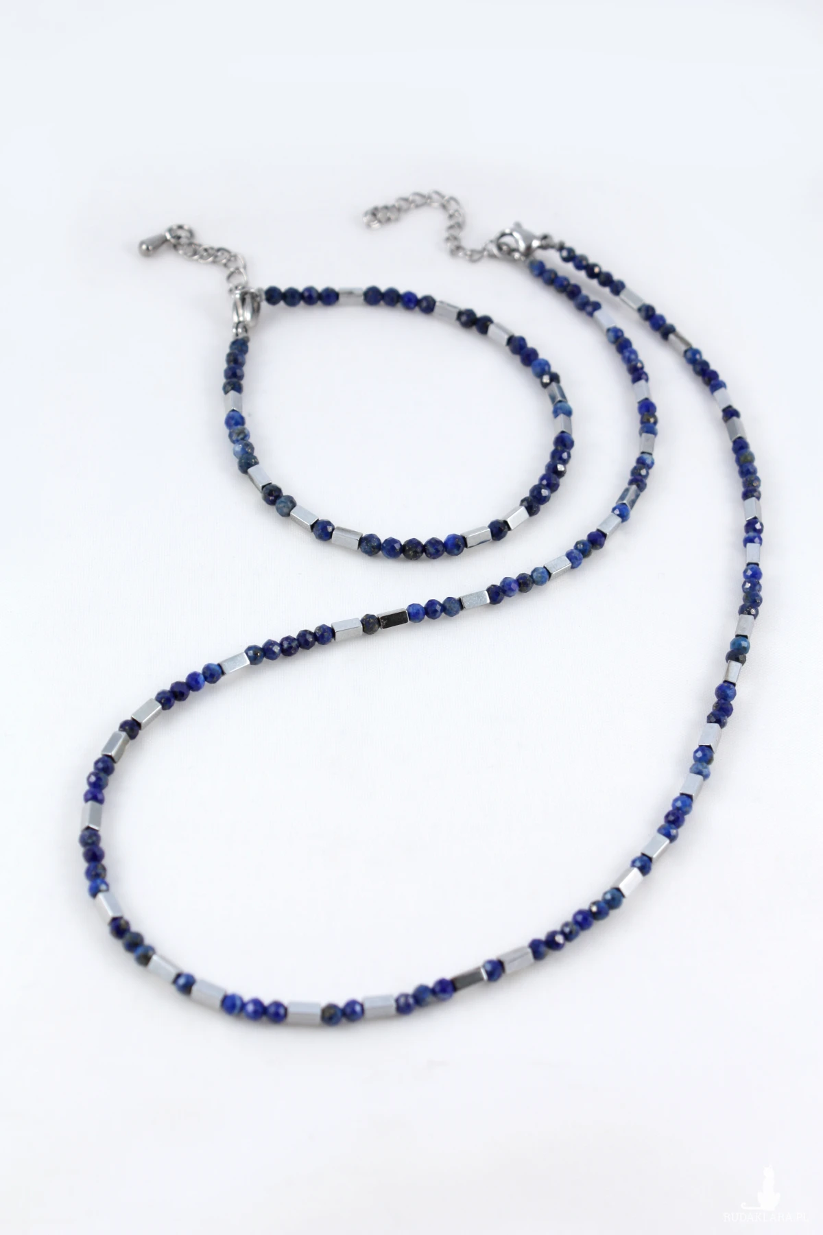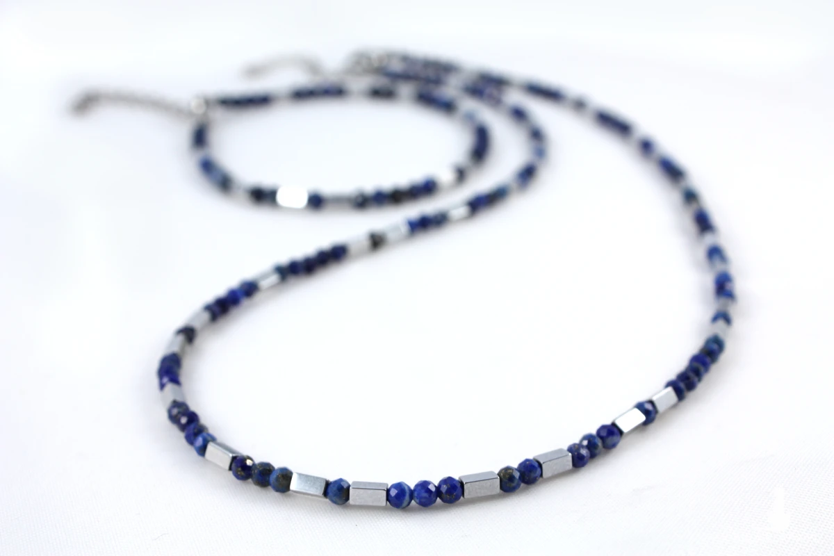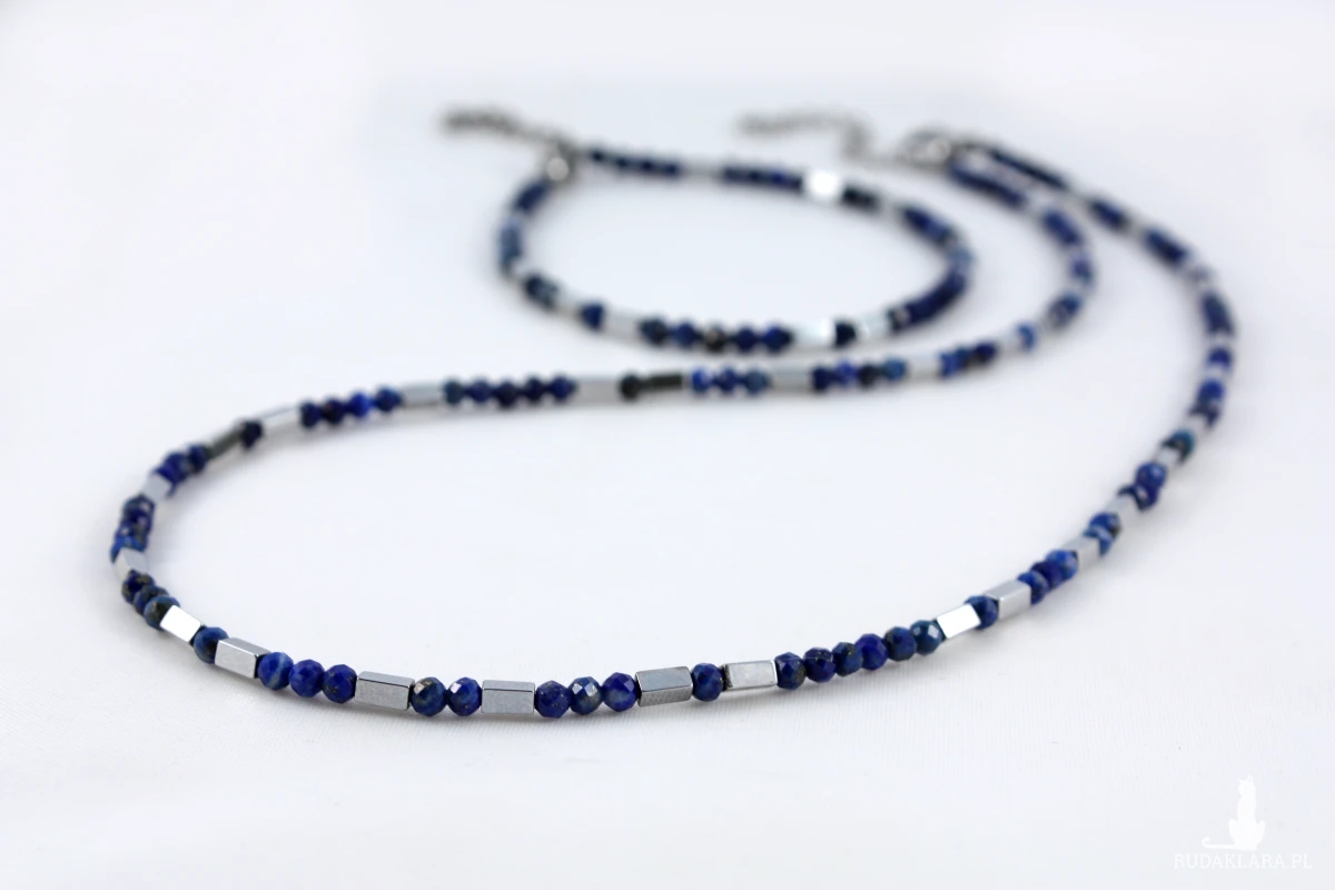 Komplet naszyjnik z bransoletką z naturalnych kamieni lapis lazuli z prostokątnymi elementami w kolorze SREBRA z hematytu. Naszyjnik i bransoletka poosiadają możliwość przedłużenia dzięki czemu można je indywidualnie dopasować.