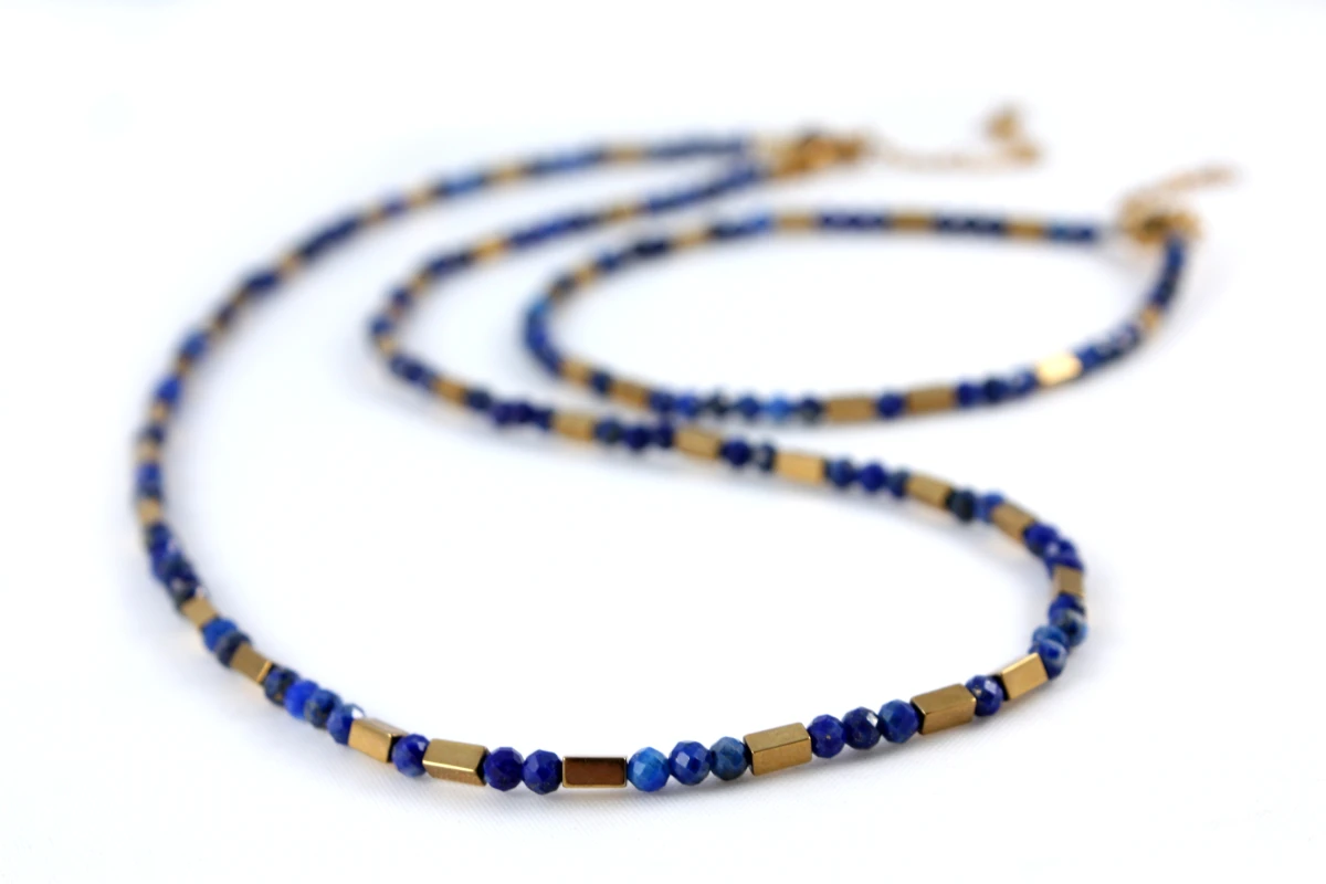 Komplet naszyjnik z bransoletką z naturalnych kamieni lapis lazuli z prostokątnymi elementami w kolorze złota z hematytu. Naszyjnik i bransoletka poosiadają możliwość przedłużenia dzięki czemu można je indywidualnie dopasować.