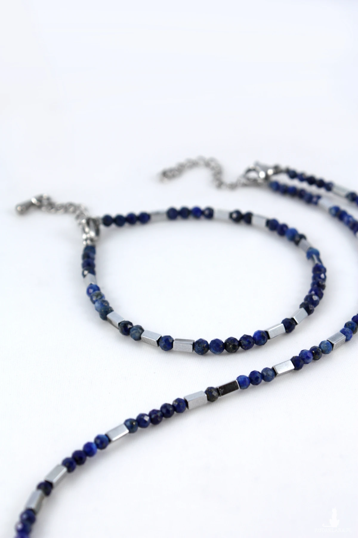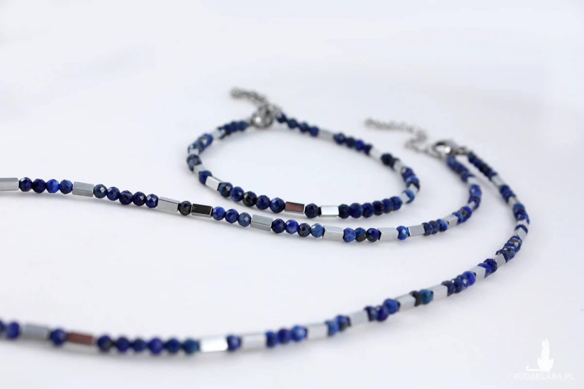 Bransoletka z naturalnych kamieni lapis lazuli z prostokątnymi elementami w kolorze srebra z hematytu. Bransoletka poosiada możliwość przedłużenia dzięki czemu można ją indywidualnie dopasować.