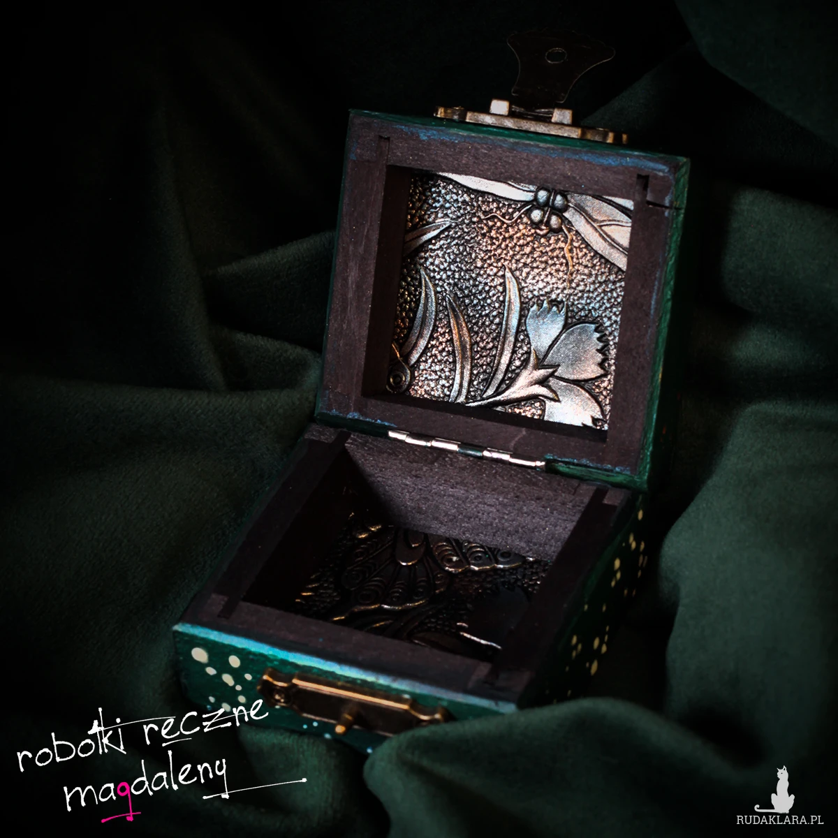 Szkatułka drewniana ze szklaną źrenicą, malowane farbami akrylowymi, zabezpieczone bejcą i lakierem akrylowym.