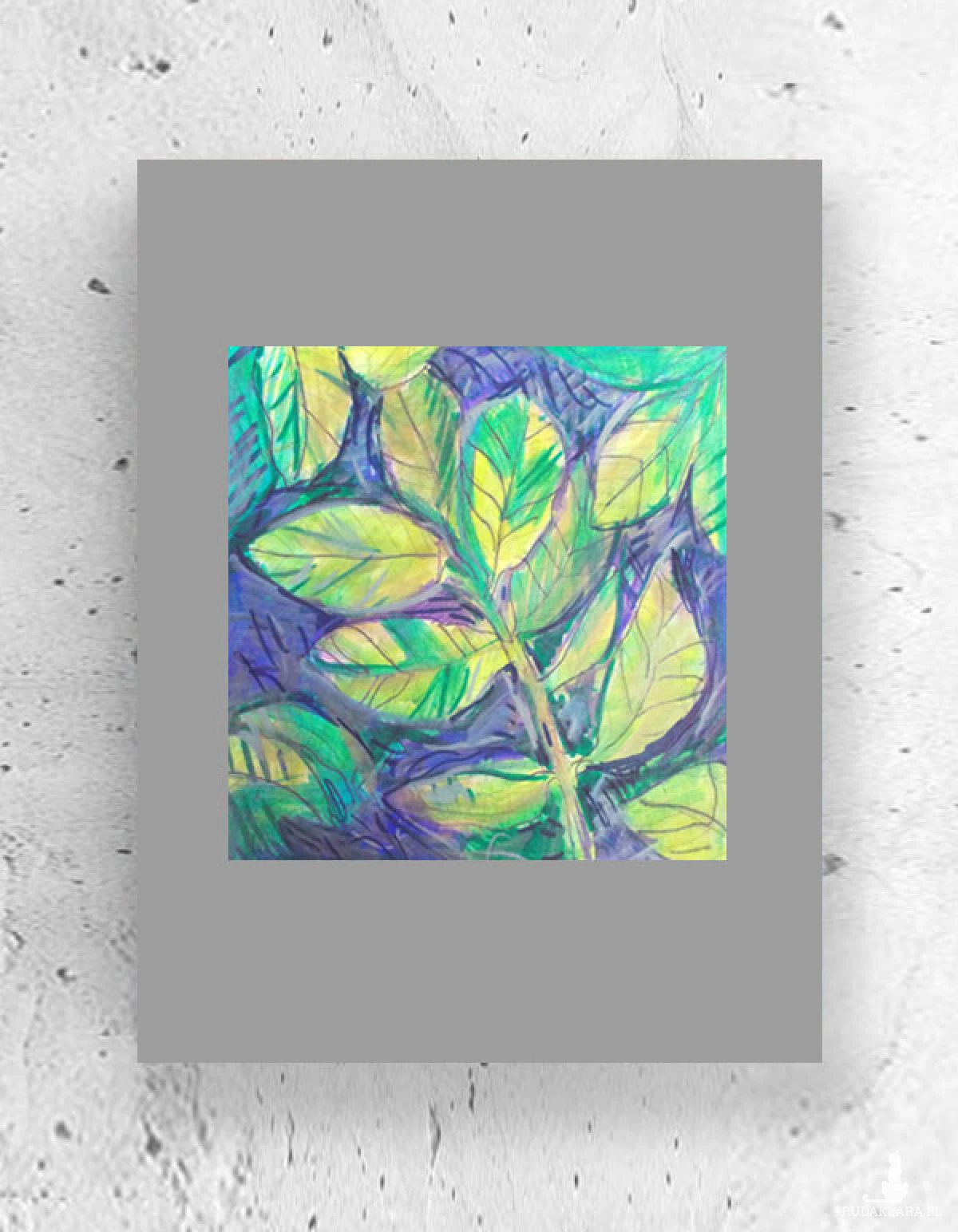 Kolorowy obrazek z liśćmi. Grafika na szarym kartoniku w rozmiarze A4. Ilustrację należy tylko oprawić w ramkę 21x30 cm. Dekoracja na ścianę do przedpokoju, jadalni, sypialni, kuchni, salonu, pokoju młodzieżowego lub dziecięcego, gabinetu, holu. Obrazek będzie pasował zarówno do wnętrz boho, nowoczesnych, hygge, loftowych, eklektycznych, jak i do tradycyjnych, rustykalnych, vintage, klasycznych. Przedmiot do ozdoby wnętrz.