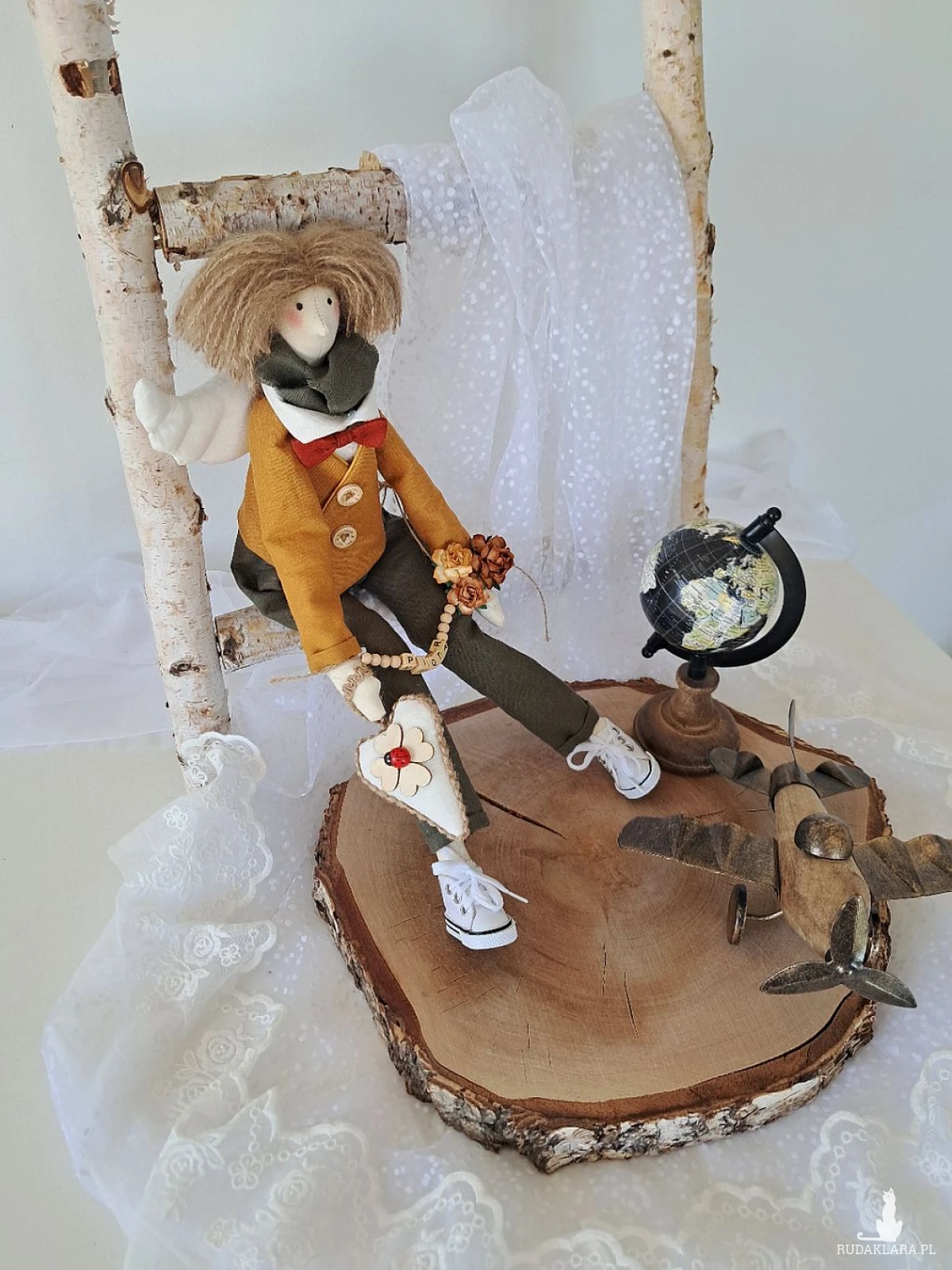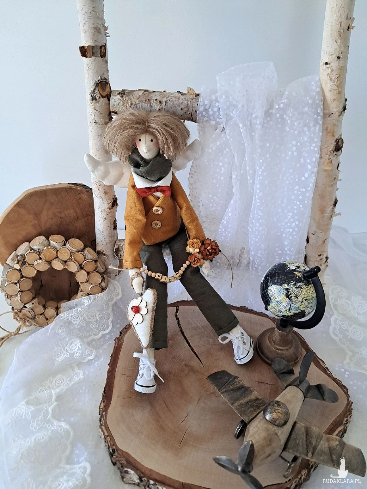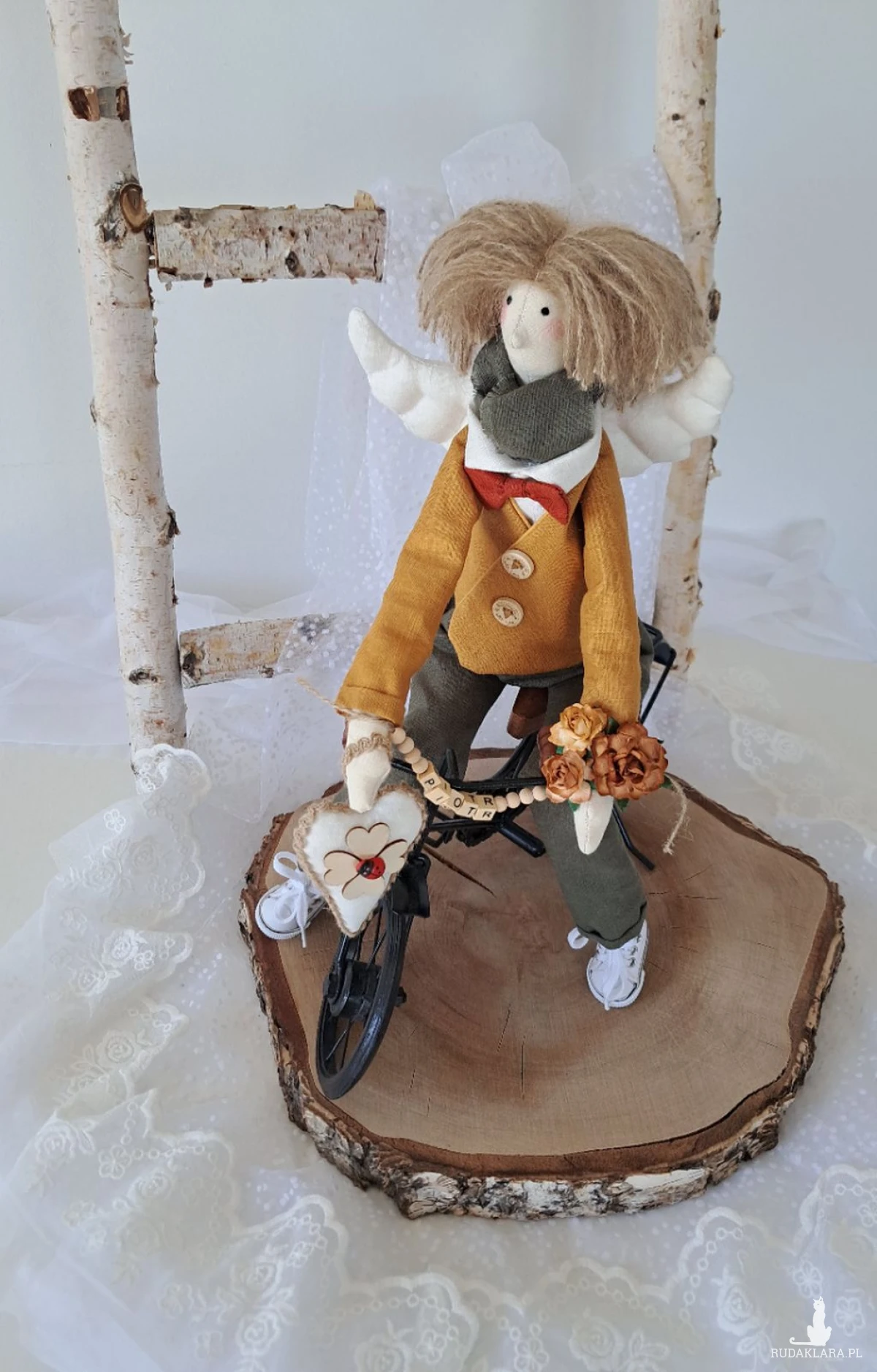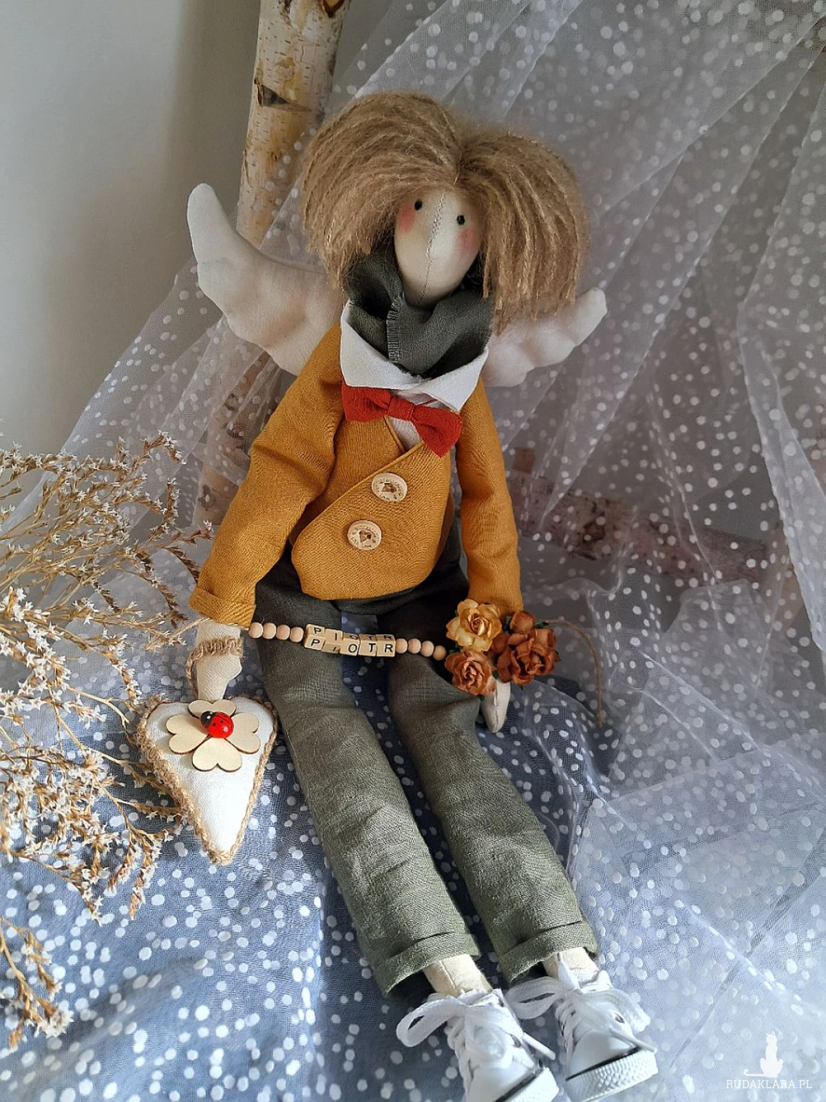 Witam serdecznie. Mam do sprzedania anioła chłopca. Ubranko z wysokogatunkowego lnu: biała koszula, marynarka koloru musztardy, spodnie ciemna zieleń. Pod szyją apaszka i muszka. Guziki drewniane. Skrzydła i serduszko również uszyte z lnu. Serduszko udekorowane koniczynką czterolistną i biedroneczką. Na stópkach białe trampki. Włosy z wełny koloru brązowego. Imię koralikowe zmienię stosownie do potrzeby (proszę o wiadomość w tym zakresie)Wysokość 47 cm. Może siedzieć lub być zawieszony.
