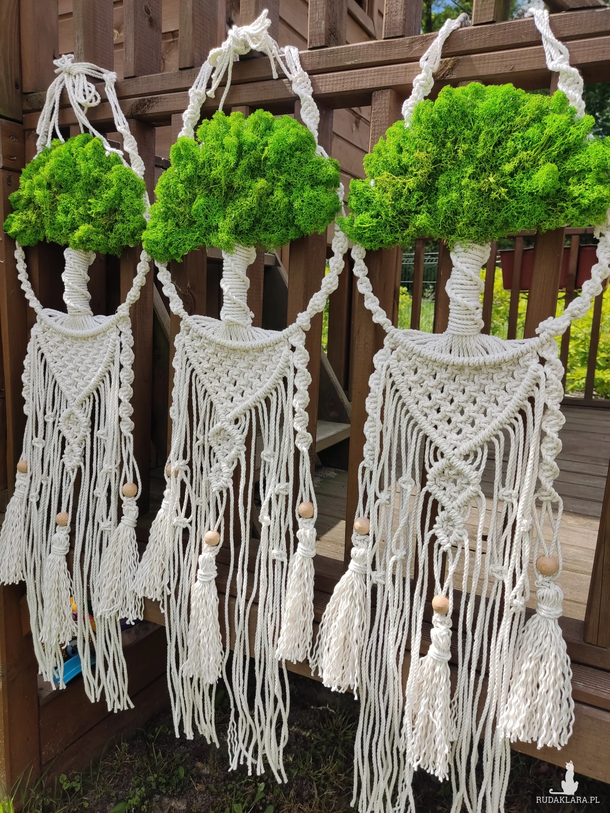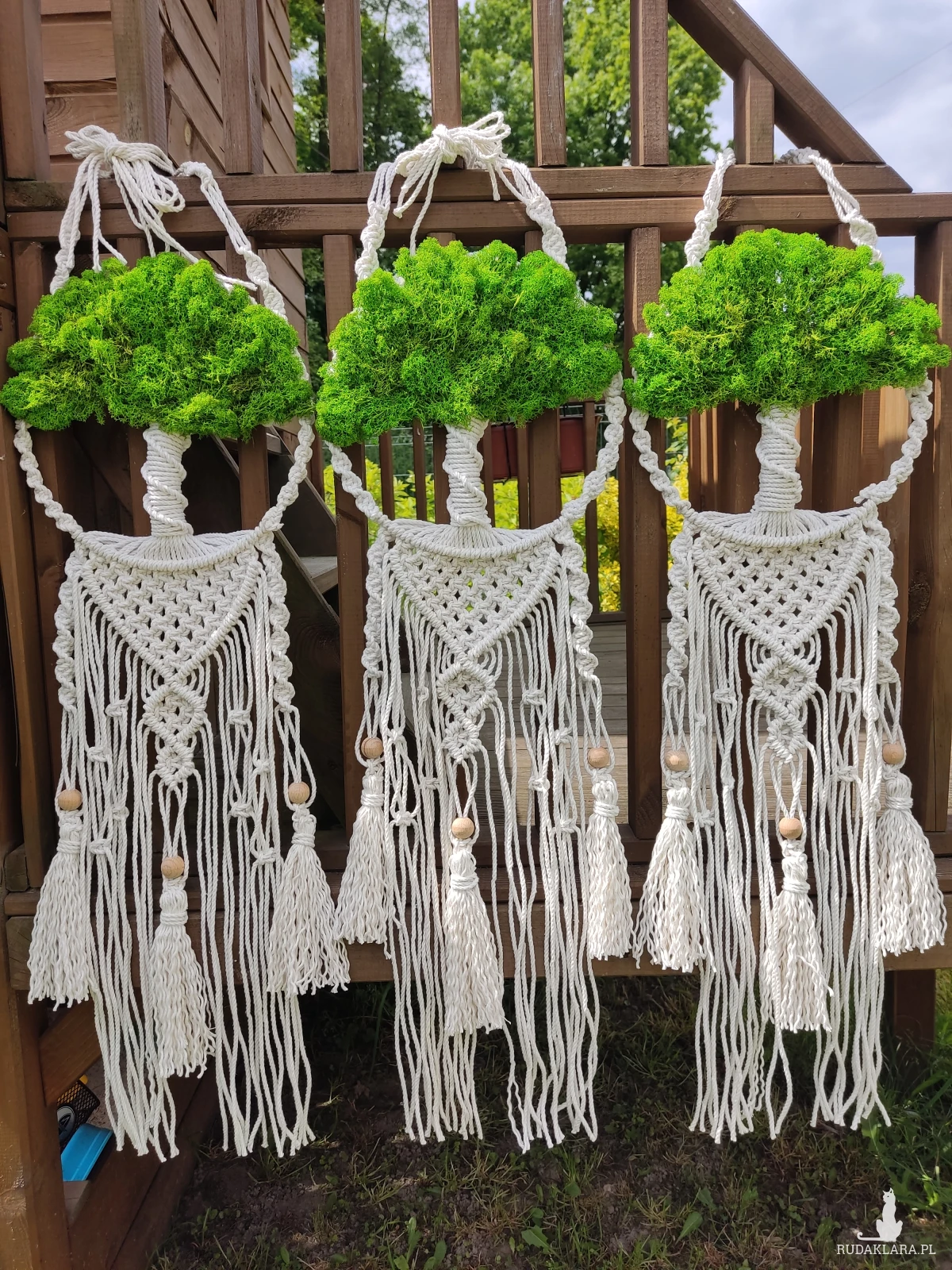 Sprzedam ręcznie wykonane drzewko metodą makramy z chrobotkiem. Drzewko zostało wyplecione ze sznurka 3 PLY w kolorze naturalnym z dodatkiem drewnianych koralików. Całkowita długość z drzewka wynosi 80cm, średnica koła 25 cm.