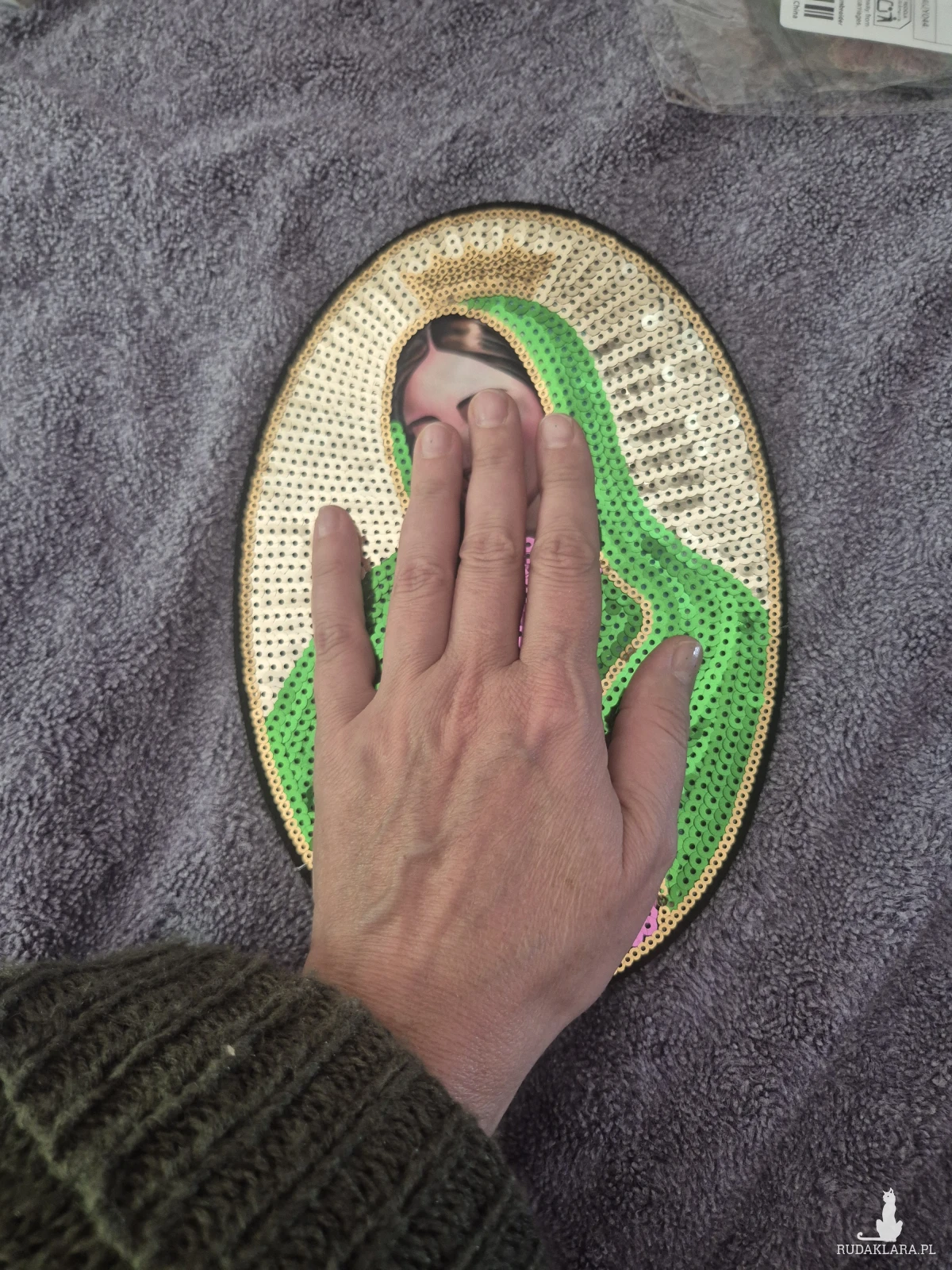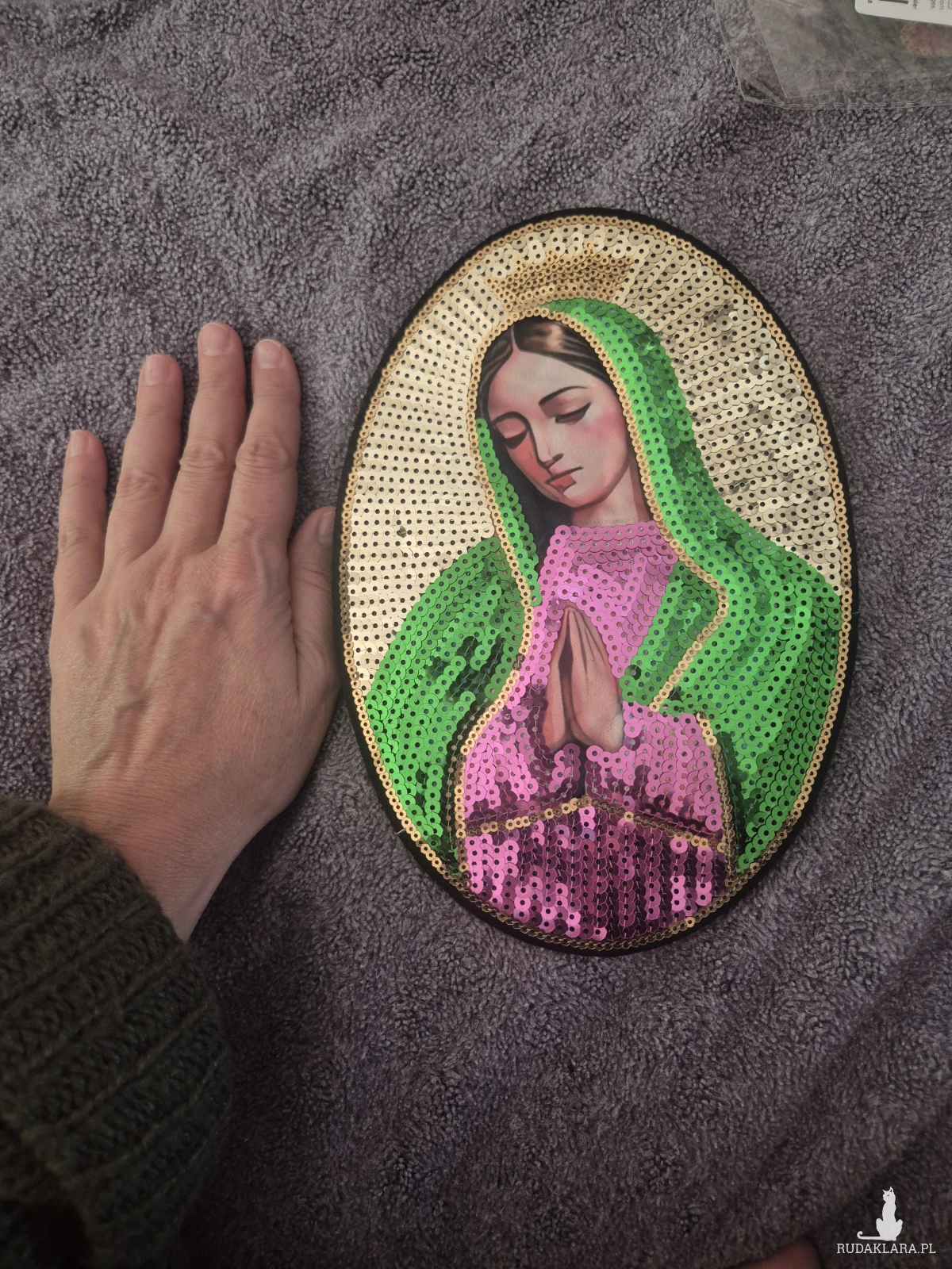 Duza cekinowa naszywka Matka Boska, piekna, swietna do naszycia na kurtke jeansowa, sweter, płaszcz. Sprowadzana ze wschodu, mega kolorowa,wielkosc 16 cm na 23cm, polecam