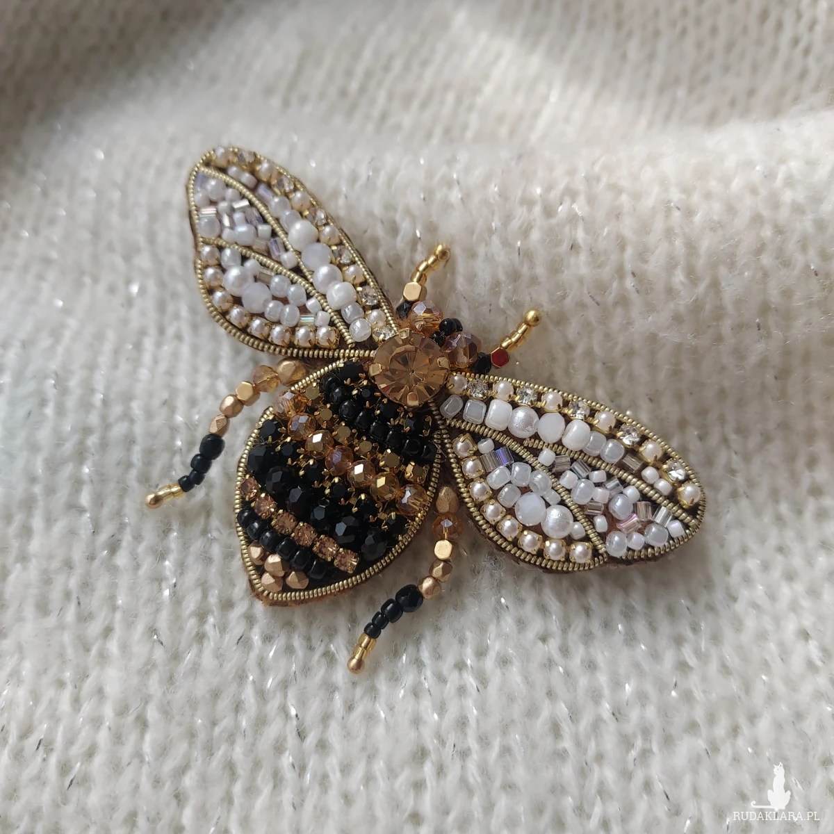 Perłowo-złoto-brązowa broszka pszczoła wykonana techniką haftu koralikowego to idealny dodatek biżuteryjny dla osób ceniących nie tylko estetykę, ale także otaczającą nas przyrodę!