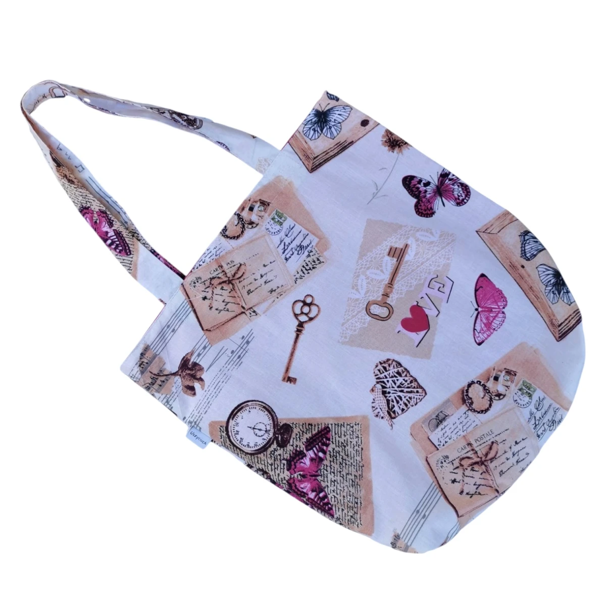 Ekologiczna torba na zakupy uszyta z bawełny 100% z motywem motyli i bawełnianą podszewką w kolorze różowym.