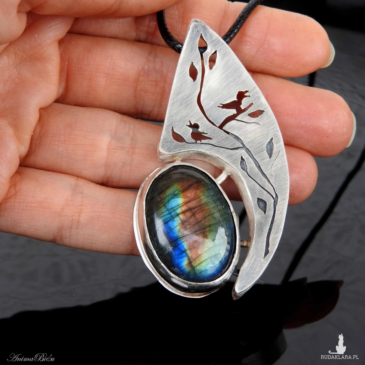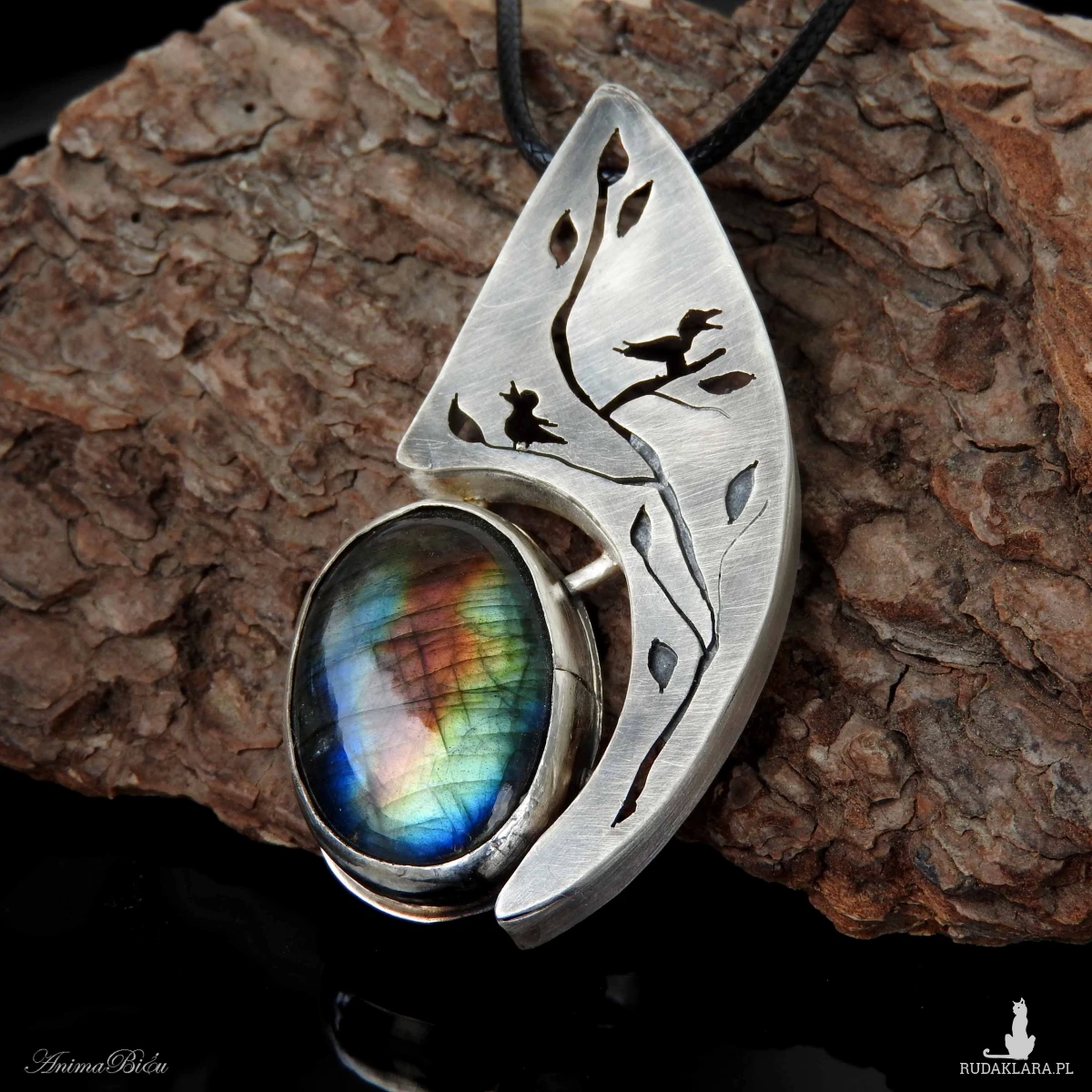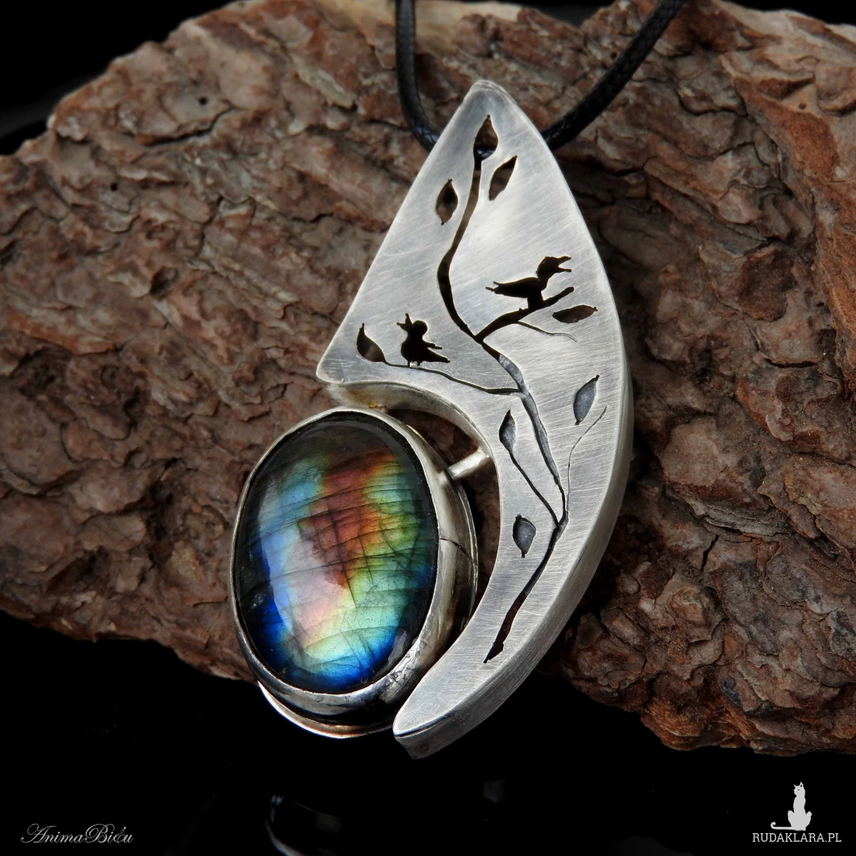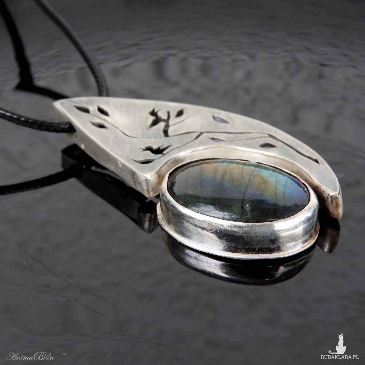 wisior powstał ze srebra próby 925 i 999. Kolorowemu labradorytowi, iryzującemu