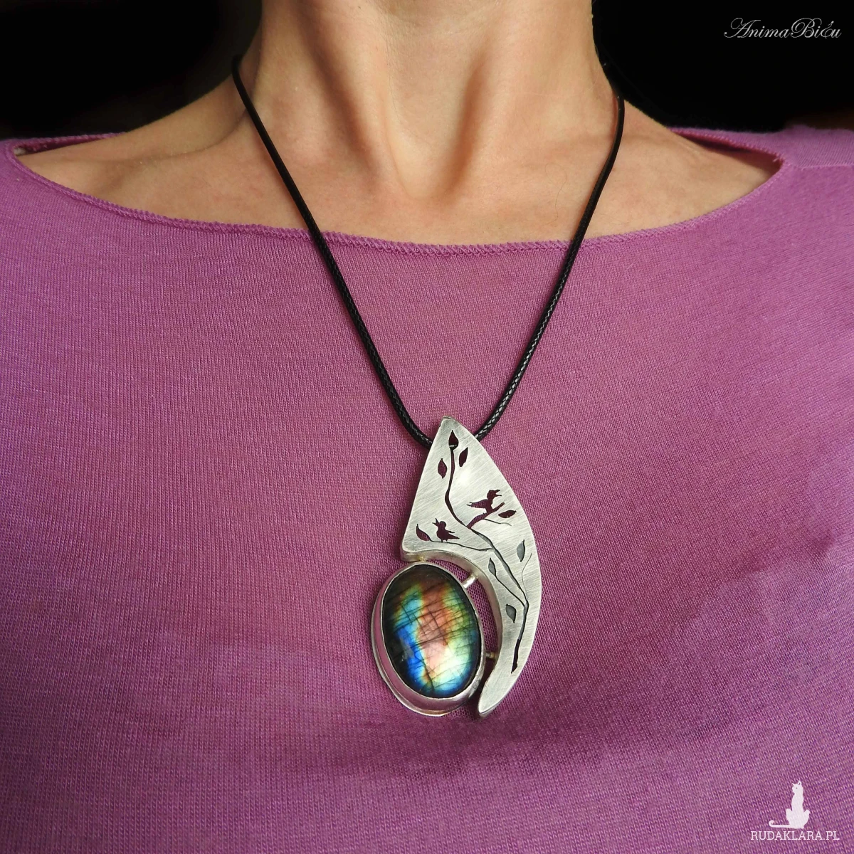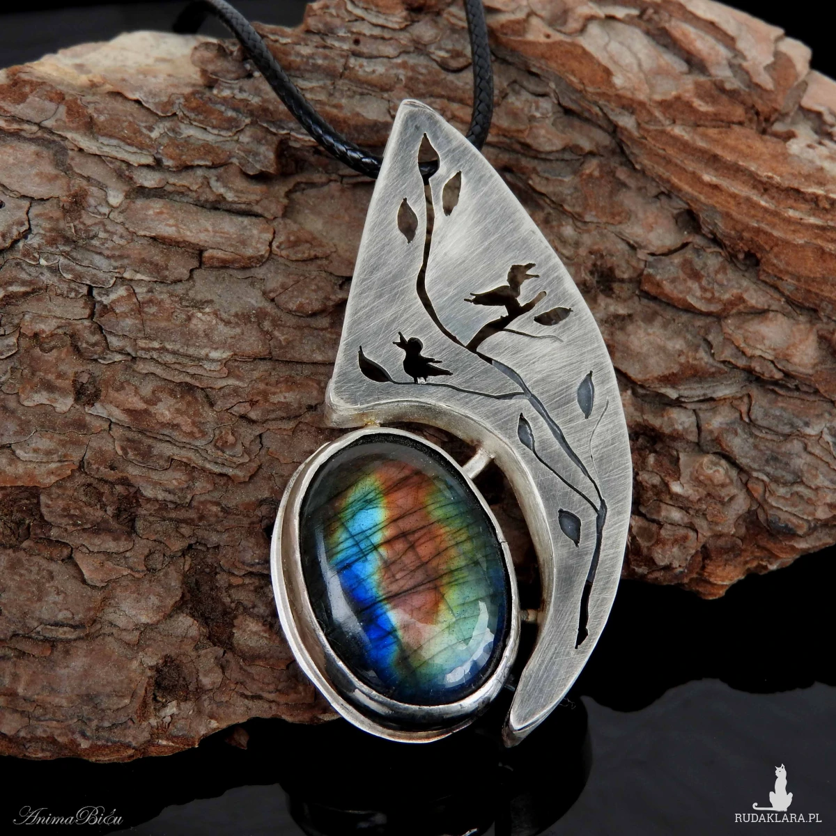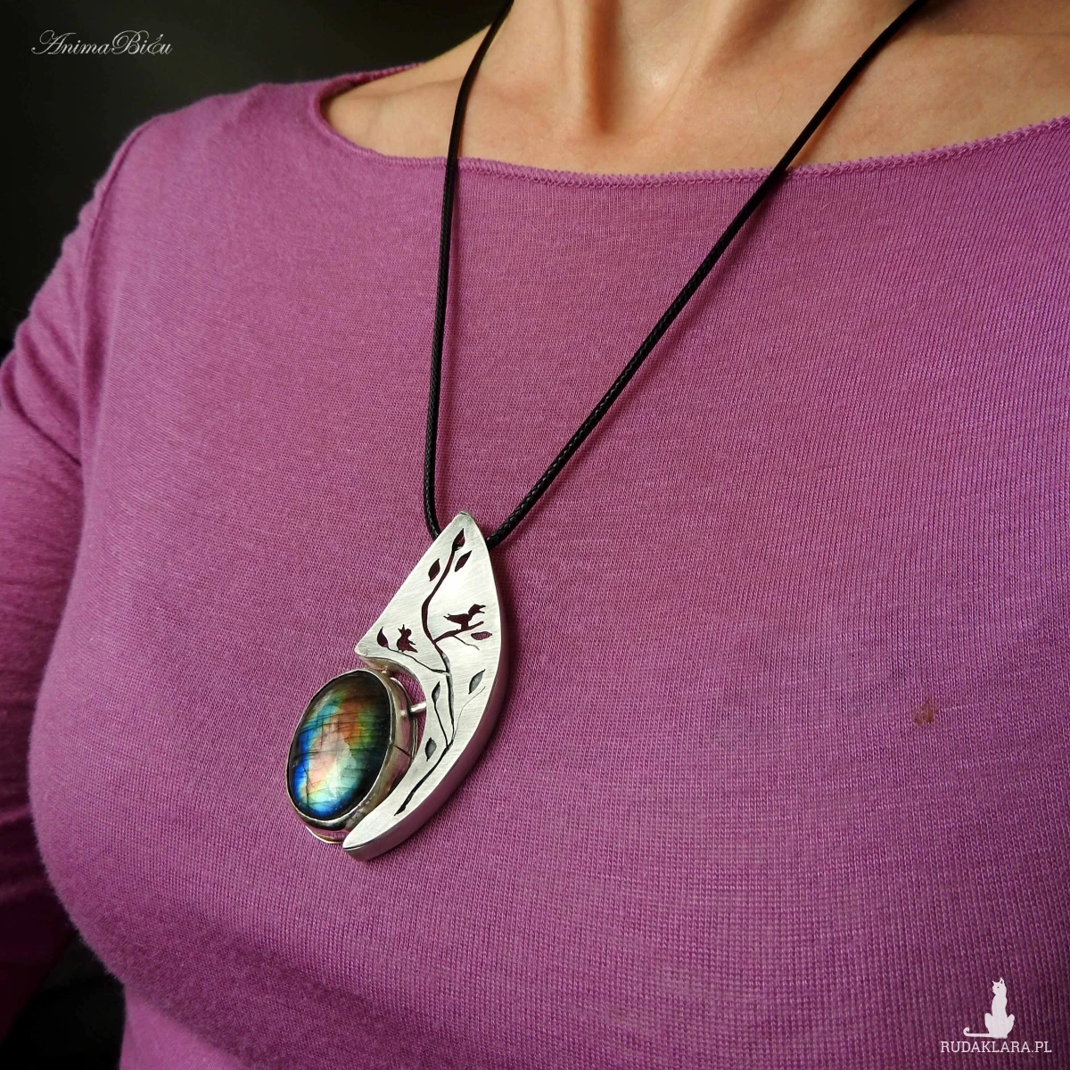 wisior powstał ze srebra próby 925 i 999. Kolorowemu labradorytowi, iryzującemu