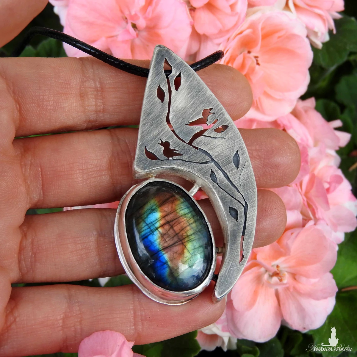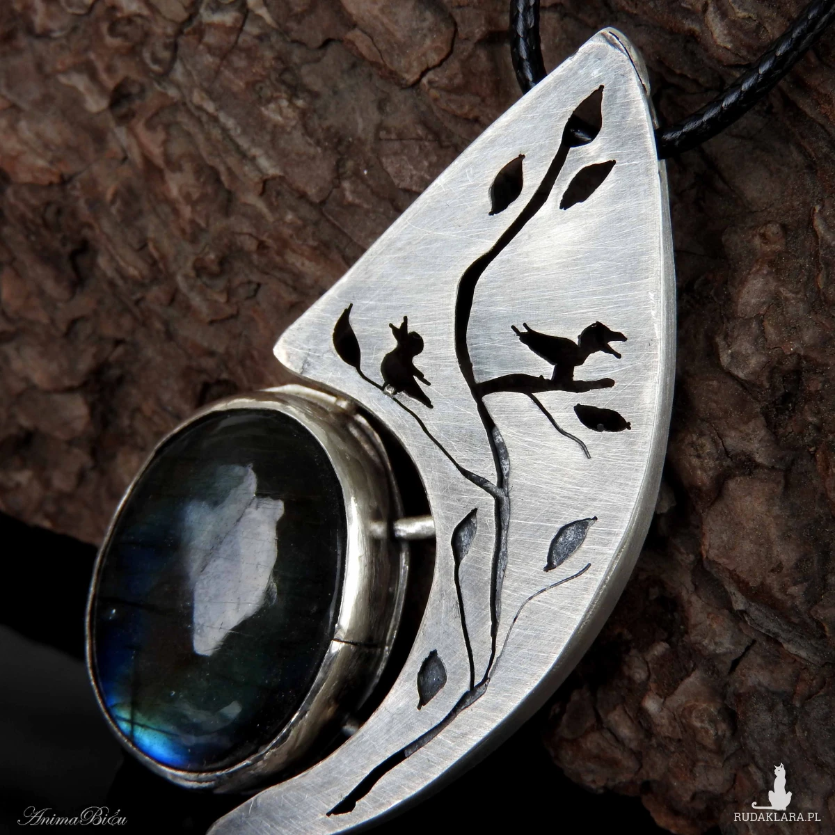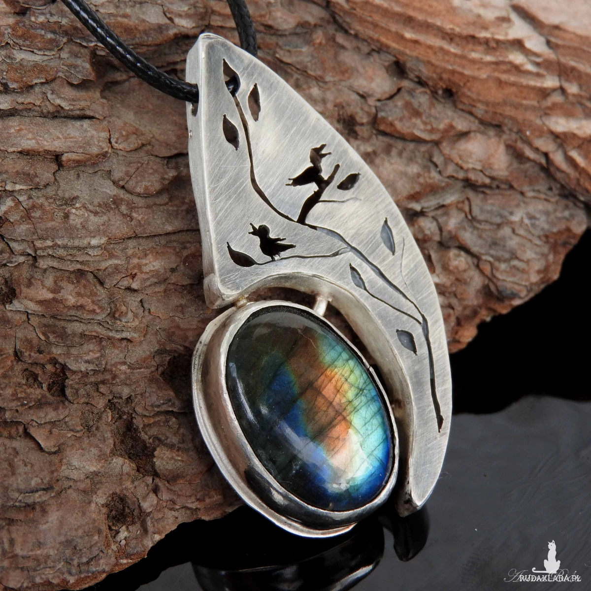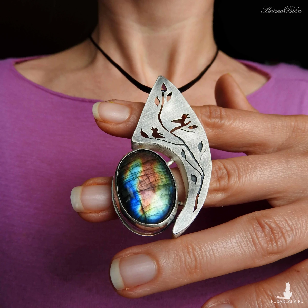 wisior powstał ze srebra próby 925 i 999. Kolorowemu labradorytowi, iryzującemu
