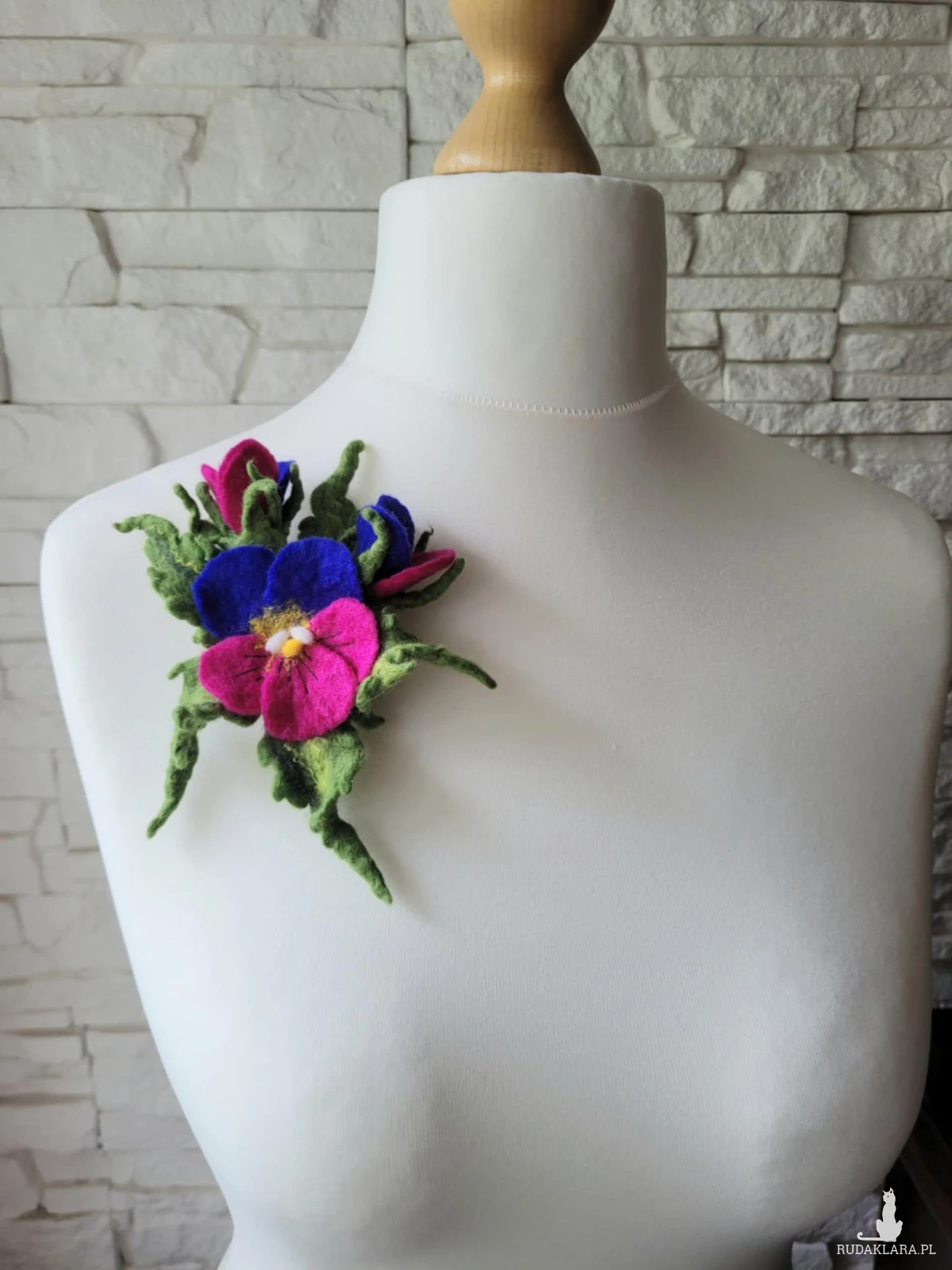 Broszka bratek wykonana techniką filcowania na mokro z wełny merynosów australijskich.