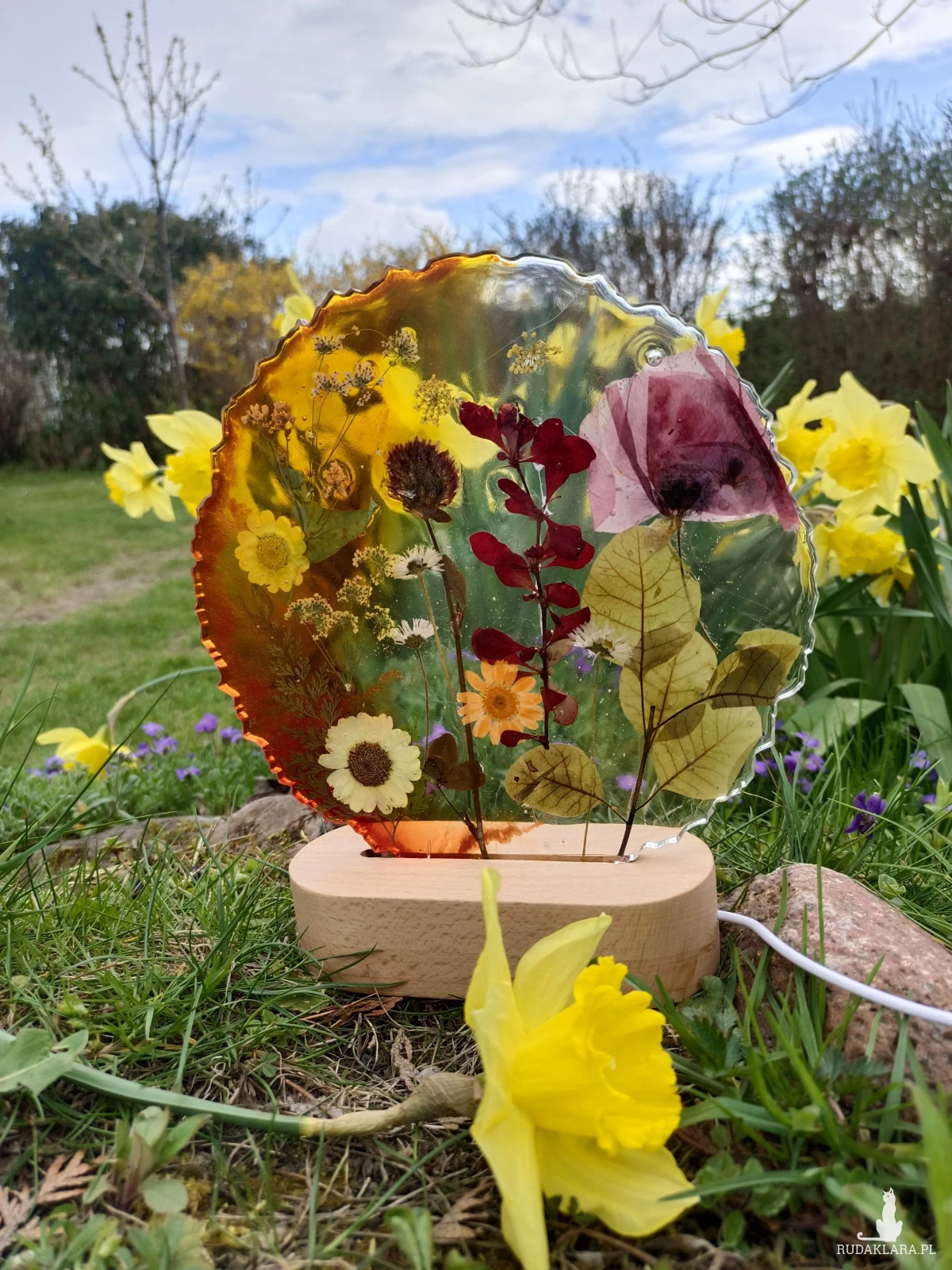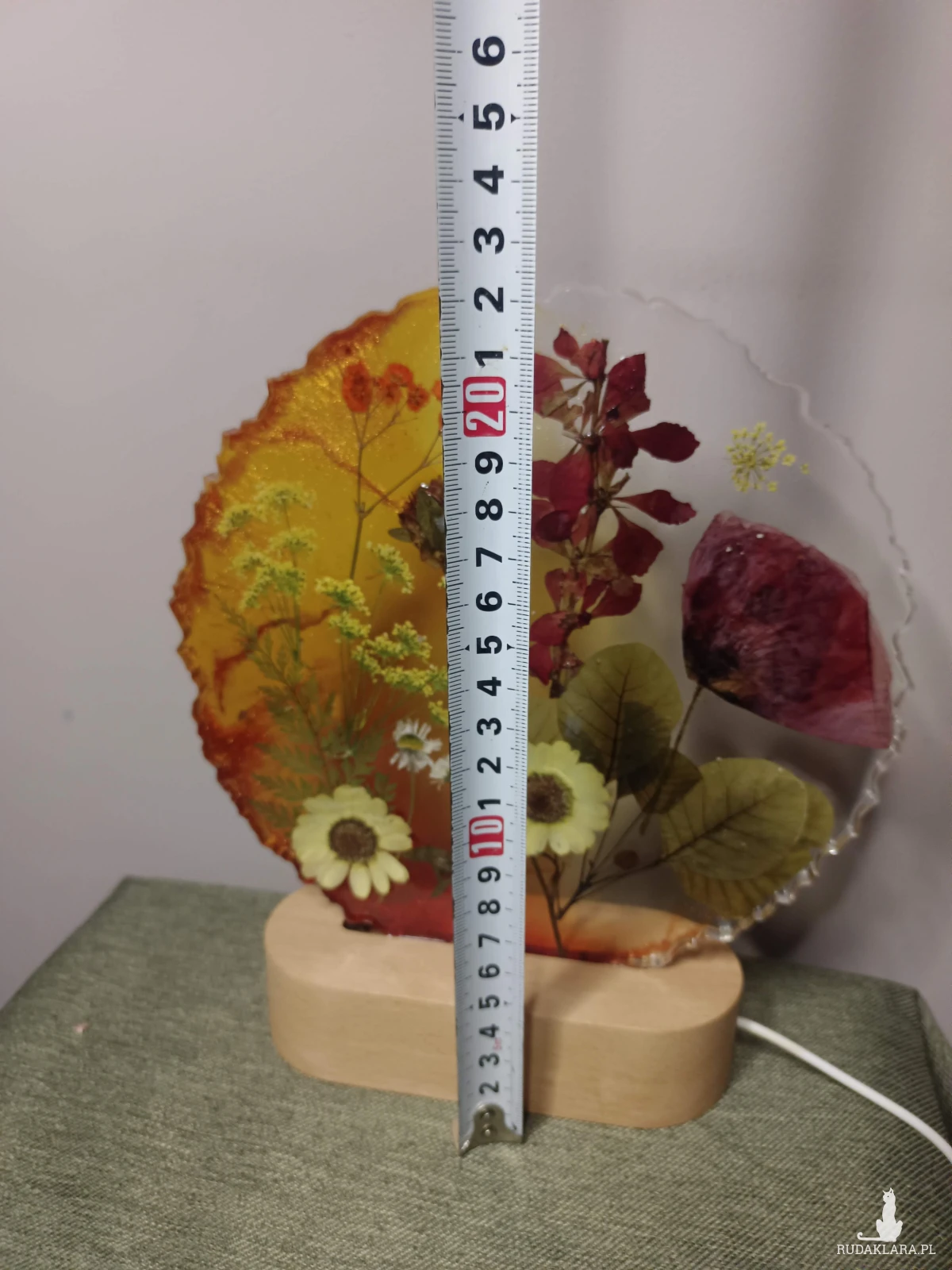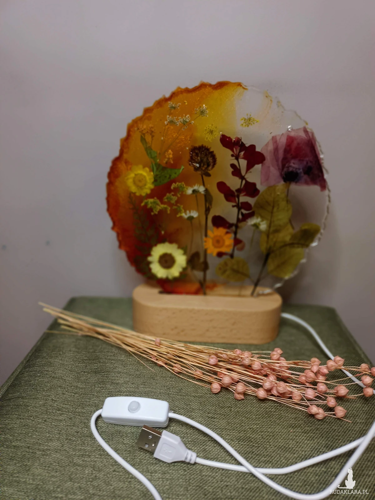 Lampka zasilana przewodem USB, daje subtelne światło rozświetlające zatopione w żywicy kwiaty.