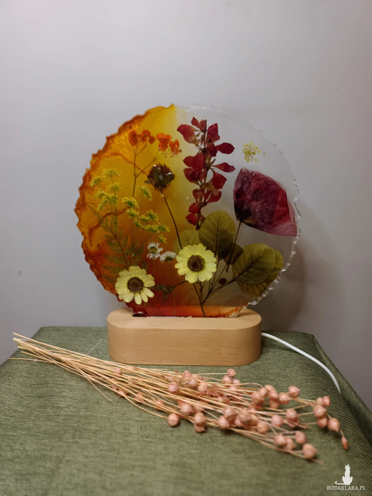 Lampka LED z autorską kompozycją z suszonych kwiatów - tonacja pomarańczowa/bursztynowa