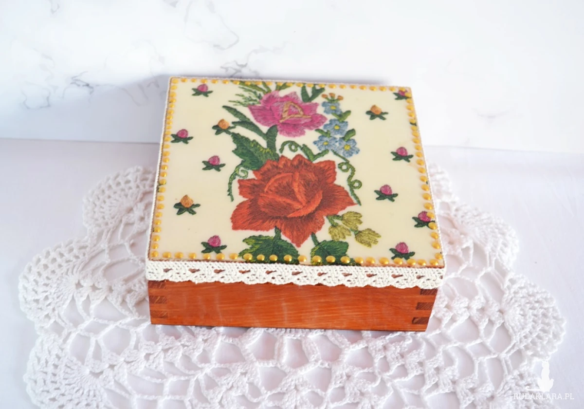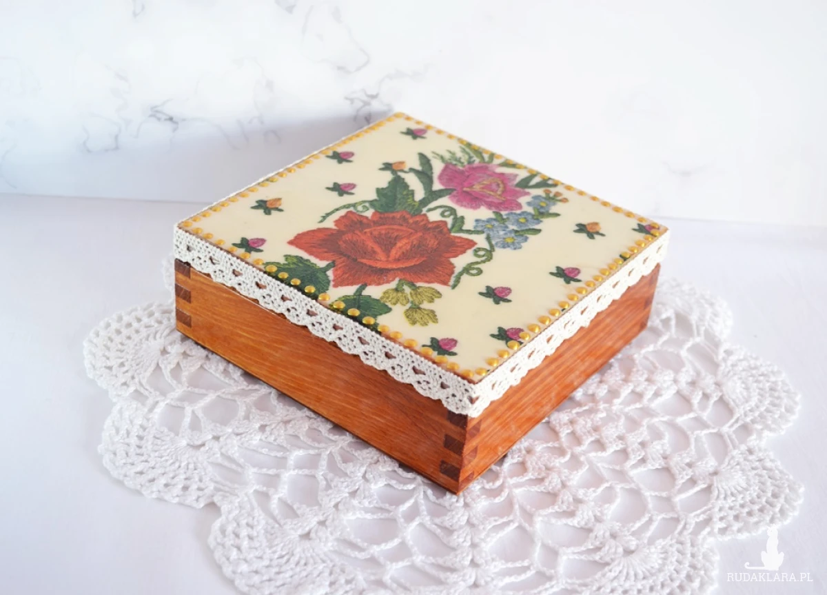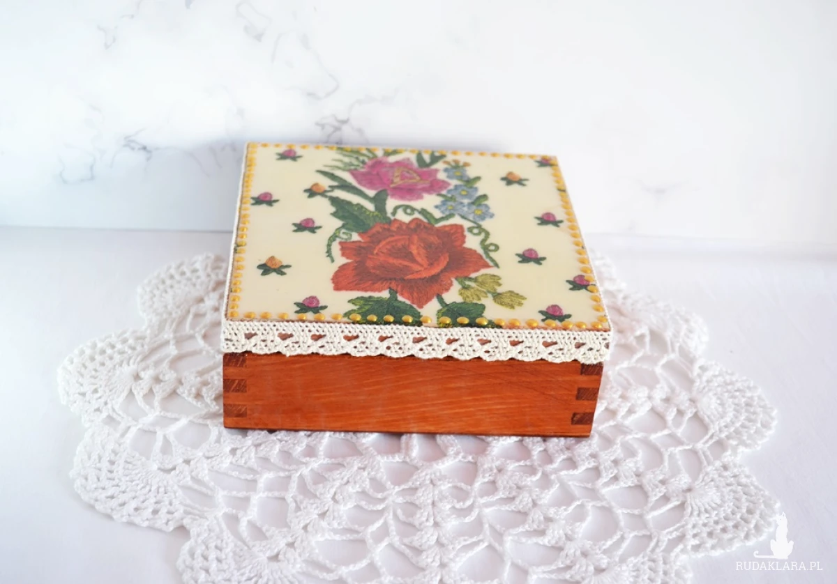Drewniane pudełko zdobione ręcznie techniką decoupage – metoda serwetkowa