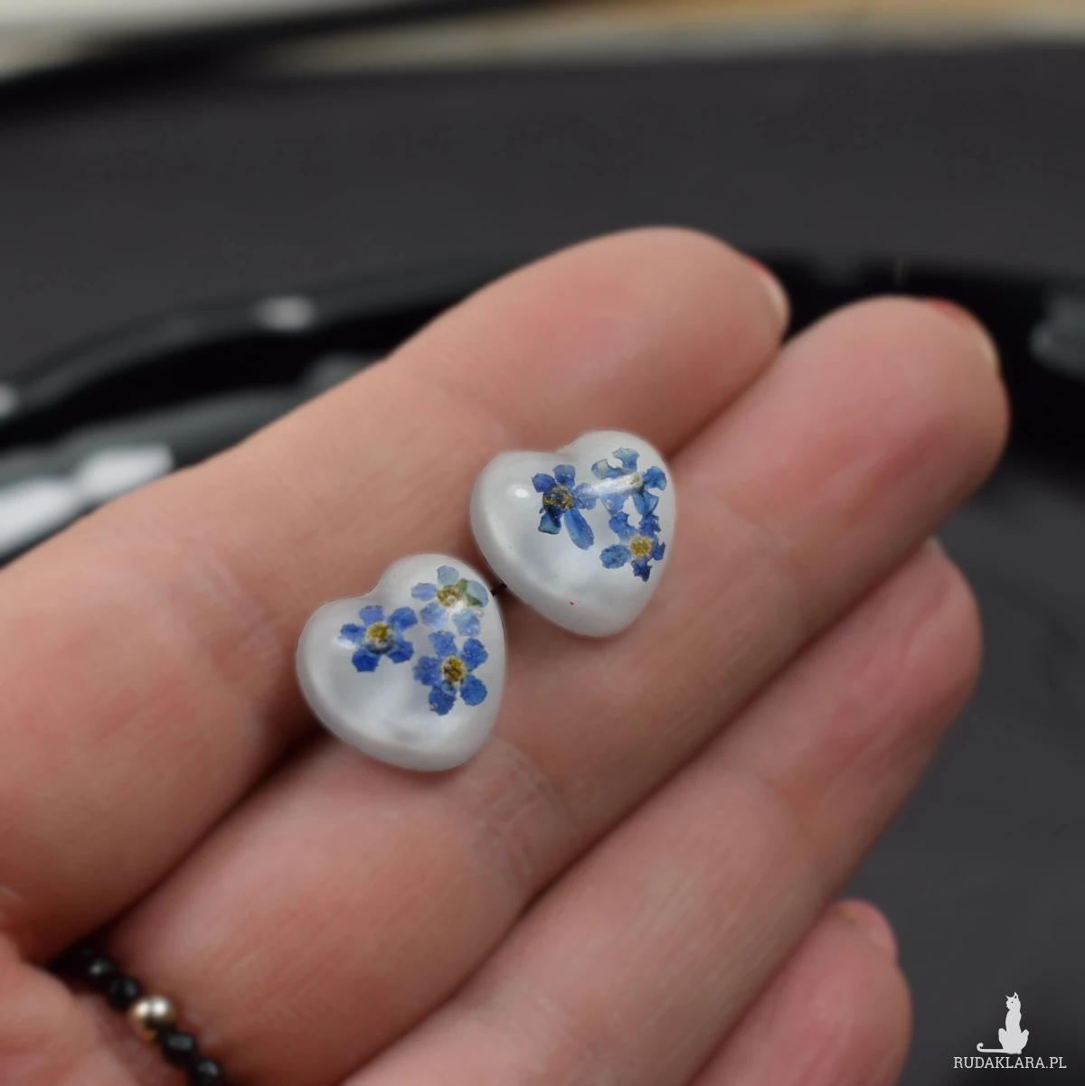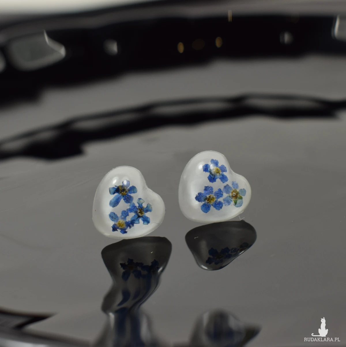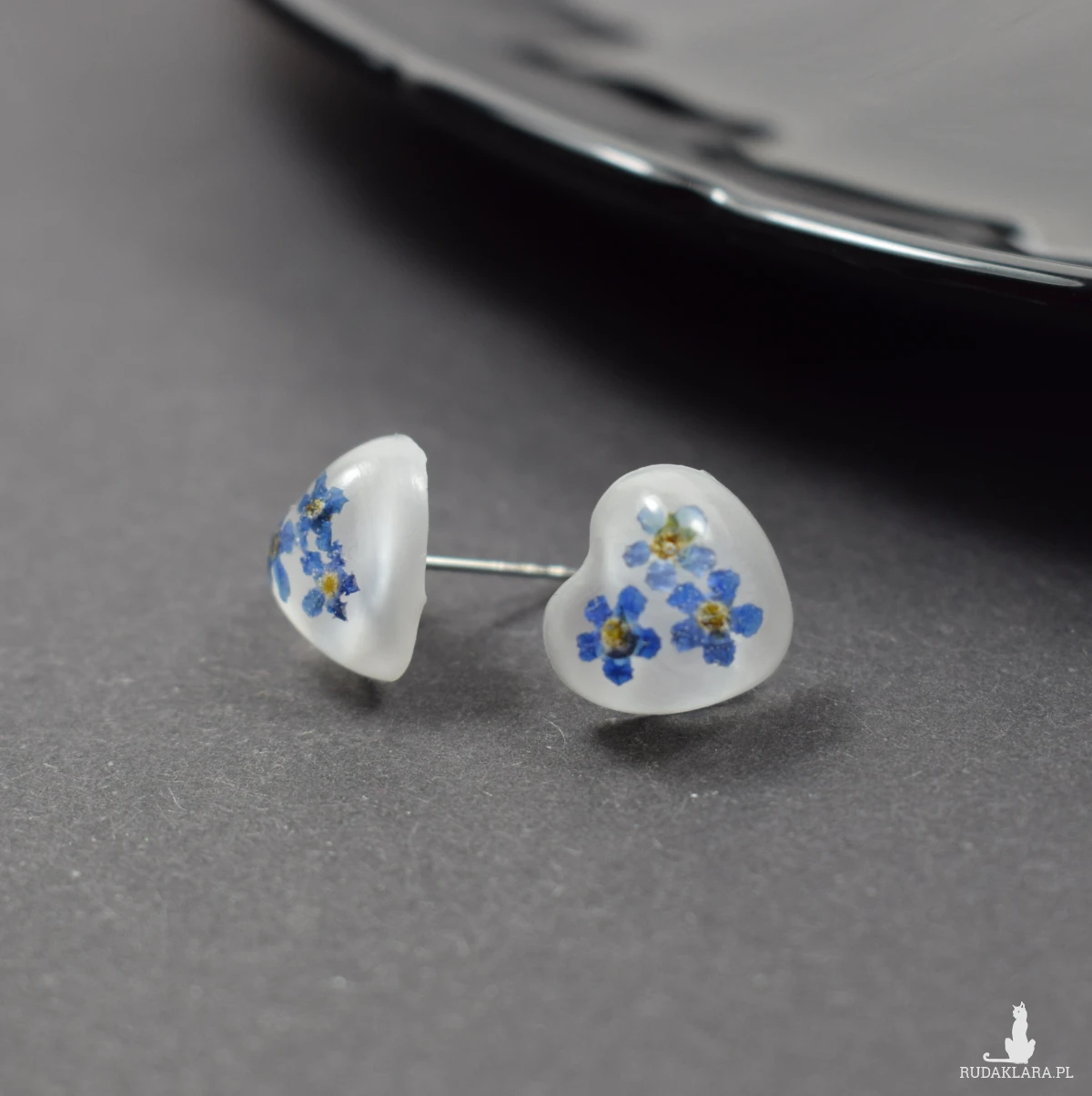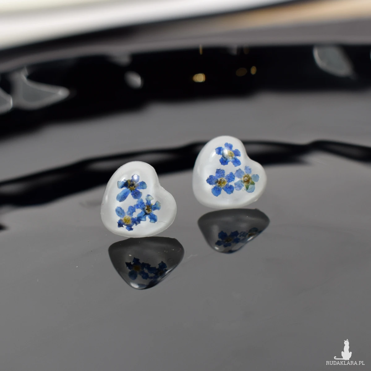Niewielkie kolczyki sztyfty z prawdziwymi niezapominajkami zatopionymi w żywicy.