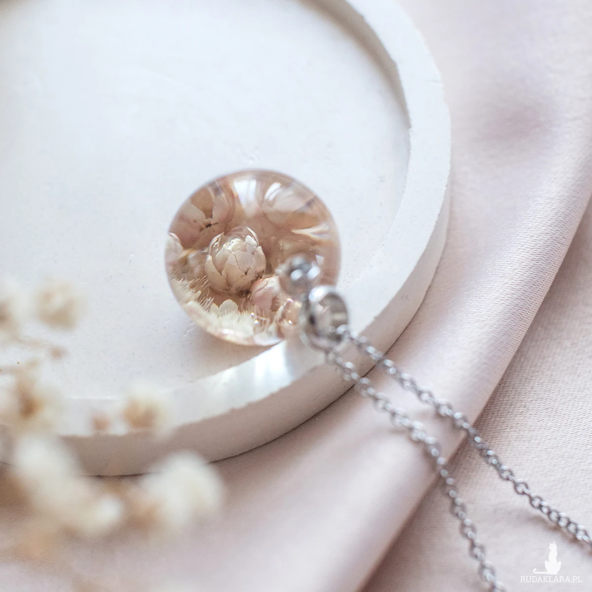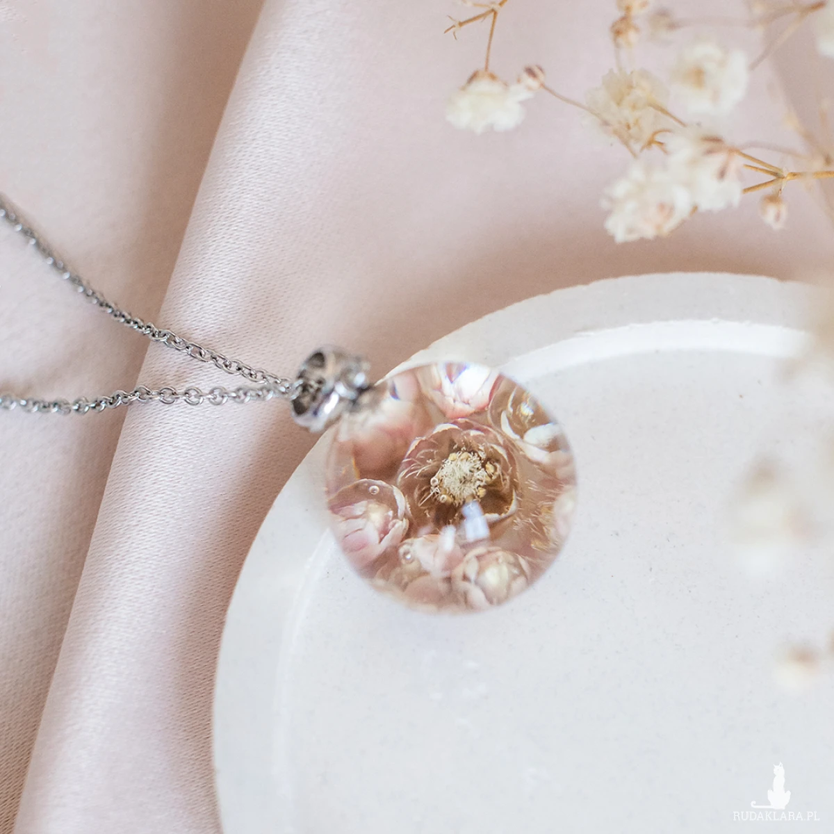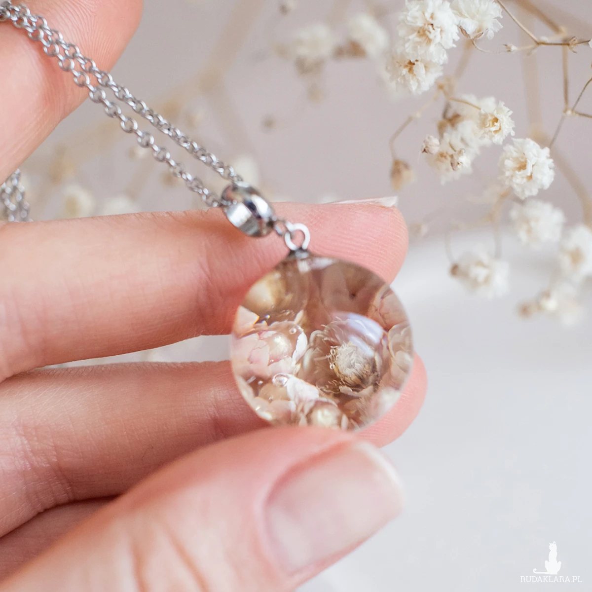 Wisiorek wykonany jest z żywicy epoksydowej z wykorzystaniem suszonych kwiatów. Metalowe elementy to stal nierdzewna szlachetna chirurgiczna.