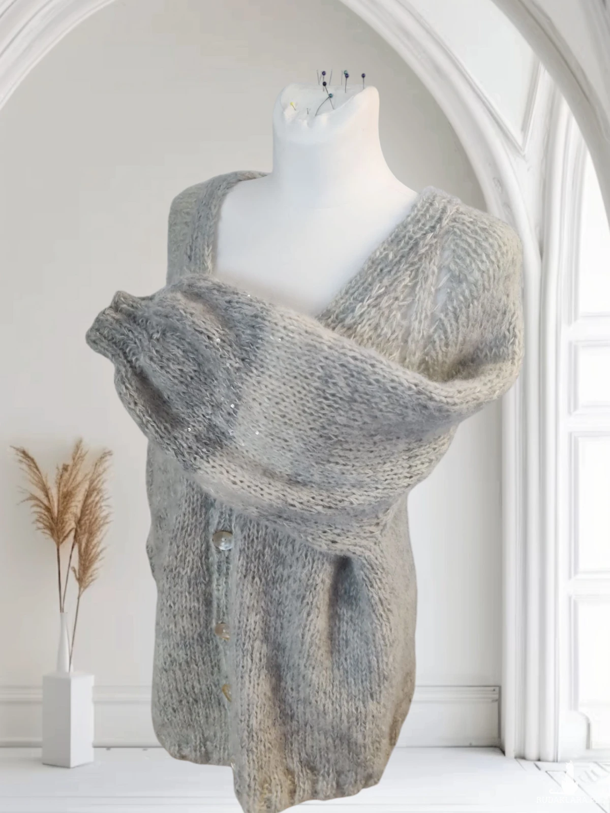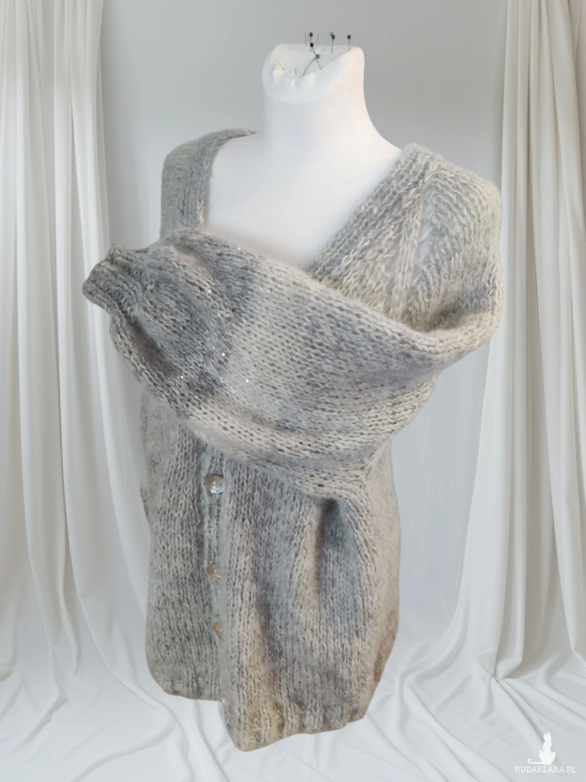 Kardigan damski ręcznie zrobiony z naturalnych włókien wełny i angory i moheru z jedwabiem.