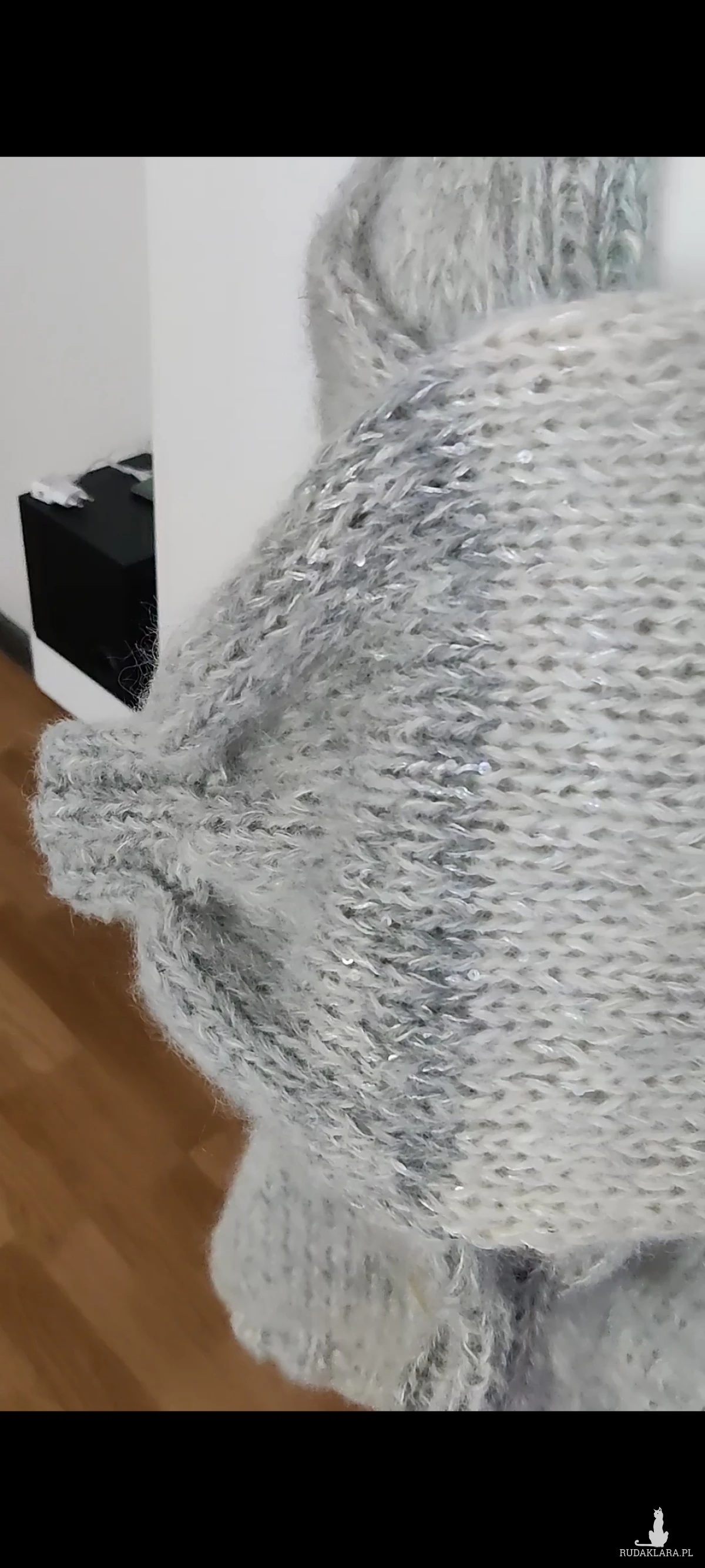 Sweterek w kolorze pięknych szarości ma szerokie rękawy z mankietami.