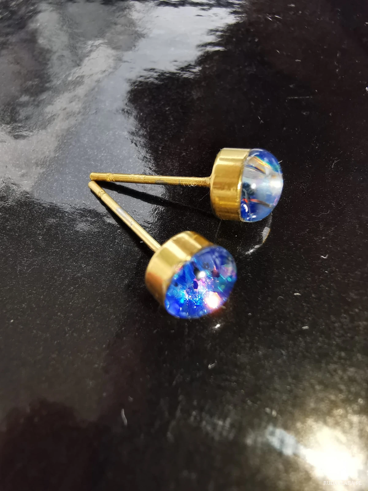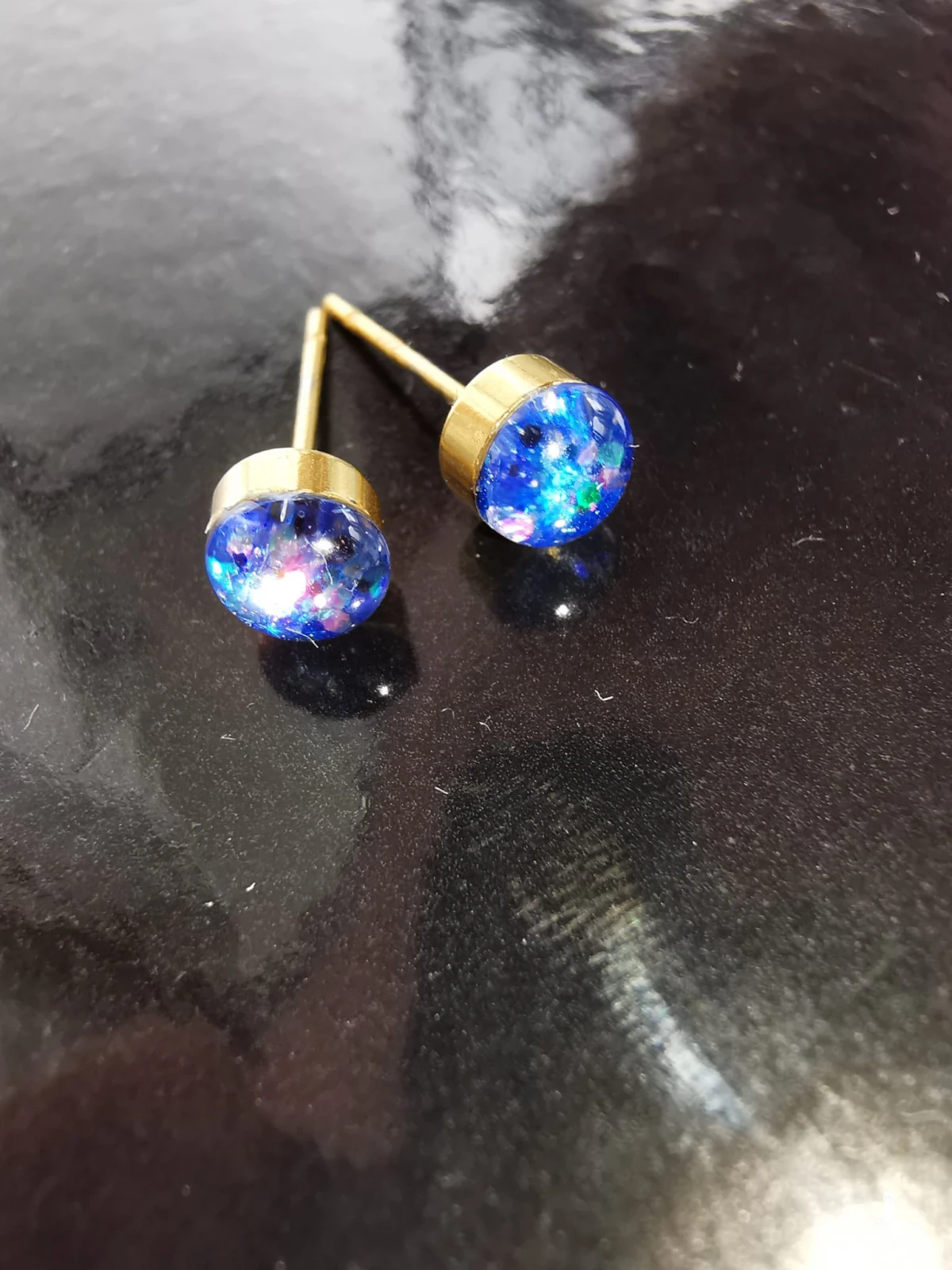Drobne kolczyki stalowe 4mm, ręcznie wypełnione żywicą epoksydową i brokatami. Mocno się mienia różnymi kolorami. Są gustownym dodatkiem do różnych stylizacji.