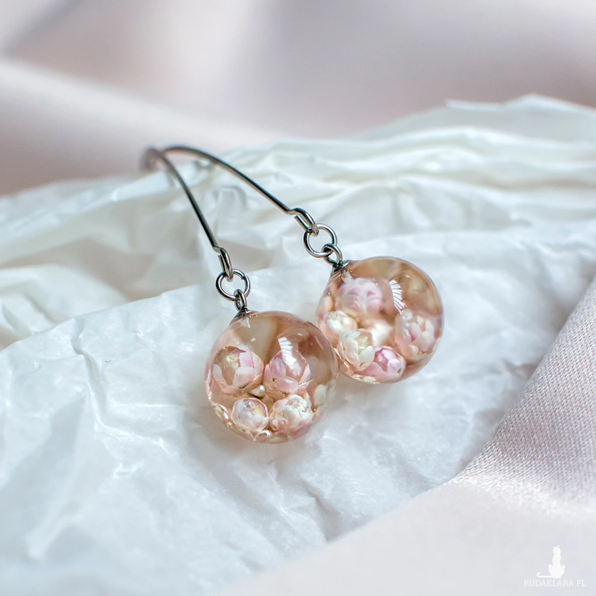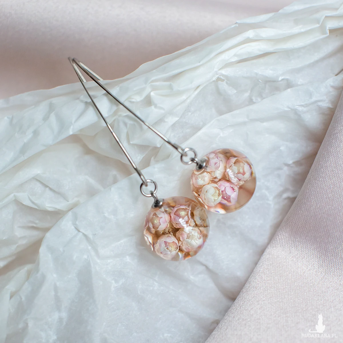 Kolczyki wykonany jest z żywicy epoksydowej z wykorzystaniem suszonych kwiatów. Metalowe elementy to stal nierdzewna szlachetna chirurgiczna.