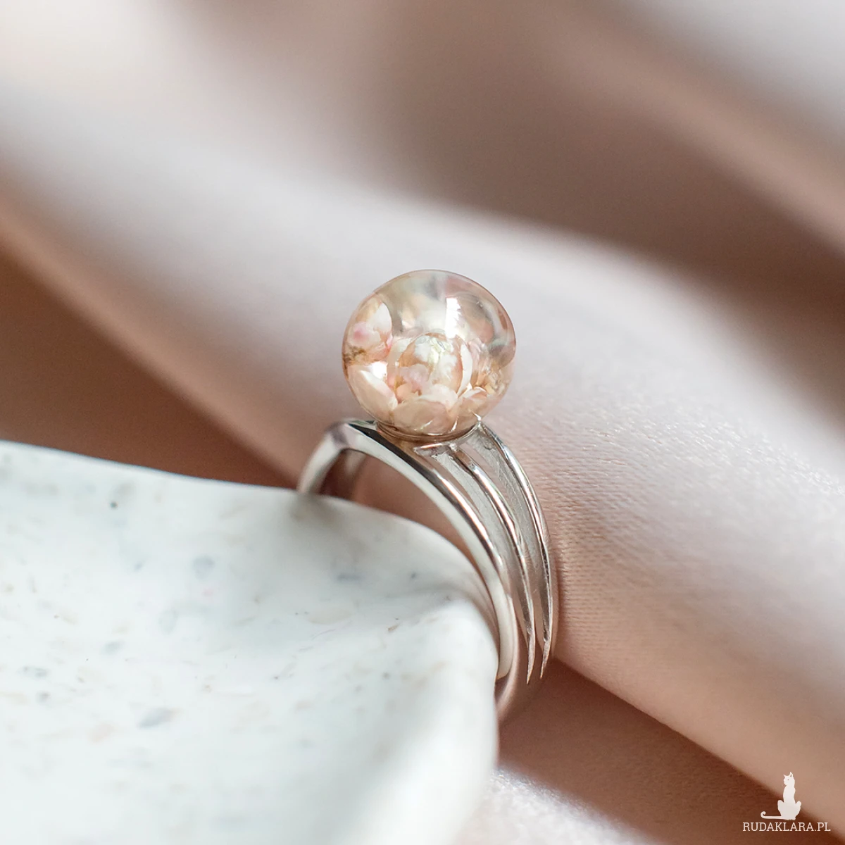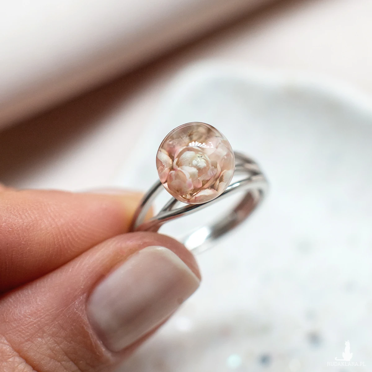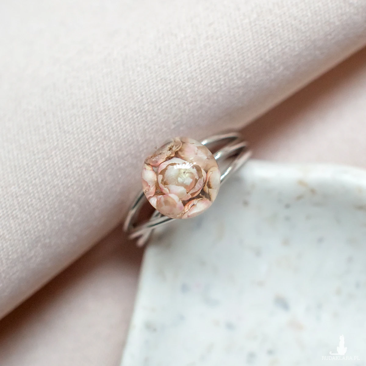 Pierścionek wykonany jest z żywicy epoksydowej z wykorzystaniem suszonych kwiatów. Elementy metalowe są wykonane z mosiądzu i pokryte rodem.
