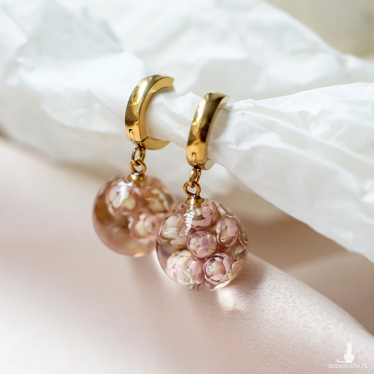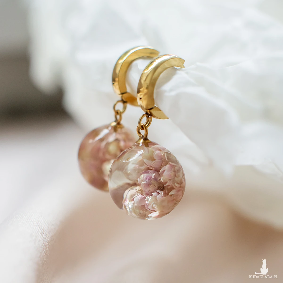 Kolczyki wykonany jest z żywicy epoksydowej z wykorzystaniem suszonych kwiatów. Metalowe elementy to stal nierdzewna szlachetna chirurgiczna.