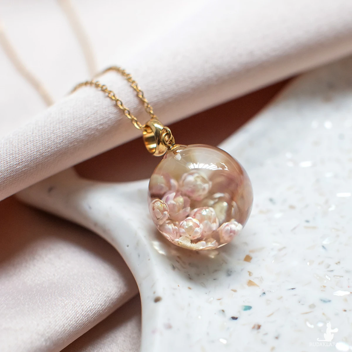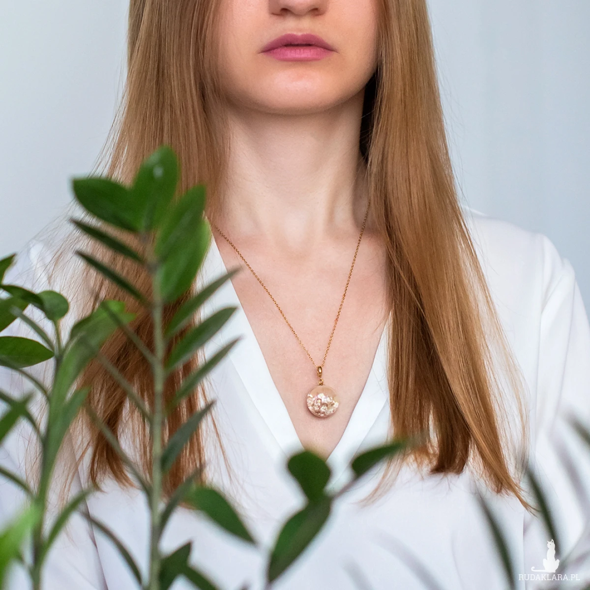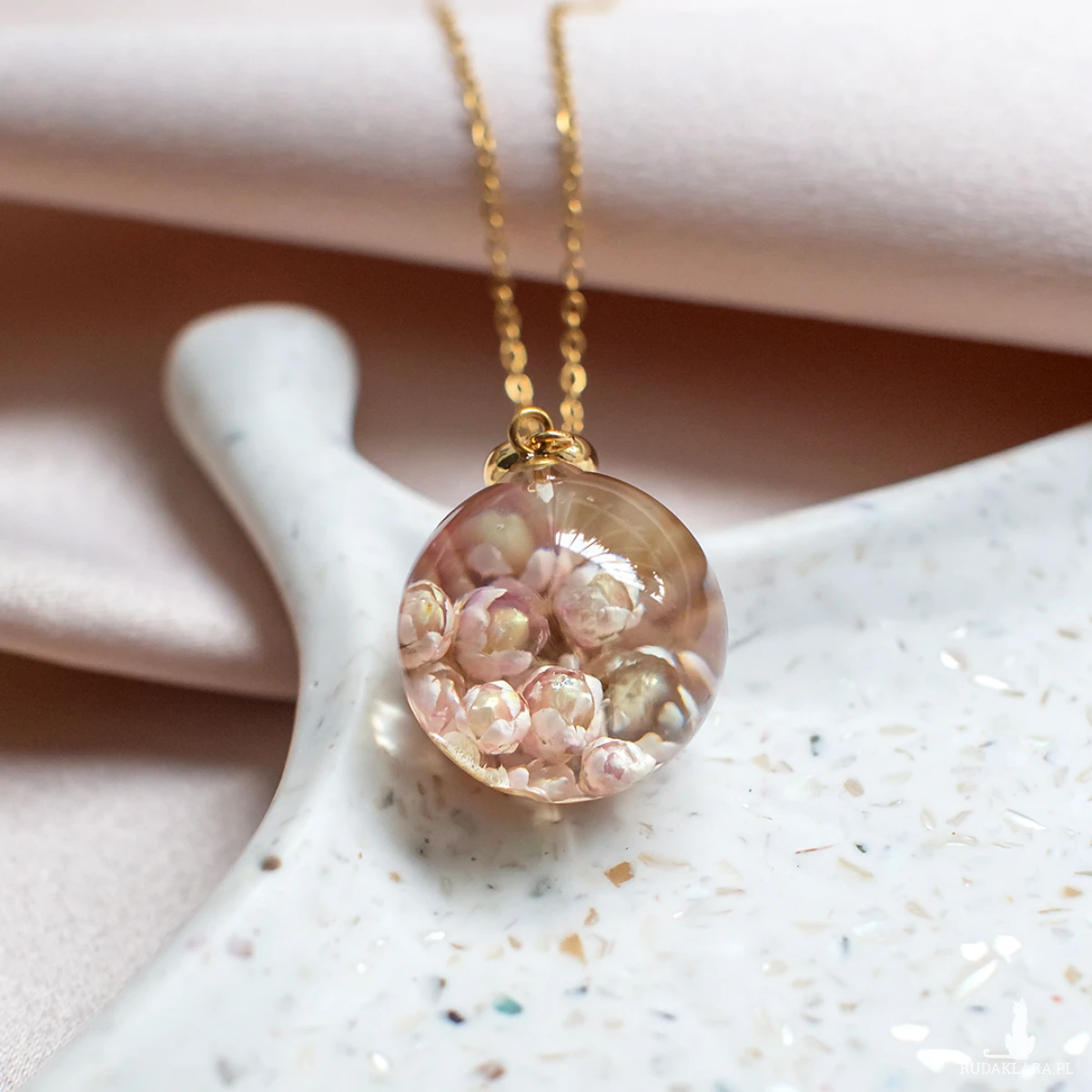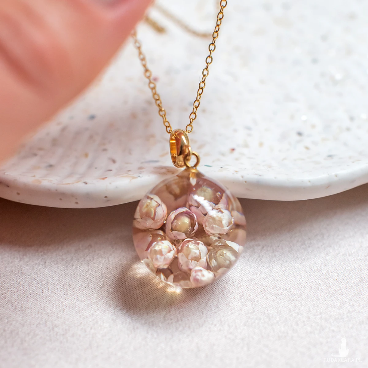 Wisiorek wykonany jest z żywicy epoksydowej z wykorzystaniem suszonych kwiatów. Metalowe elementy to stal nierdzewna szlachetna chirurgiczna.