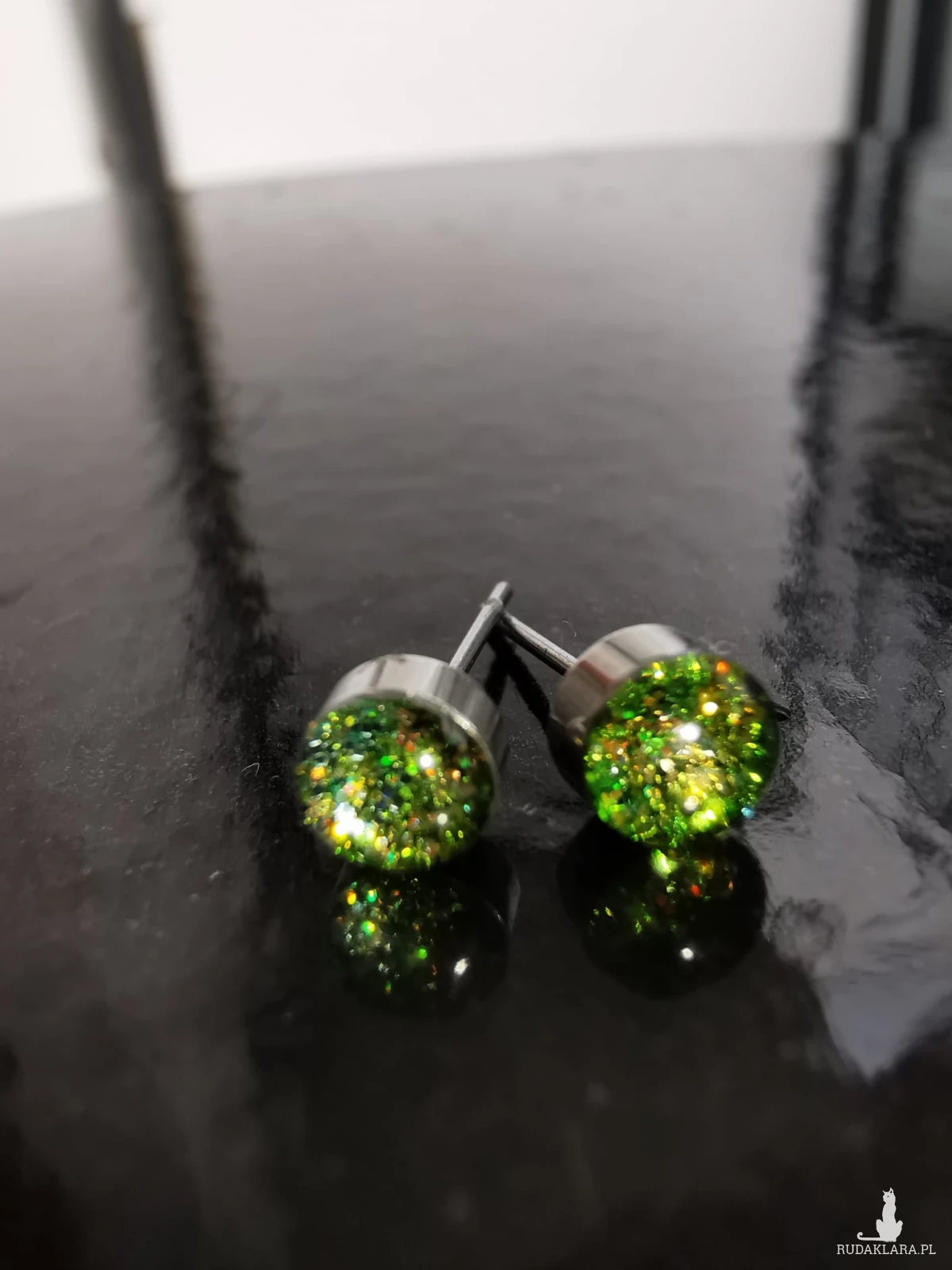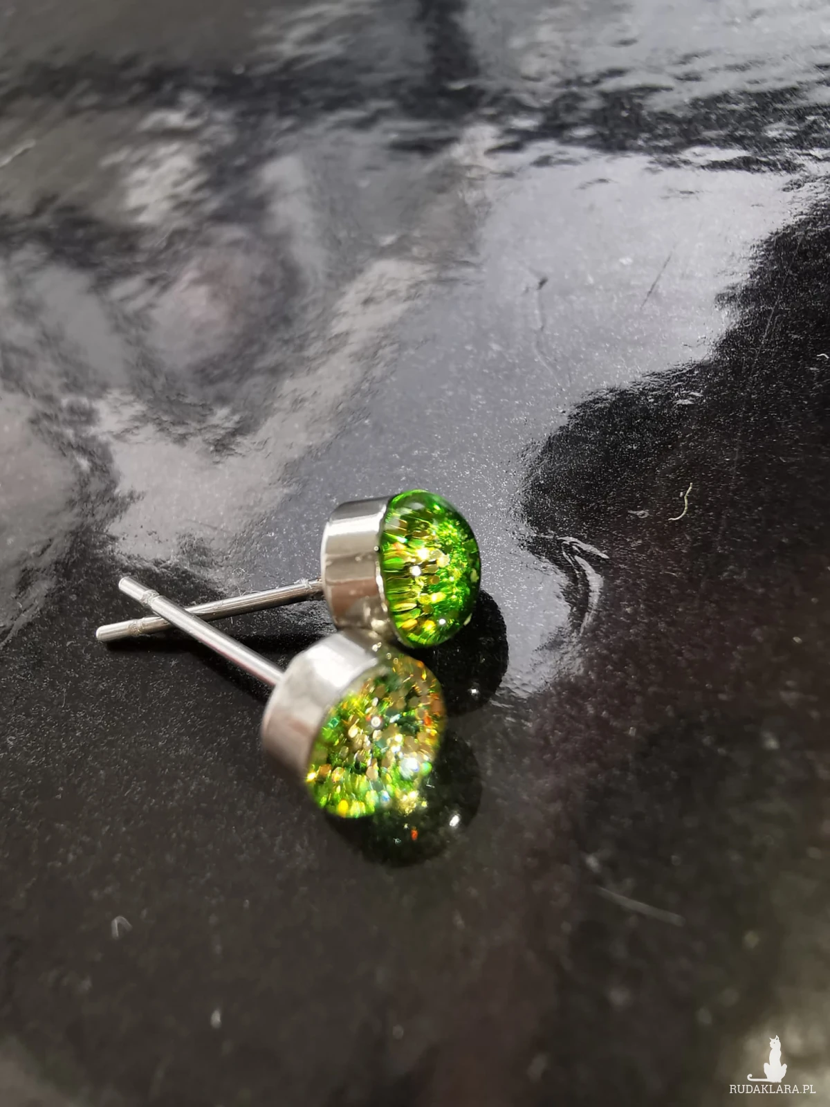 Drobne kolczyki stalowe 4mm, ręcznie wypełniona biżuteria z żywicy epoksydowej i brokatami. Mocno się mienia różnymi kolorami. Są gustownym dodatkiem do różnych stylizacji.