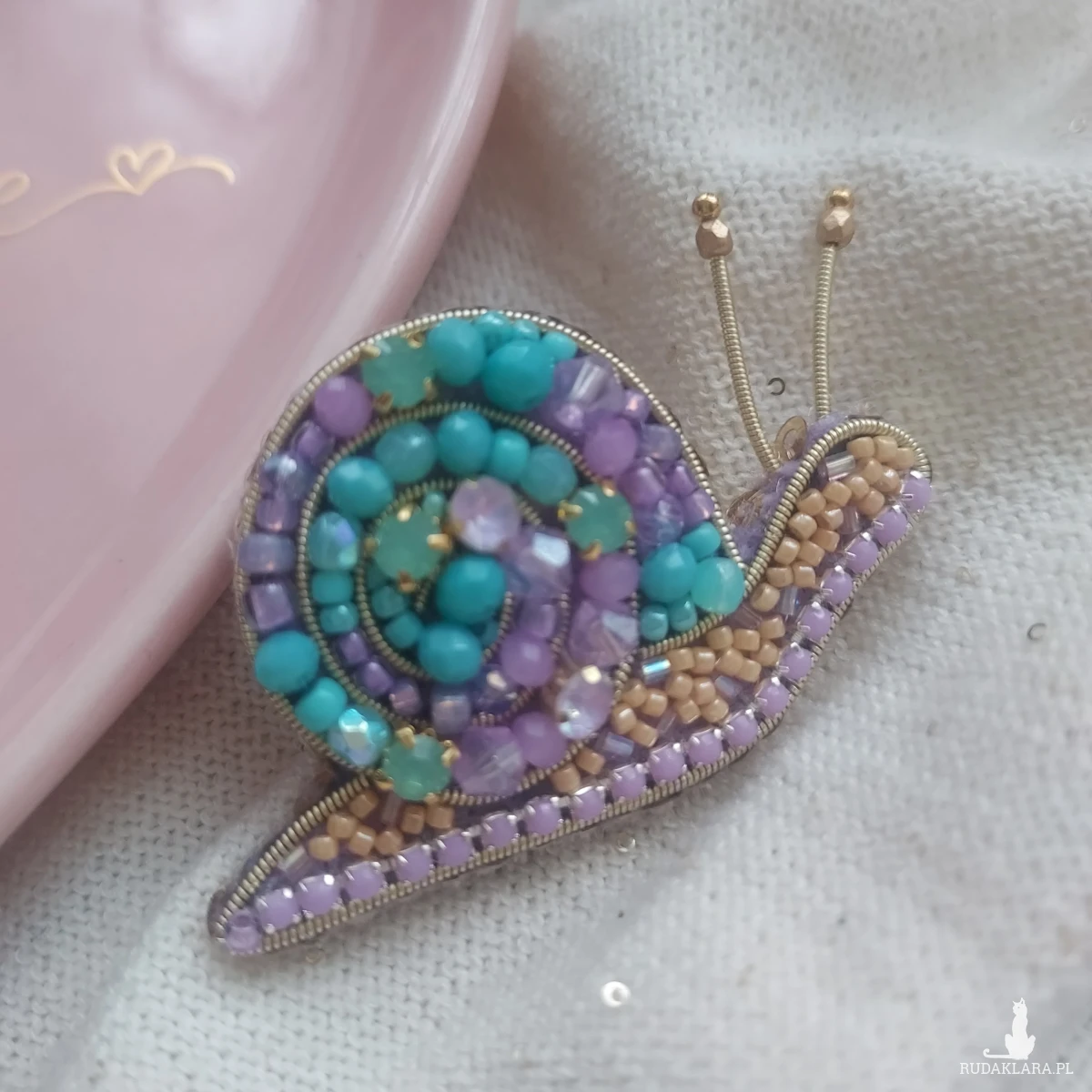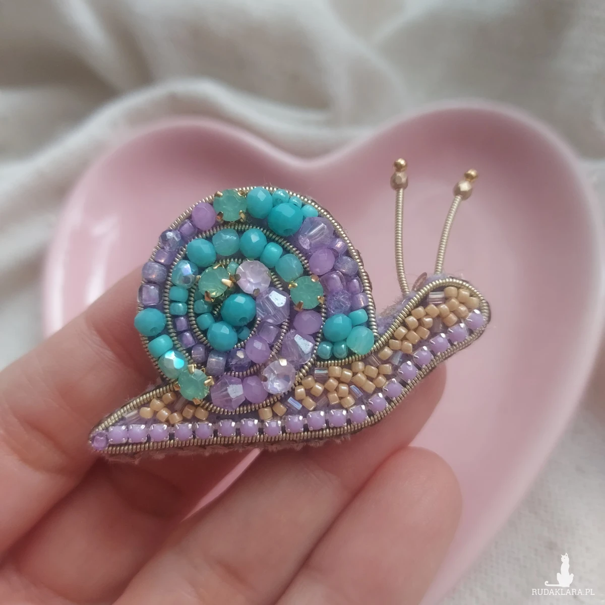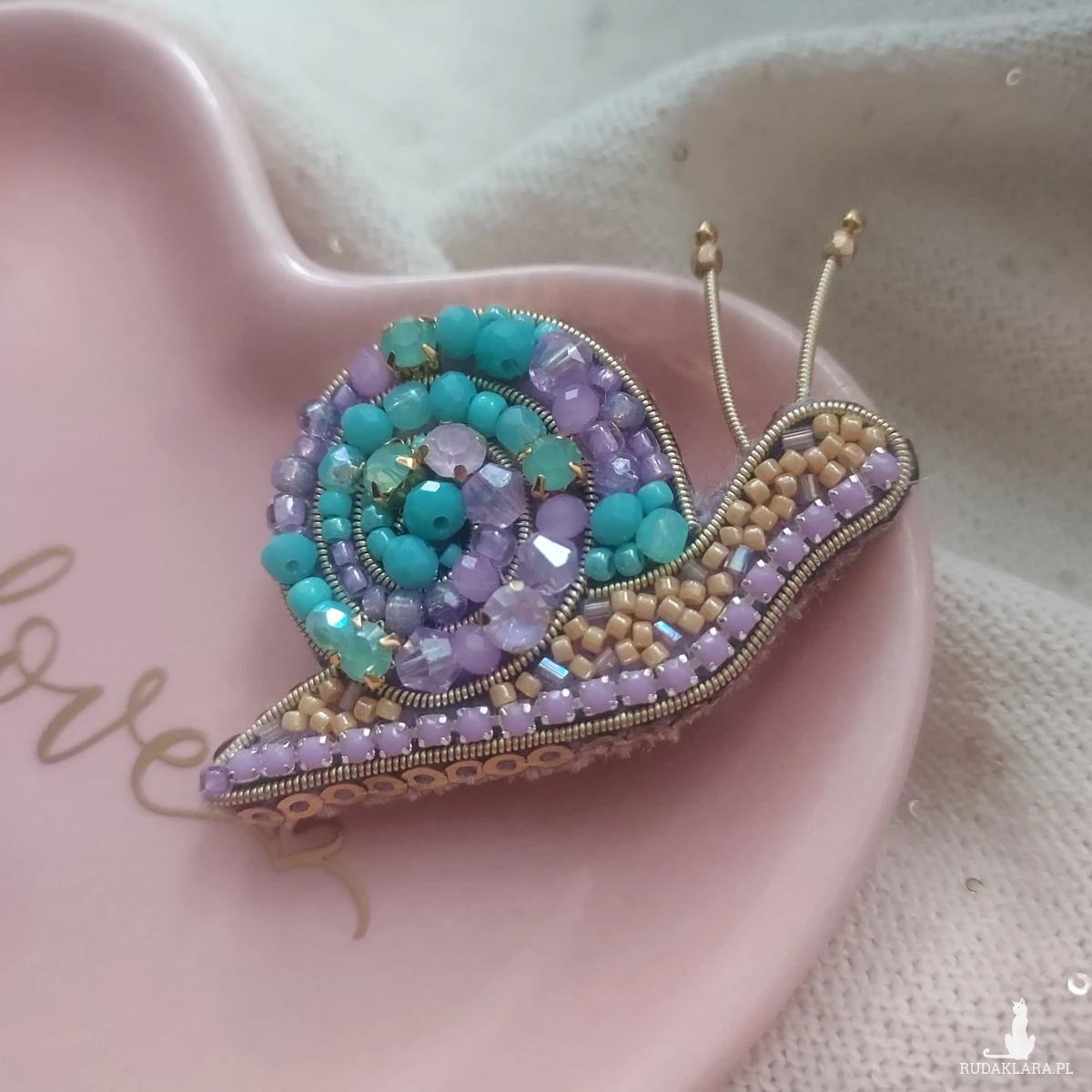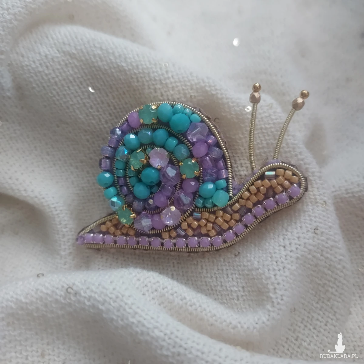 Wyjątkowa wiosenno-letnia broszka ślimak w powstała techniką haftu koralikowego. To doskonały dodatek biżuteryjny dla miłośniczek fioletu i turkusu.