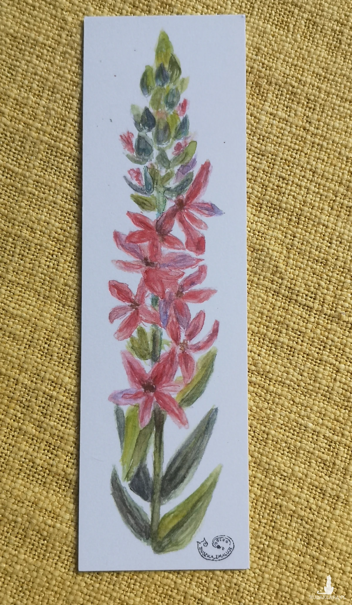 Drukowana zakładka do książki o wymiarach 15 x 4,5 cm. Dekoracja przedstawiająca kwitnącą krwawnicę została specjalnie zaprojektowana dla ozdoby tego przedmiotu i jest reprodukcją mojej akwareli namalowanej na podstawie sfotografowanej przeze mnie rośliny. Kolorystyka z dominującymi odcieniami zieleni i różu w oryginale może nieznacznie odbiegać od przedstawionej na fotografii. Odwrotna strona zakładki gładka.