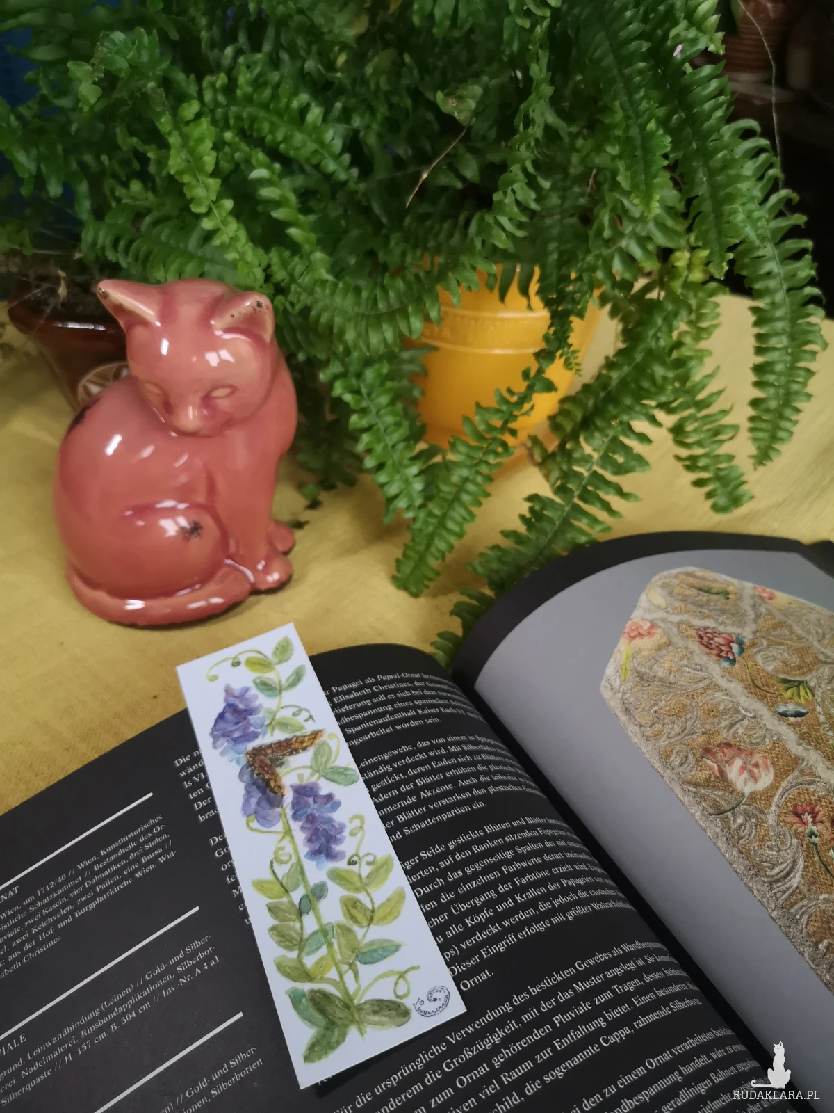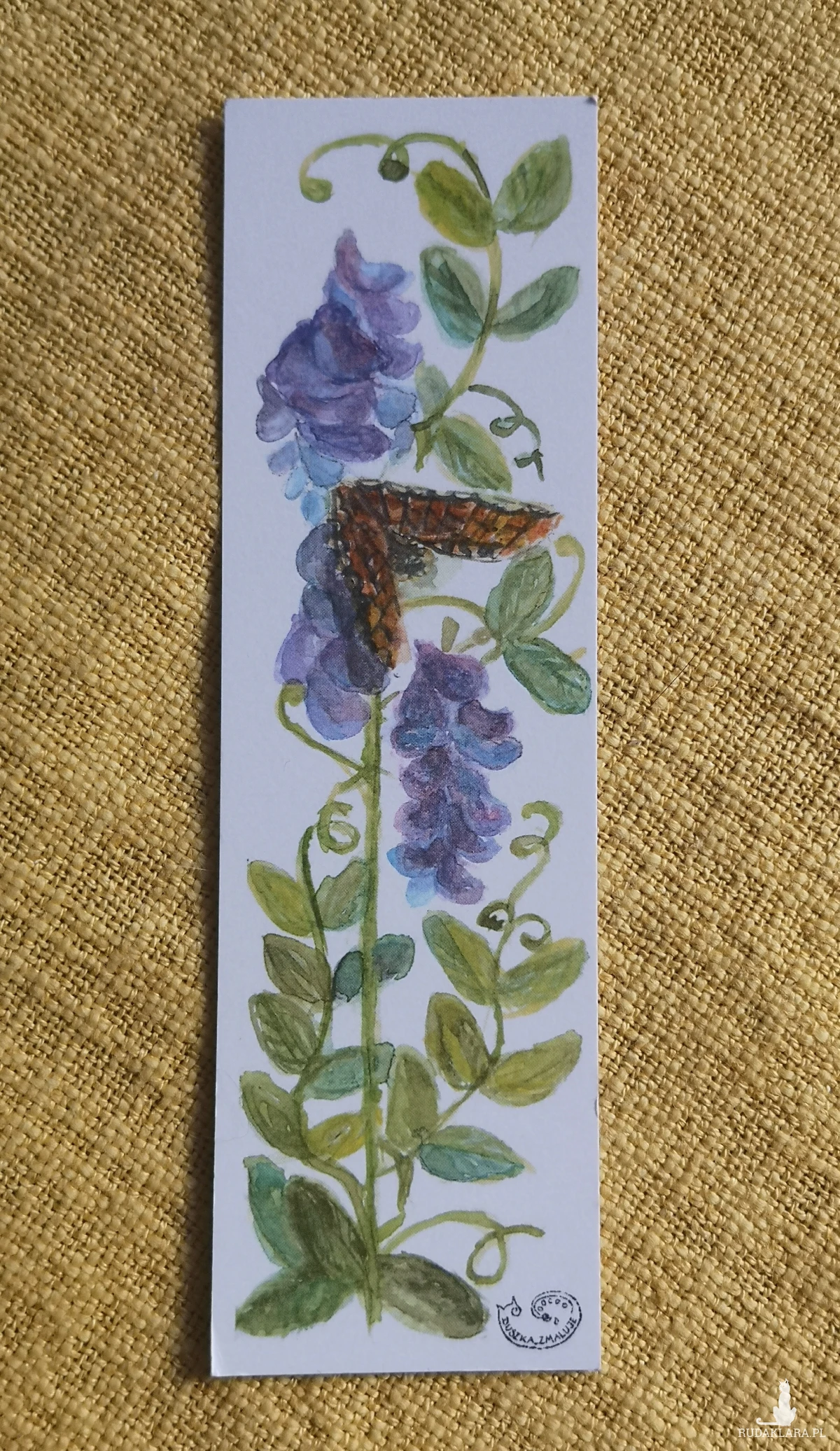 Drukowana zakładka do książki o wymiarach 15 x 4,5 cm. Dekoracja przedstawiająca kwitnącą wykę, na której przysiadł motyl, została specjalnie zaprojektowana dla ozdoby tego przedmiotu i jest reprodukcją mojej akwareli namalowanej na podstawie sfotografowanej przeze mnie rośliny. Kolorystyka z dominującymi odcieniami zieleni, fioletu i pomarańczu w oryginale może nieznacznie odbiegać od przedstawionej na fotografii. Odwrotna strona zakładki gładka.