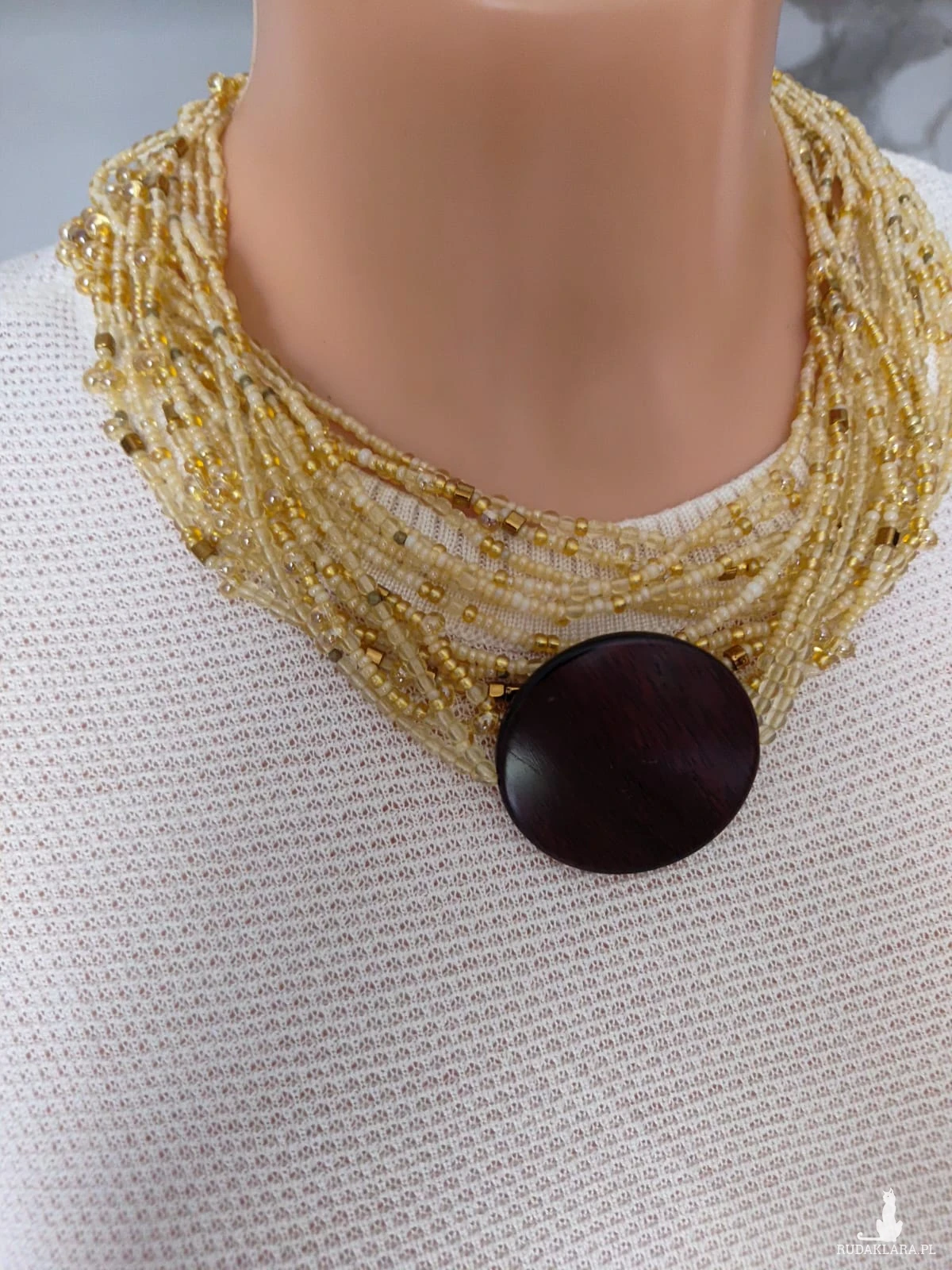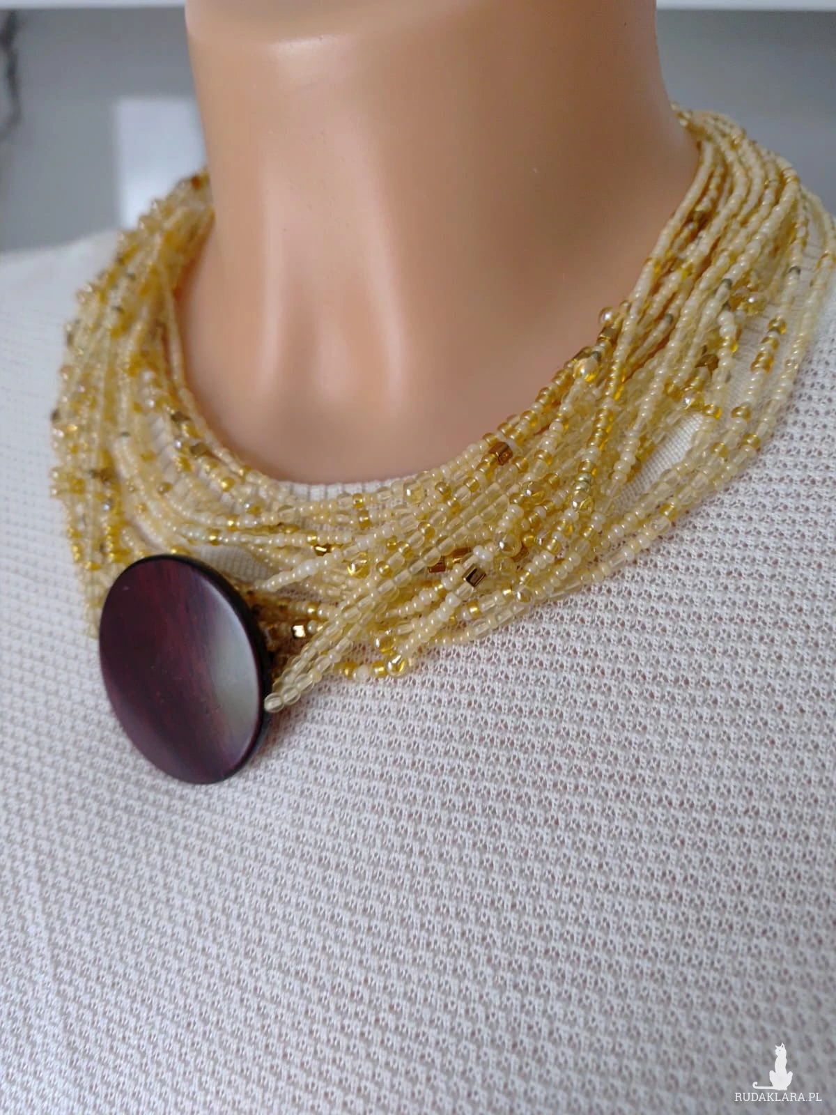 Naszyjnik z koralikow drobnych 2 -4 mm, wplecione kropelki w kolorze miodowym. Czternaście sznurków ze zlotymi kosteczkami i drobnymi kuleczkami hematytu. Ozdobą jest dysk imitujący krążek drewna. Pieknie się prezentuje na dekolcie. Naszyjnik jest krótki. Końcówki metalowe, zapięcie ze stali nierdzewnej. Objętość 44 cm