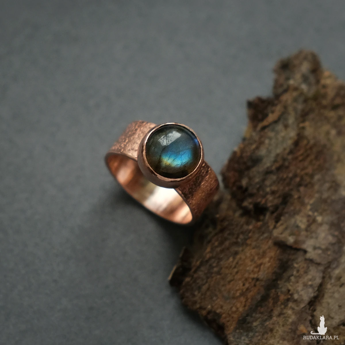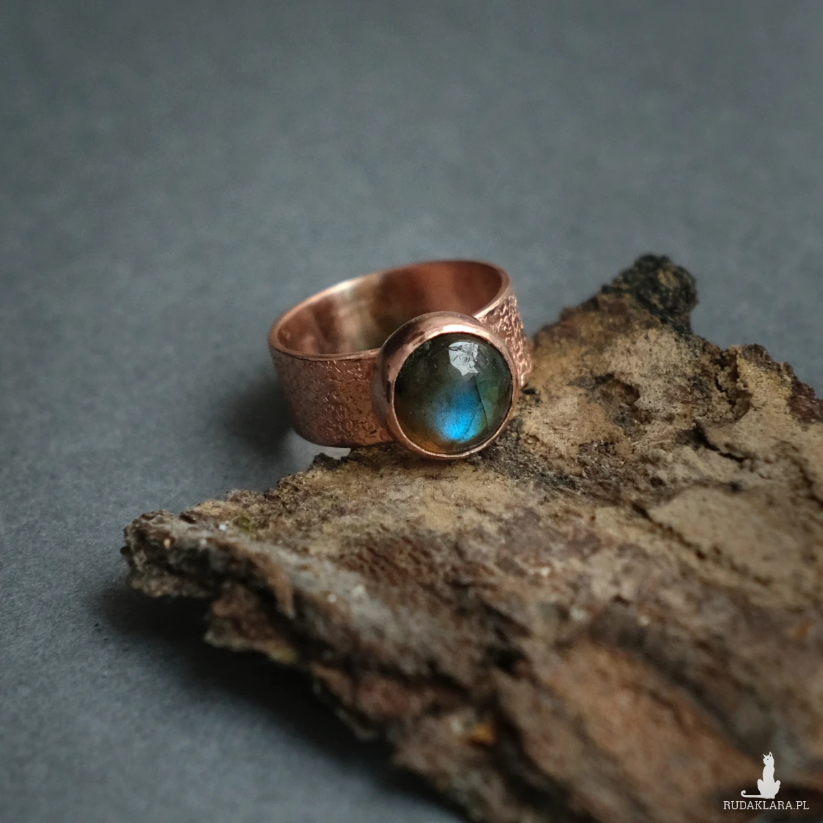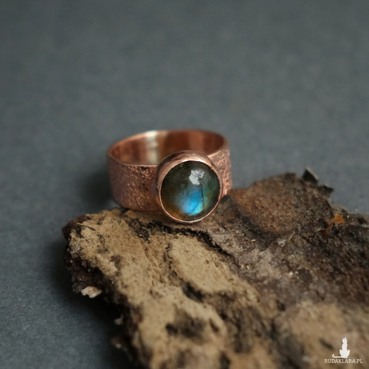 Pierścionek na szerokiej obrączce mieści w sobie labradoryt o pięknej błękitnej iryzacji. Pierścionek został wykonany ręcznie z czystej miedzi, średnica kamienia 10 mm.