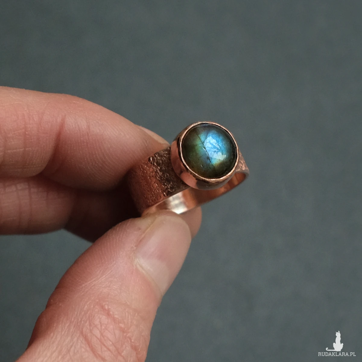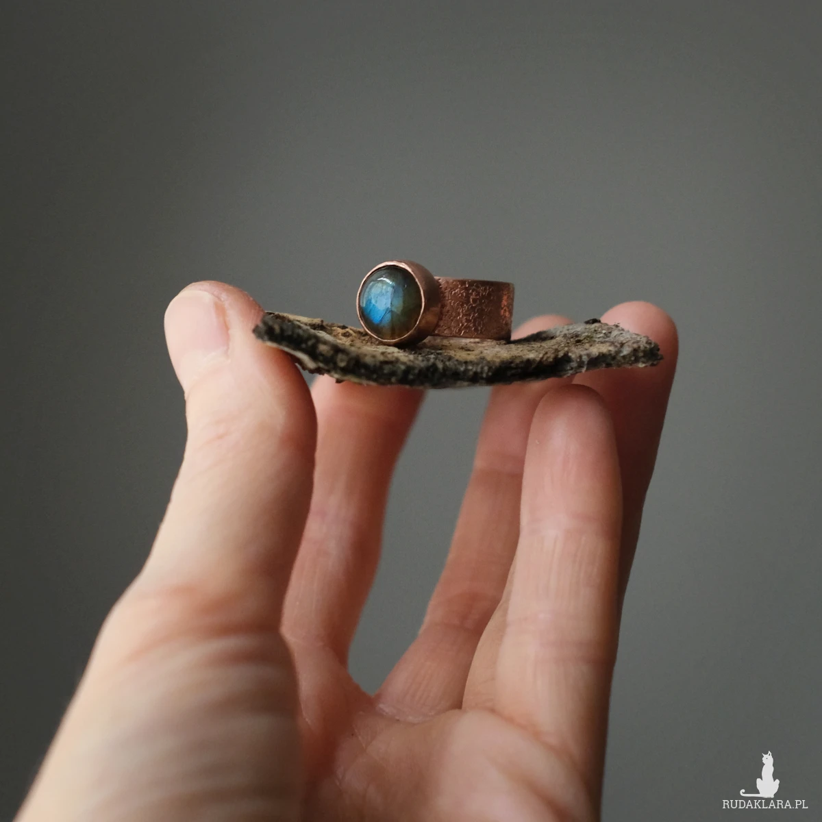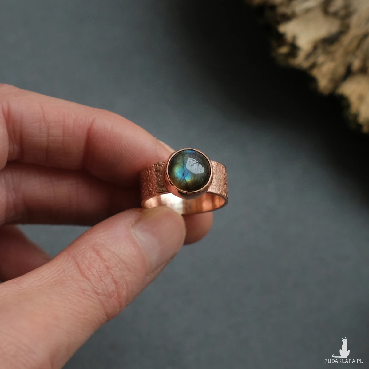 Pierścionek na szerokiej obrączce mieści w sobie labradoryt o pięknej błękitnej iryzacji. Pierścionek został wykonany ręcznie z czystej miedzi, średnica kamienia 10 mm.