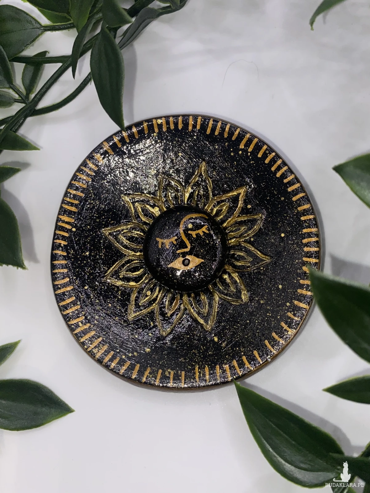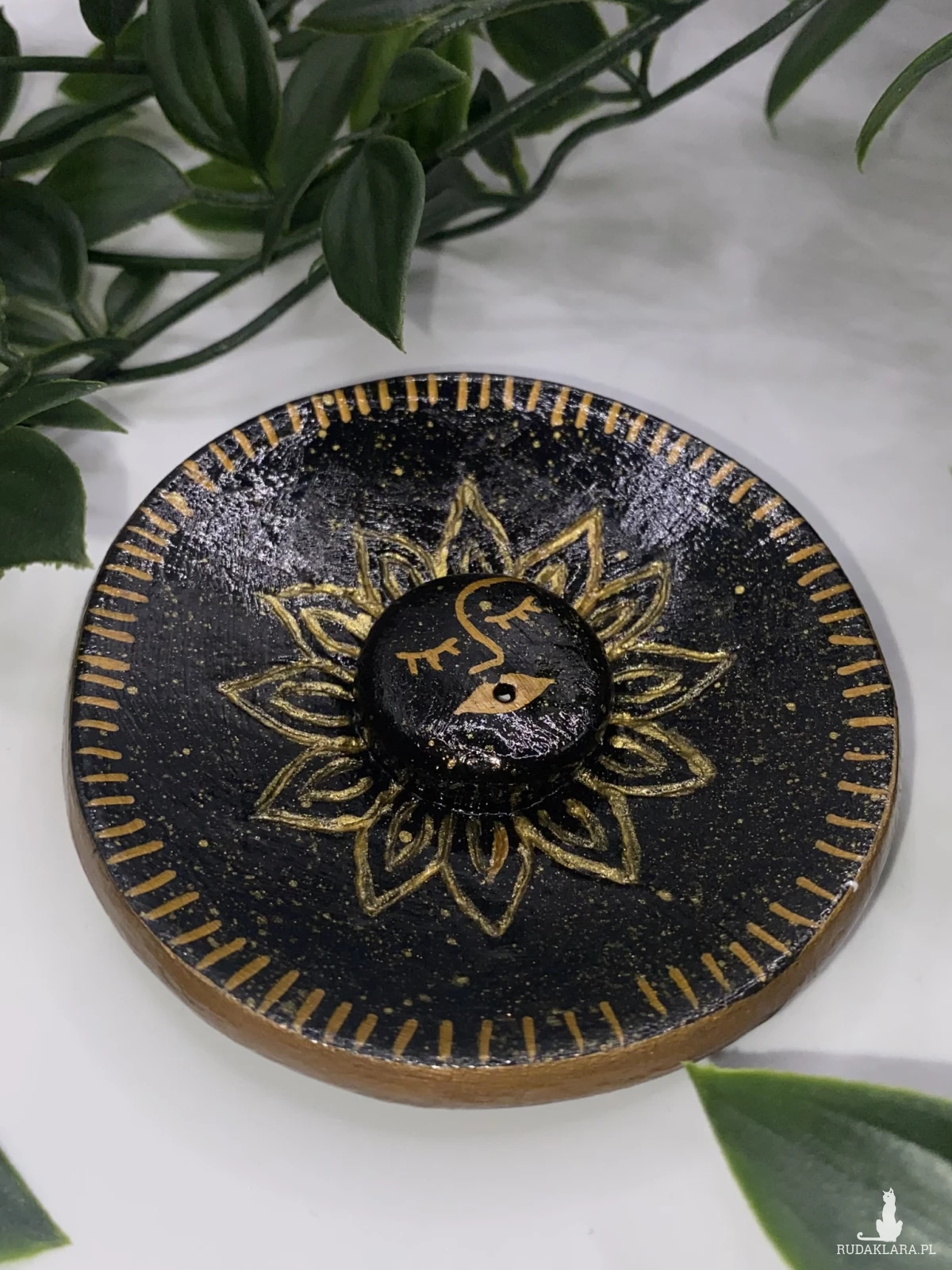 Podstawka z miejscem na kadzidło. Wykonana z gliny typu air dry clay. Pomalowana farbami akrylowymi i zabezpieczona specjalnym werniksem i lakierem.