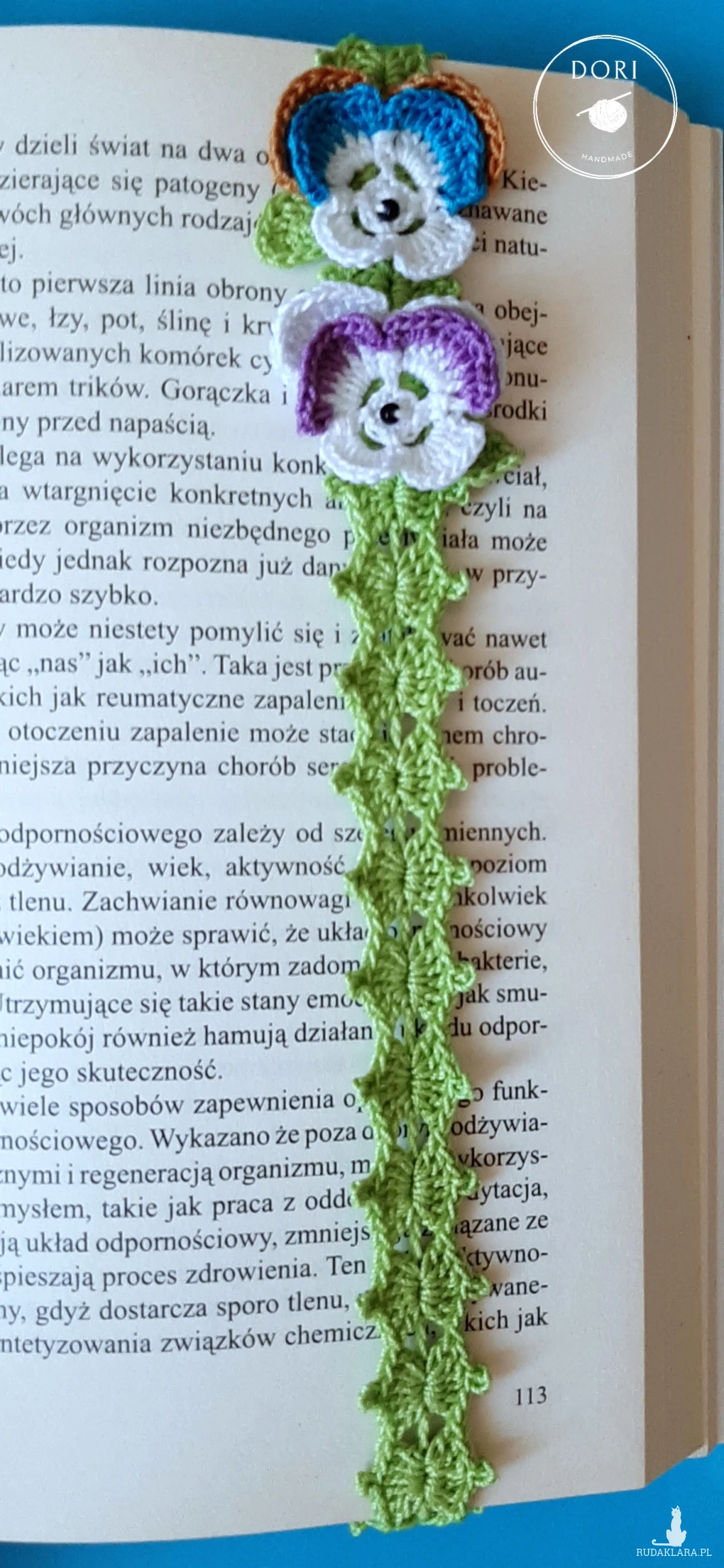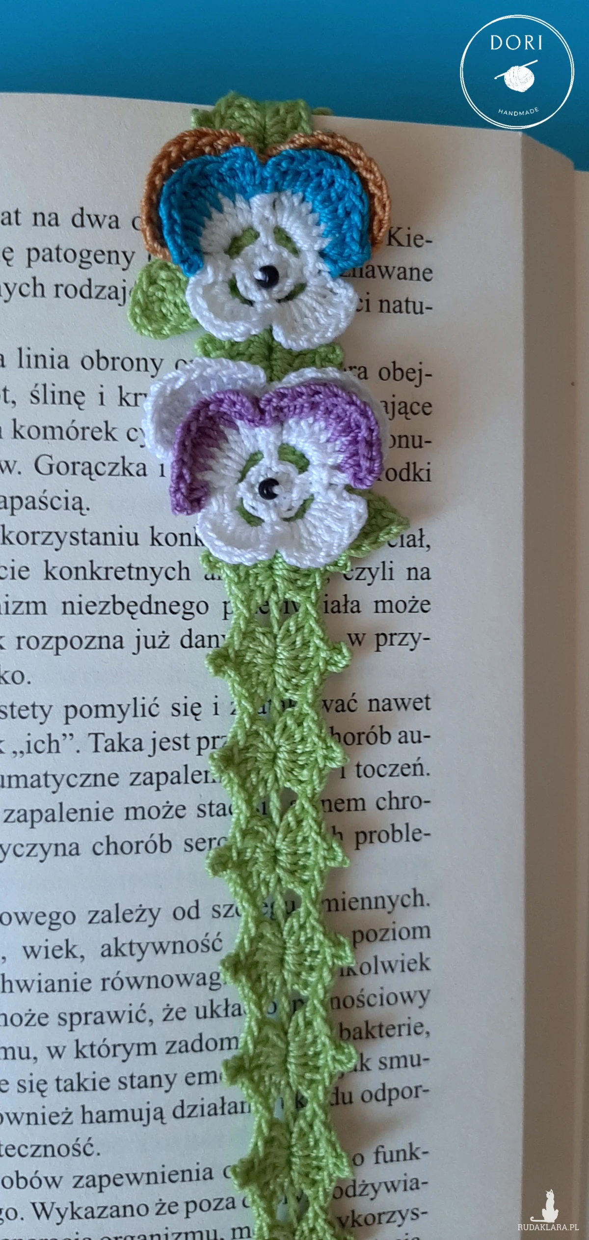 W takim razie mam coś specjalnego dla Ciebie moją ręcznie robioną szydełkową zakładkę z motywem bratków🌸.