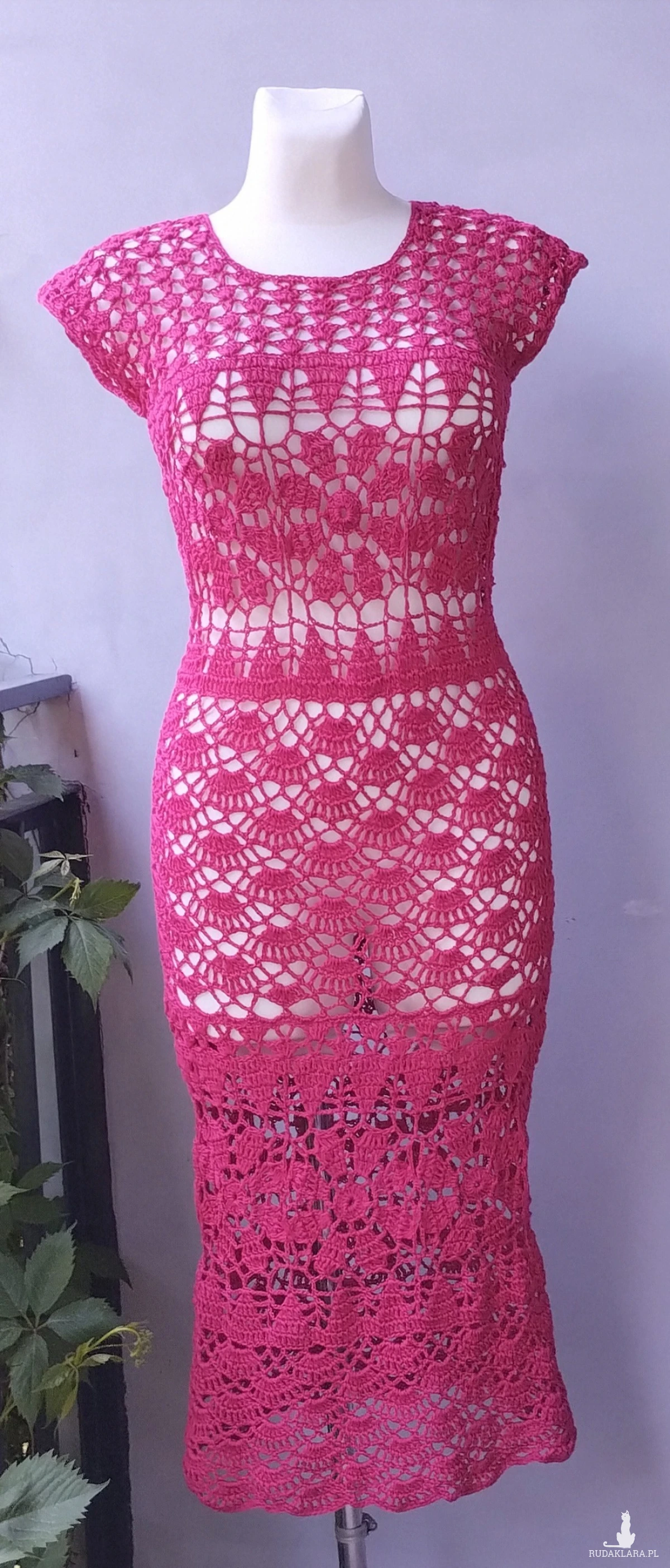 Sukienka zrobiona ręcznie na szydełku z nitki w składzie 100% bawełna w kolorze malinowej czerwieni. Rozmiar 38-40,