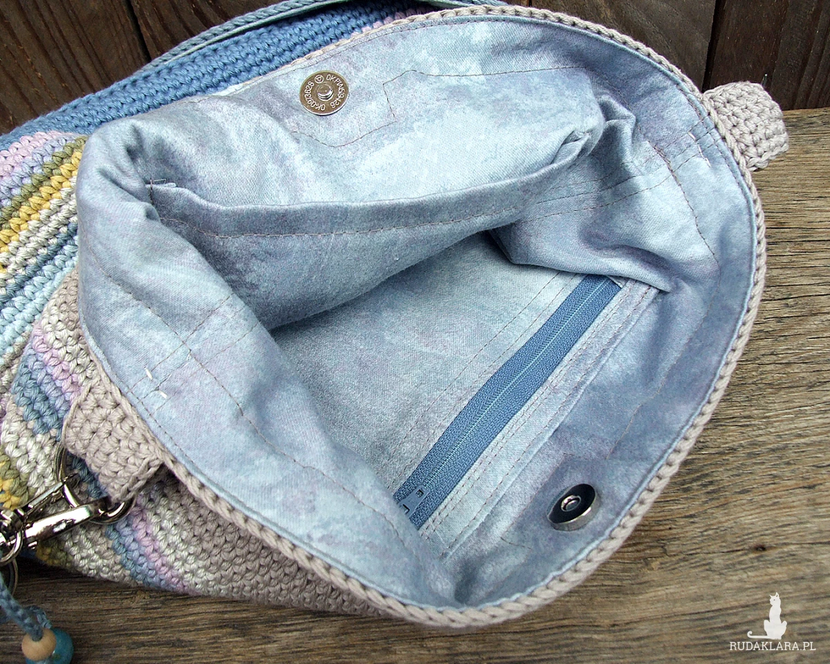 Pasek szerokość 4 cm, wykonany także na szydełku i podszyty niebieskim materiałem, połączony z torebką srebrnymi karabińczykami, pasek można odpinać.