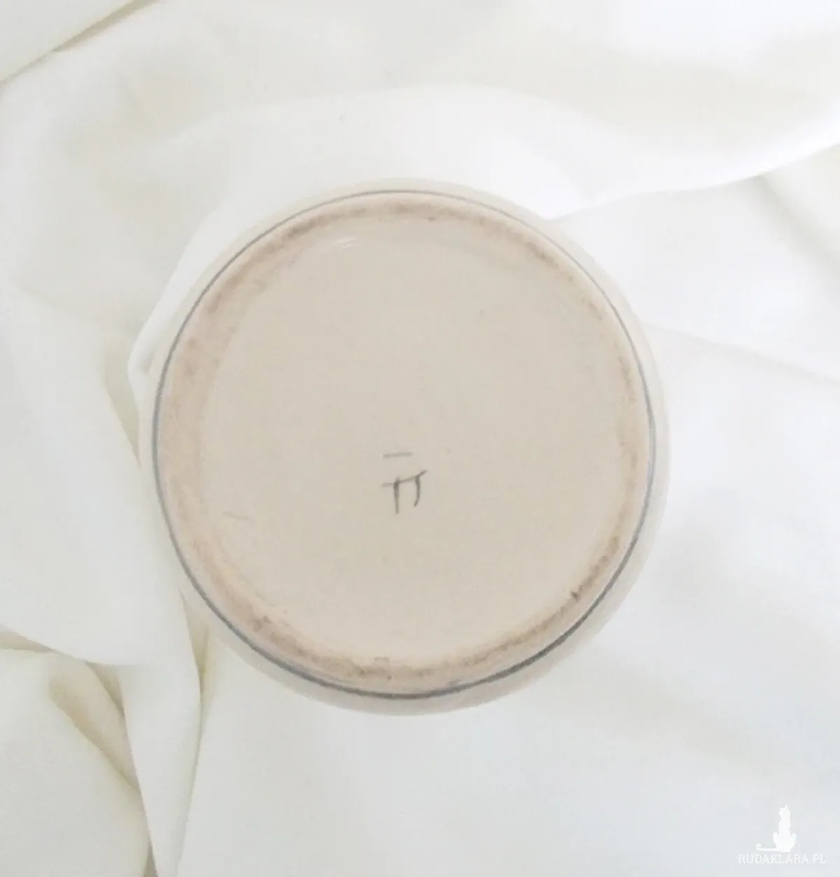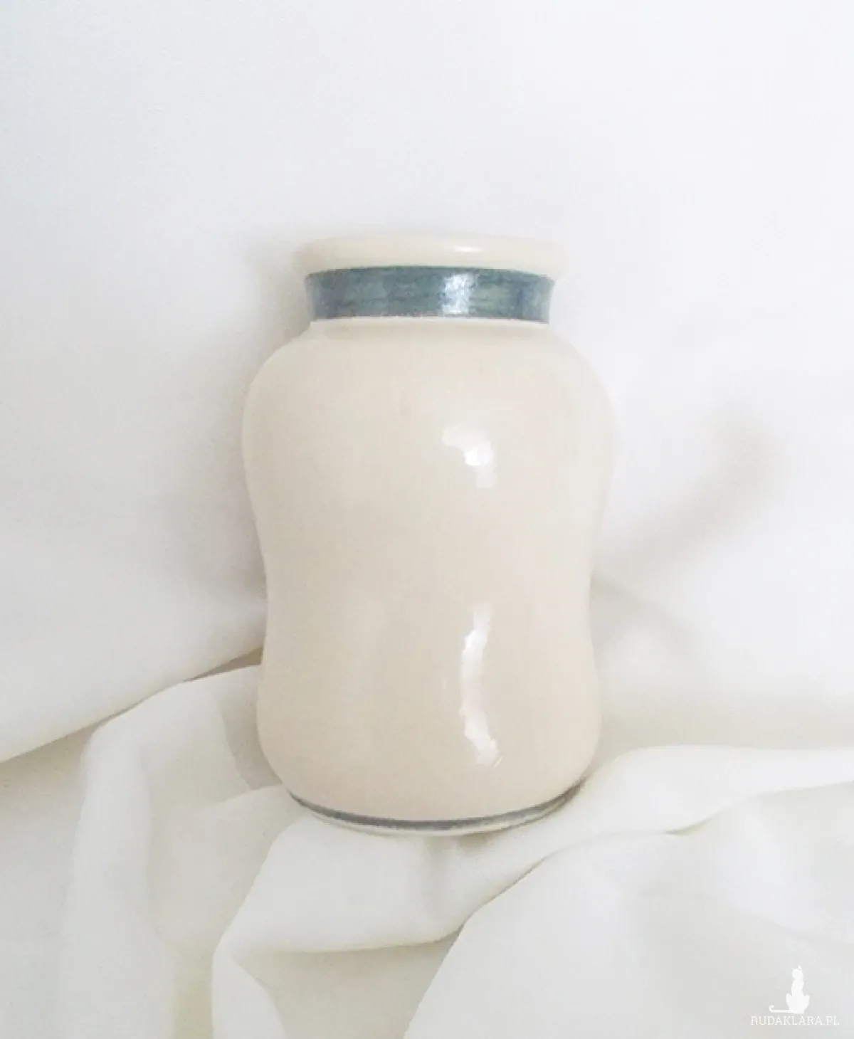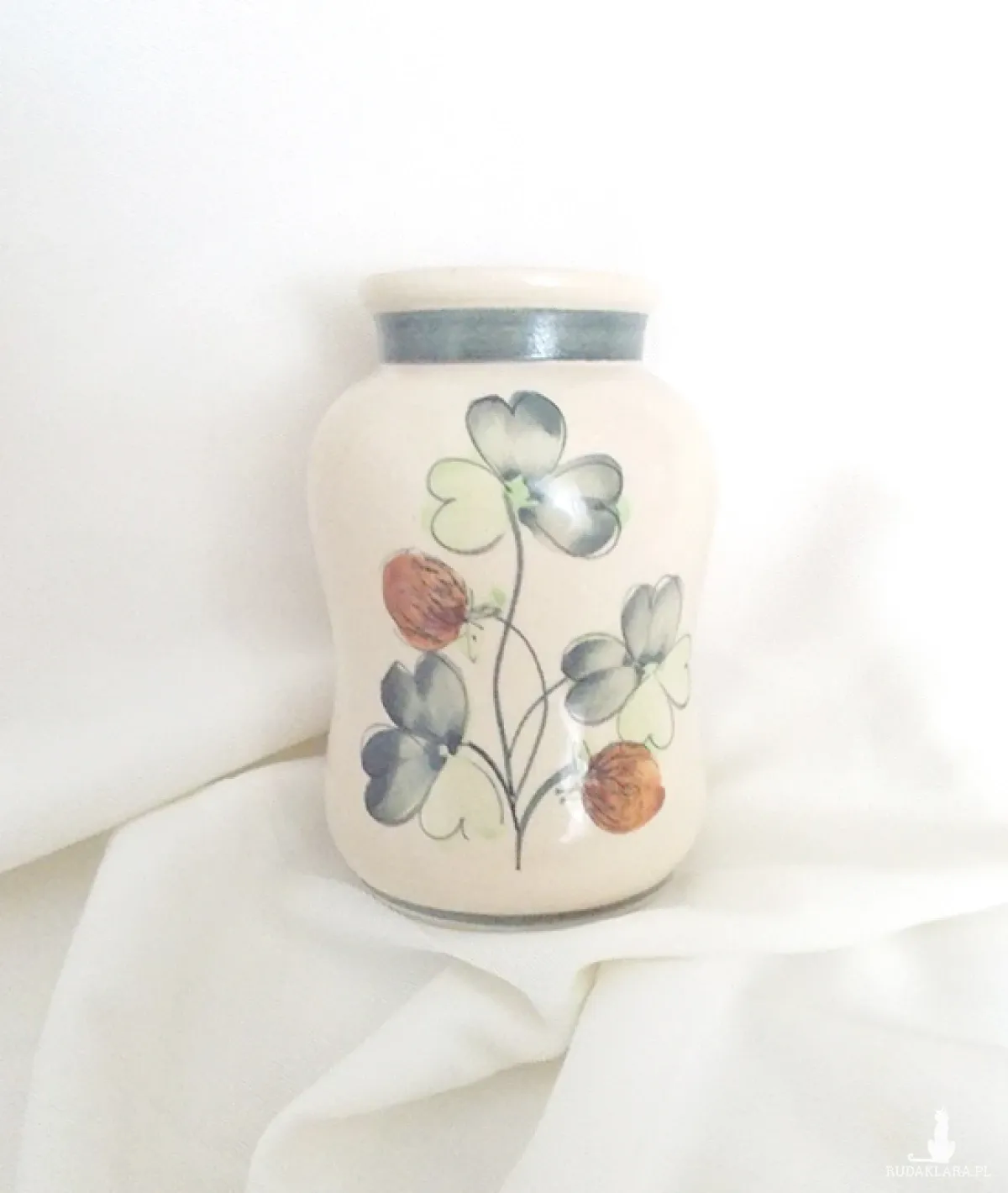 Retro, ręcznie malowany, fajansowy pojemnik na sól lub cukier lub wazonik. Przedmiot z czasów PRL lata 80, Włocławek. Stan bdb. Wymiary: wysokość 12,5 cm, średnica u góry 5,5 cm, dół 6,5 cm. Przedmiot zarówno do dekoracji domu, jak i do użytku. Zastosowanie według własnego uznania.