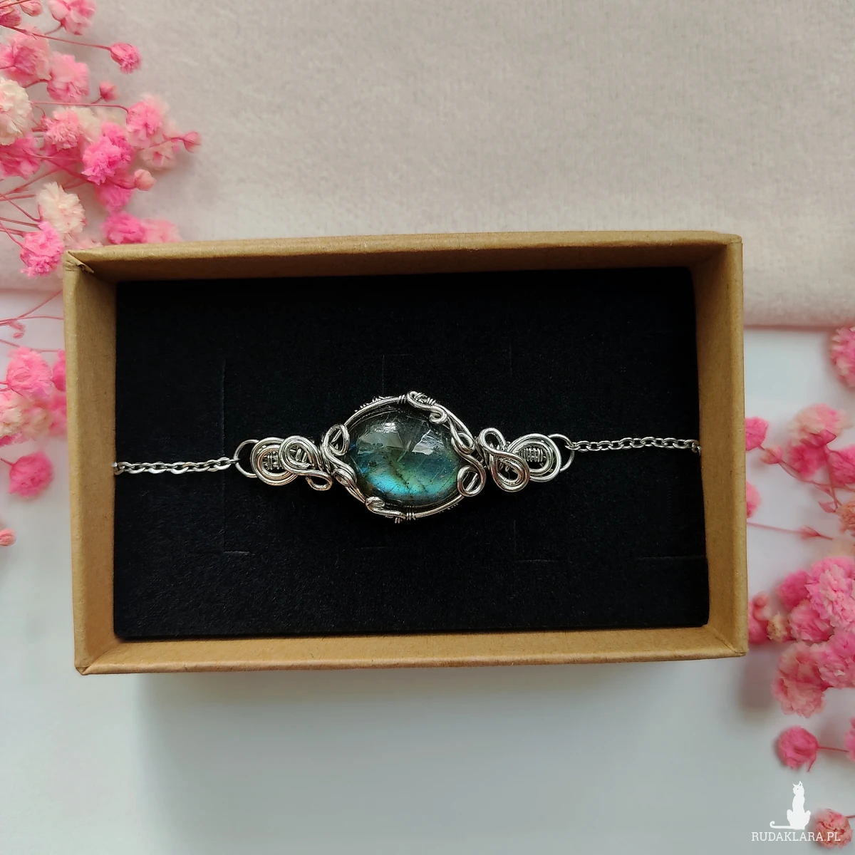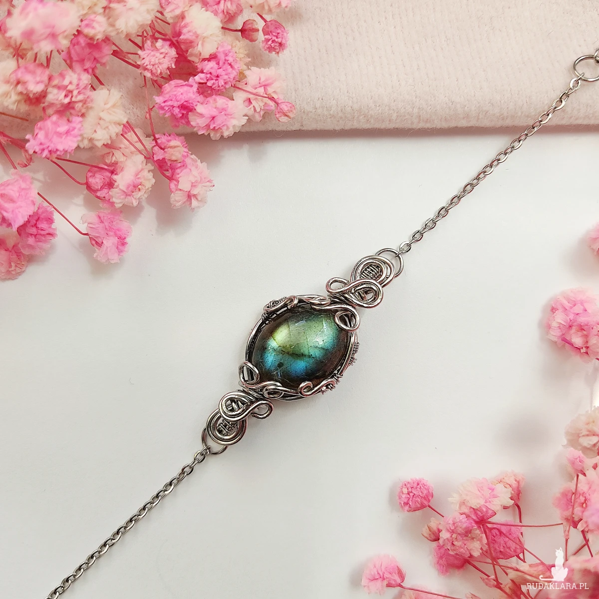 Bransoletka Labradoryt wykonana własnoręcznie. Wykonana techniką wire wrapping z drutów ze stali chirurgicznej.