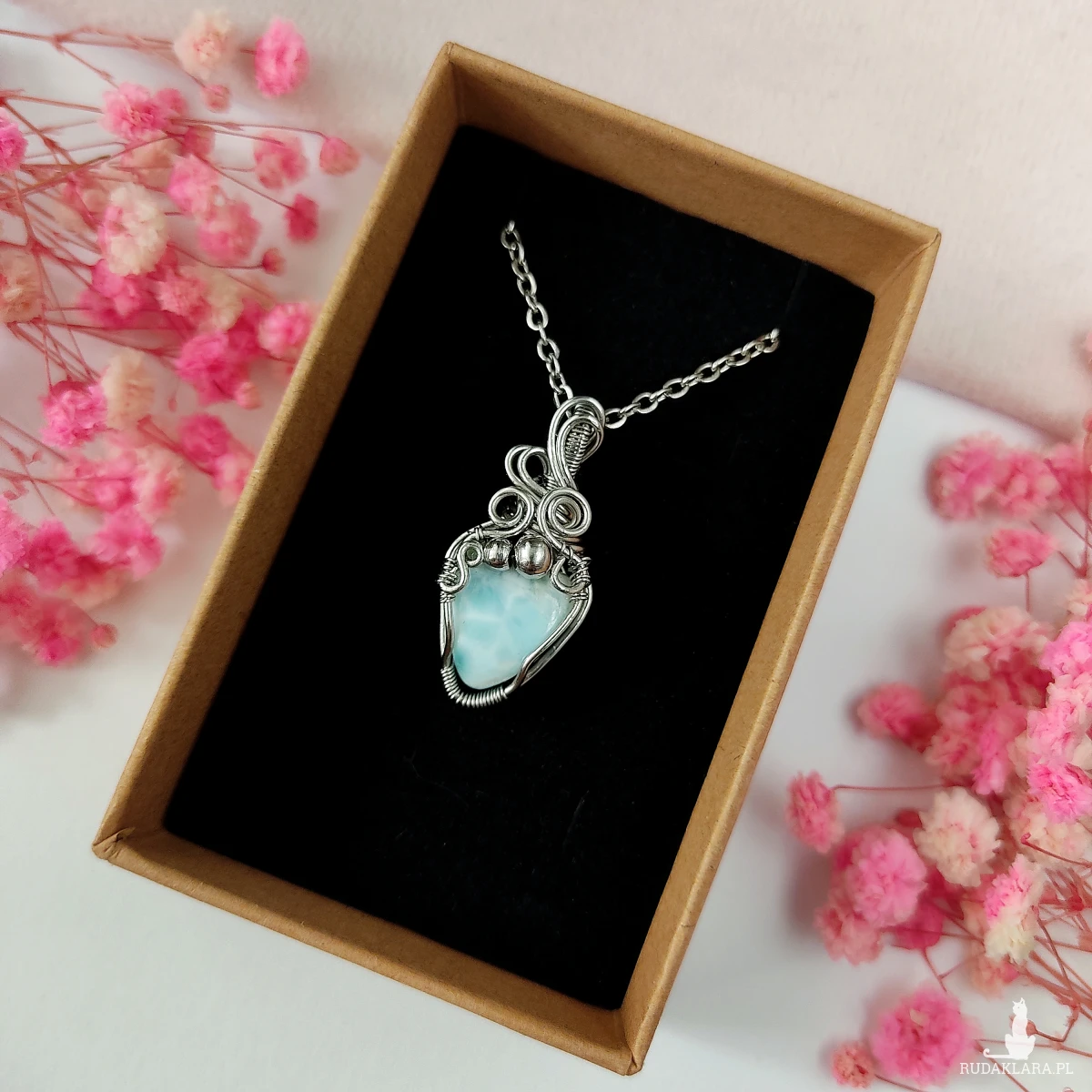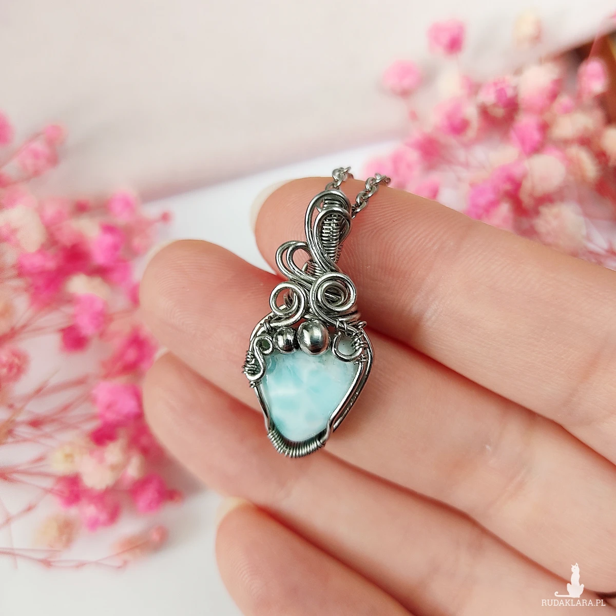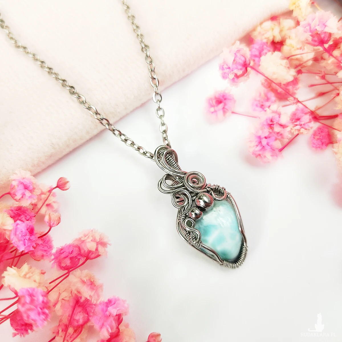 Naszyjnik Larimar ręcznie robiony. Wykonany techniką wire wrapping z drutów ze stali chirurgicznej.