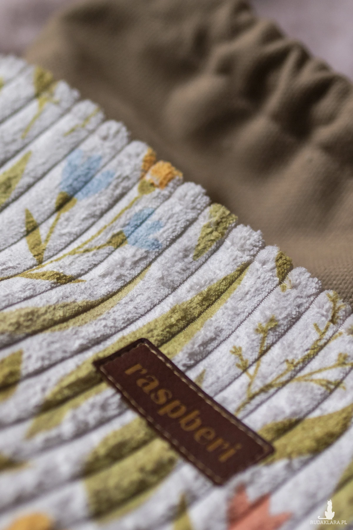 Wykonany z płóciennej jasnobrązowej tkaniny. Z przodu oraz z na tyle torebki kieszenie (np. na telefon czy chusteczki) z grubego sztruksu w kwiaty w kolorze ecru.