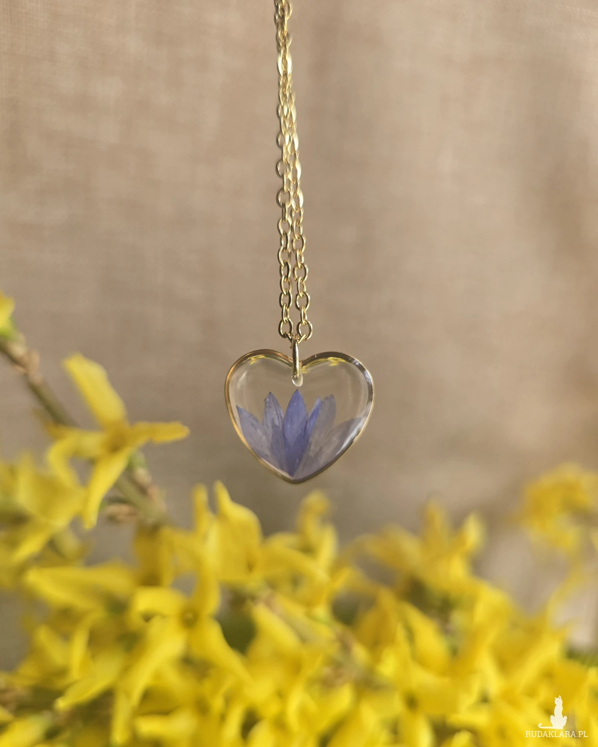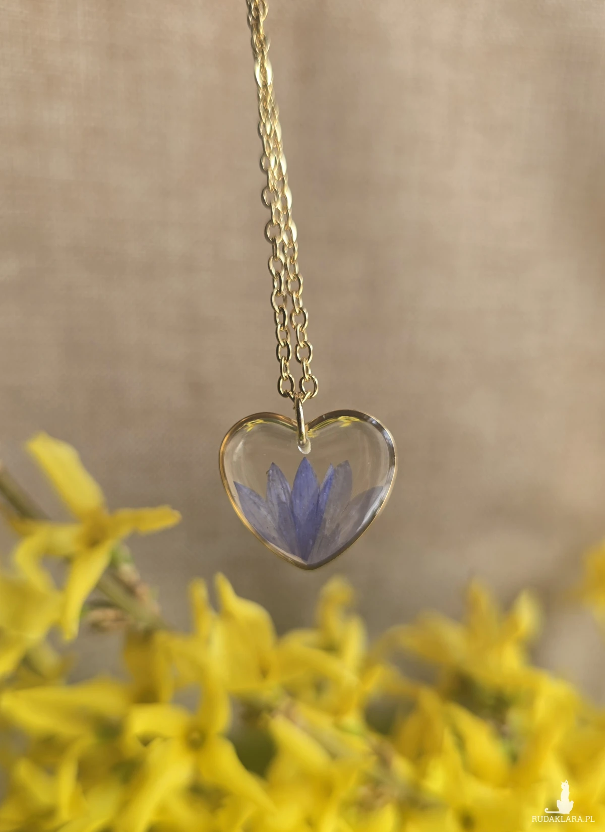 Oferuję Państwu unikalną biżuterię. Zawieszka jest wykonana z suszonych kwiatów i żywicy epoksydowej. Biżuteria jest wspaniałym i oryginalnym prezentem na lata.