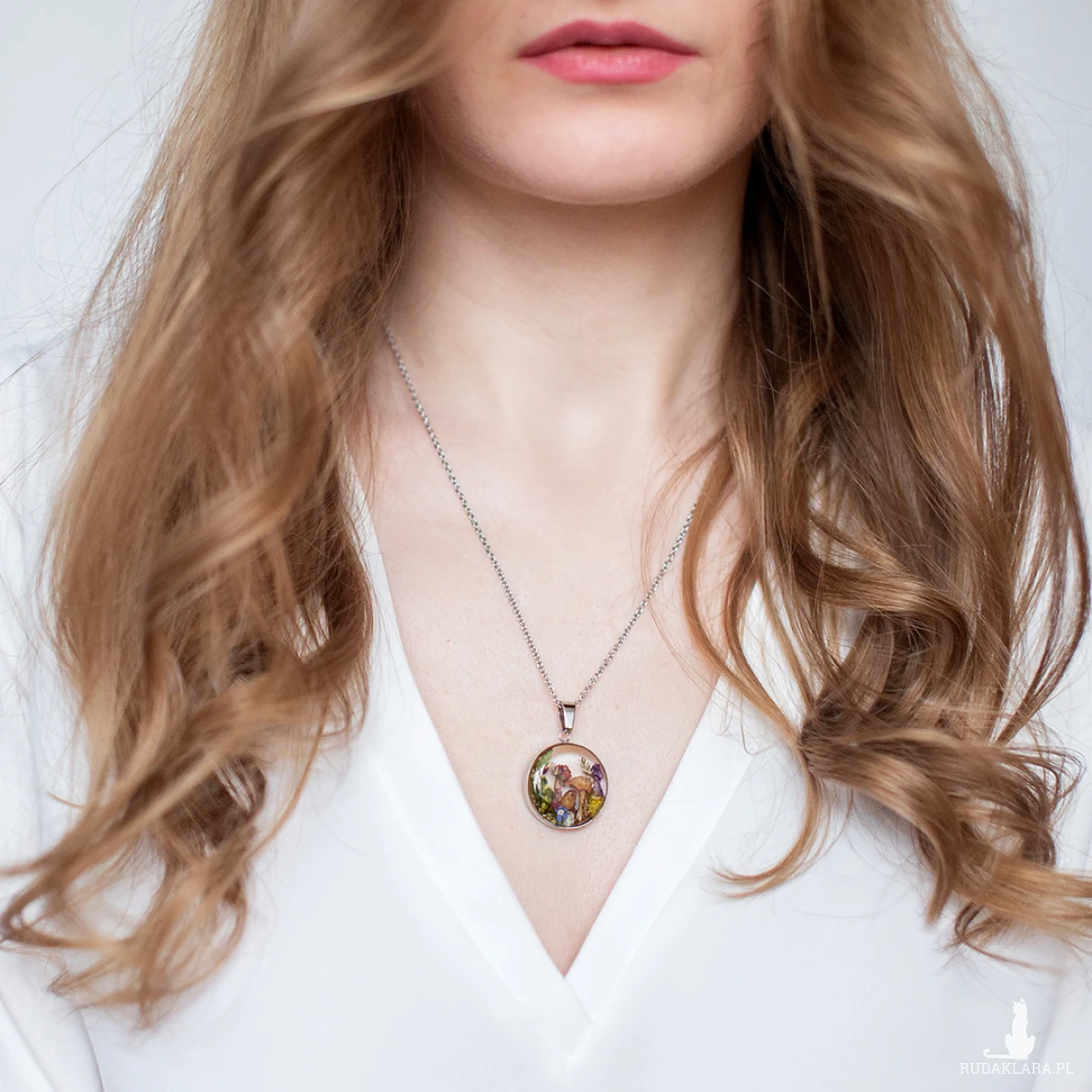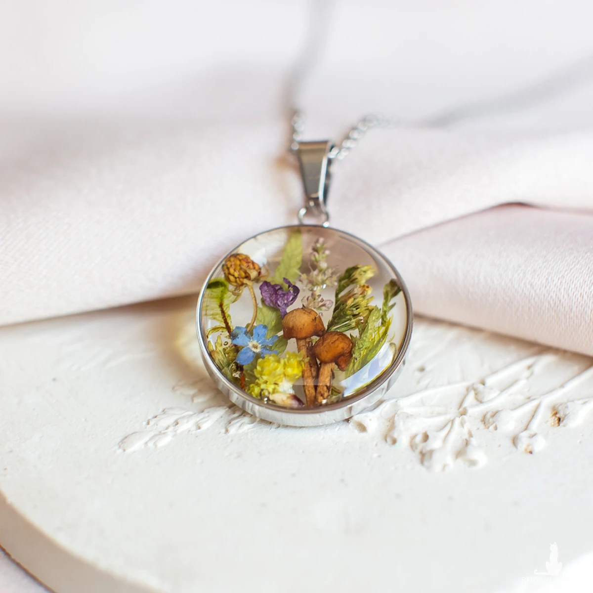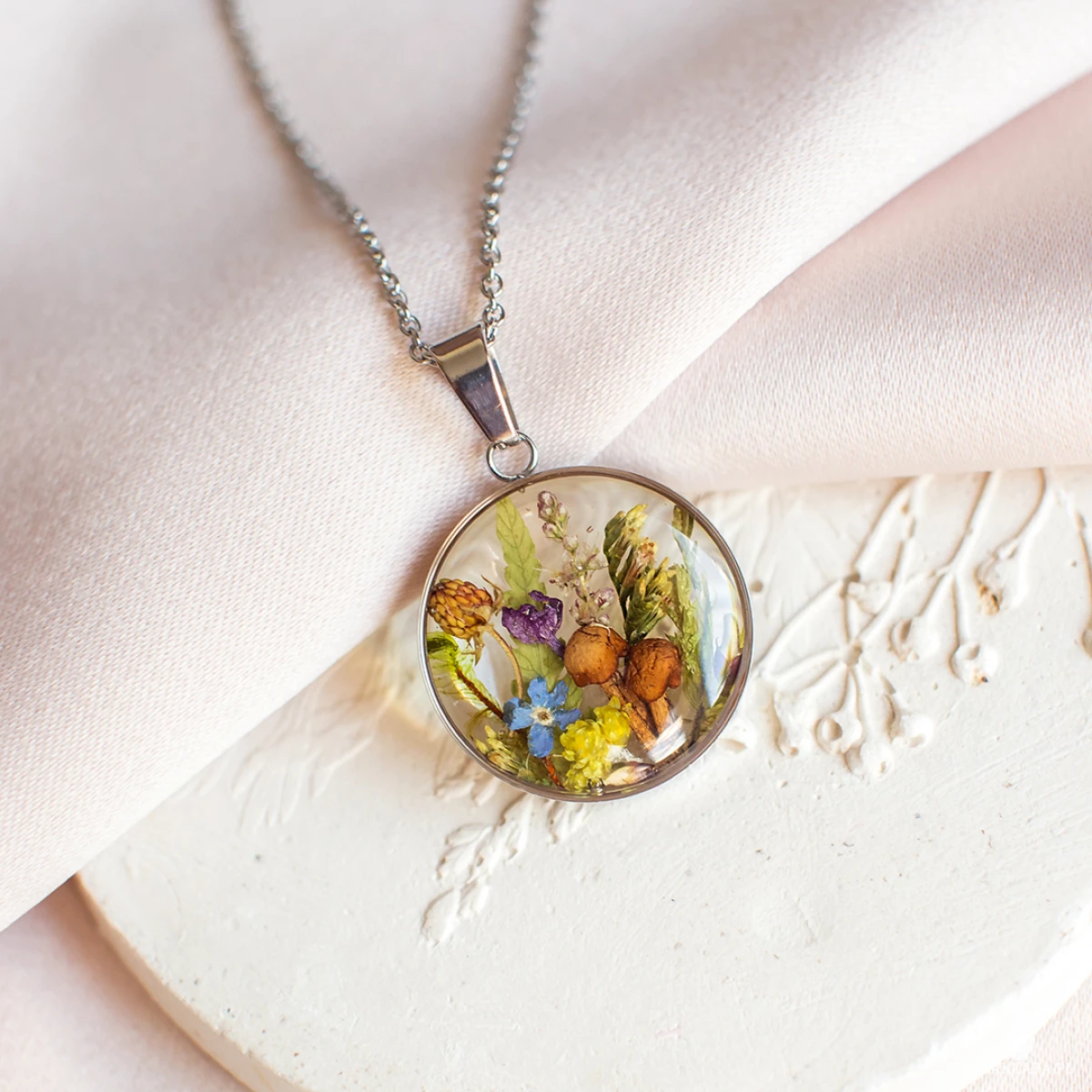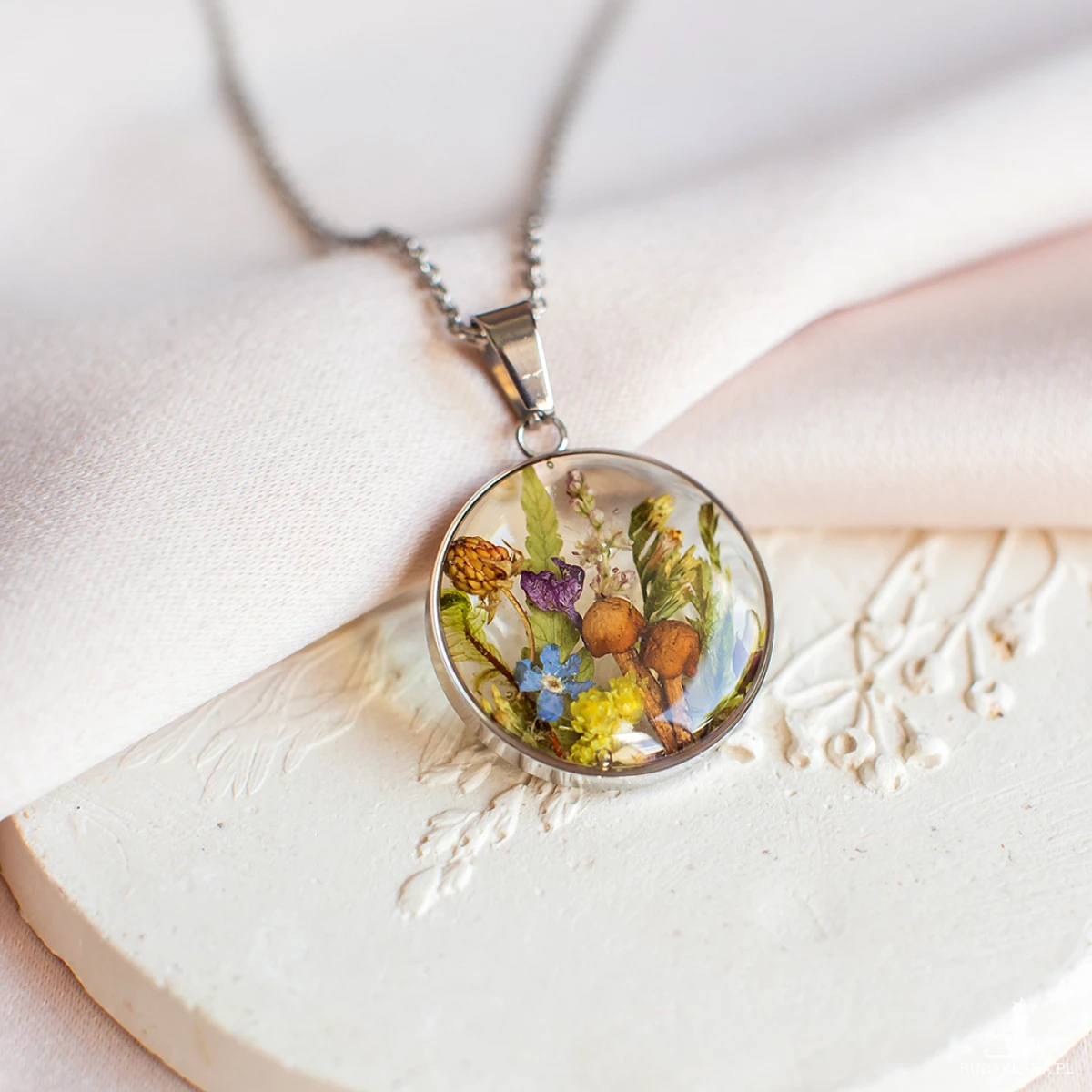 Wisiorek wykonany jest z żywicy epoksydowej z wykorzystaniem suszonych kwiatów. Metalowe elementy to stal nierdzewna szlachetna chirurgiczna.