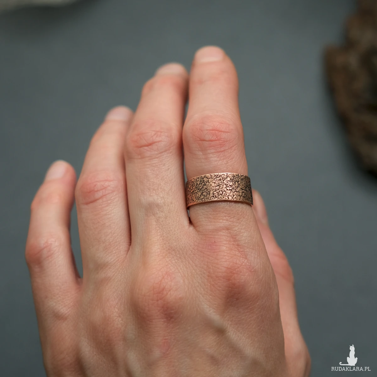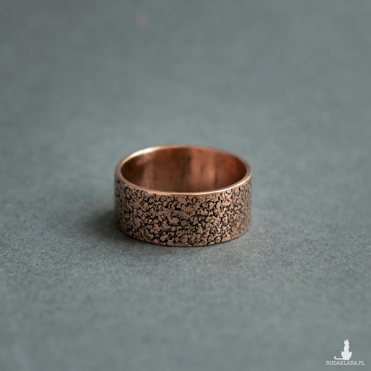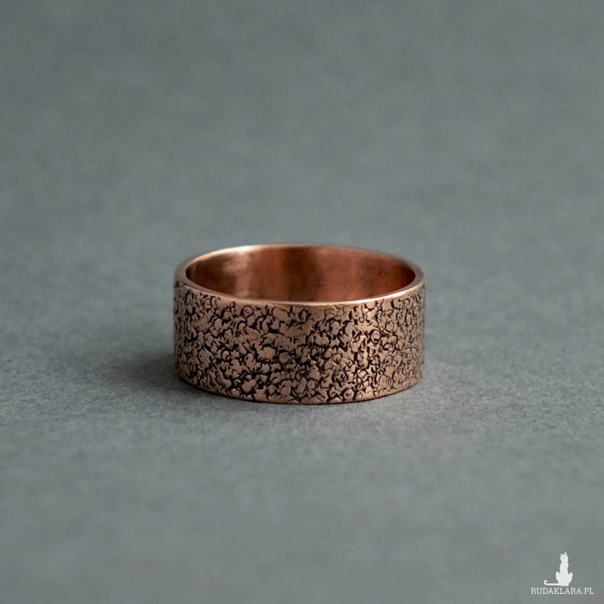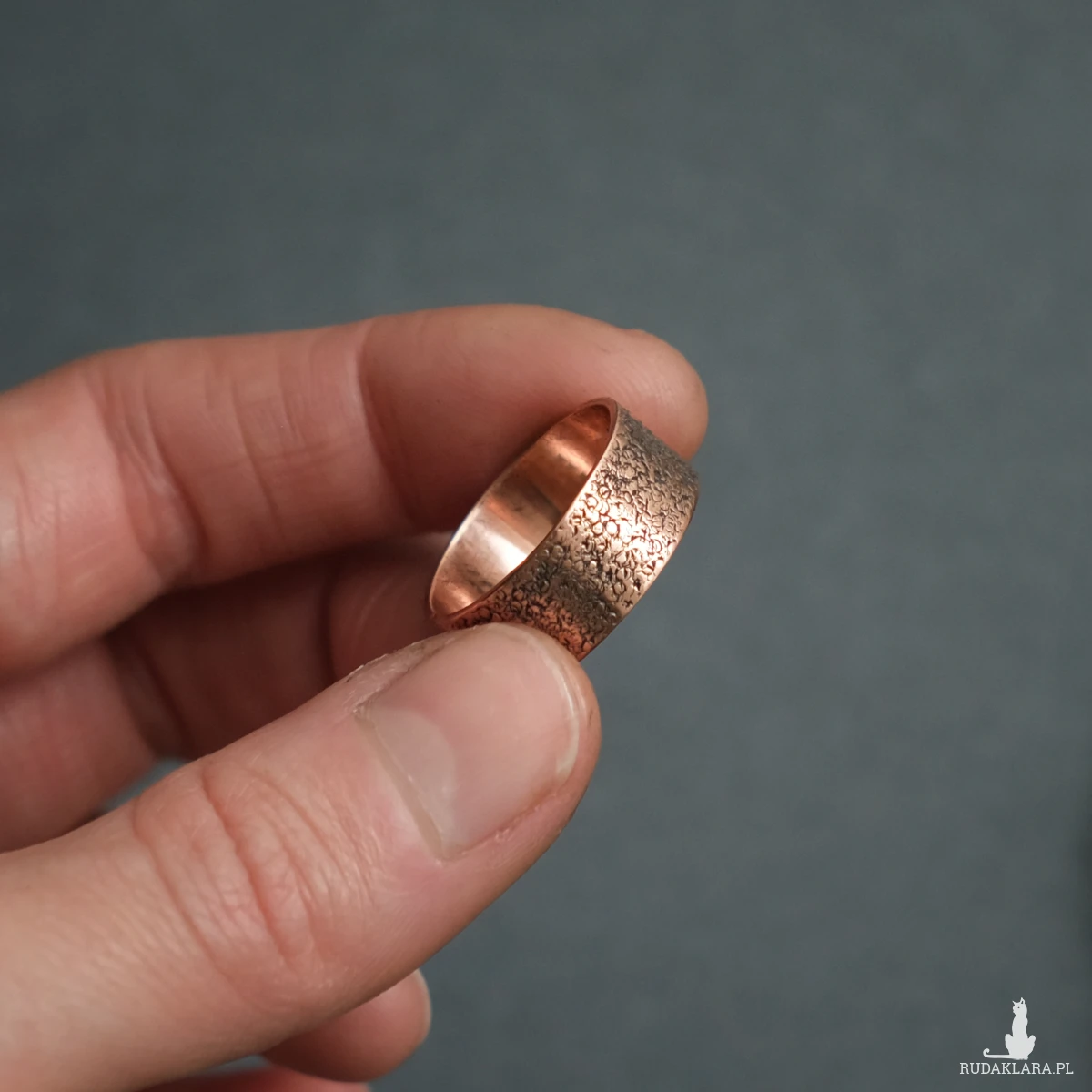 Prosta miedziana obrączka z fakturą. Patynowana w procesie oksydacji, co nadaje jej ciekawego charakteru (zaciemnienia w rowkach, chłodniejszy odcień miedzi).