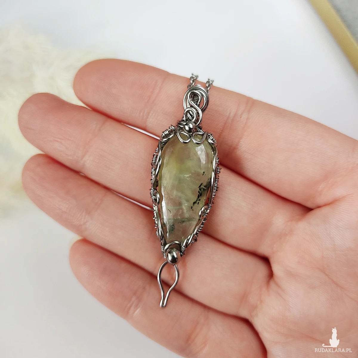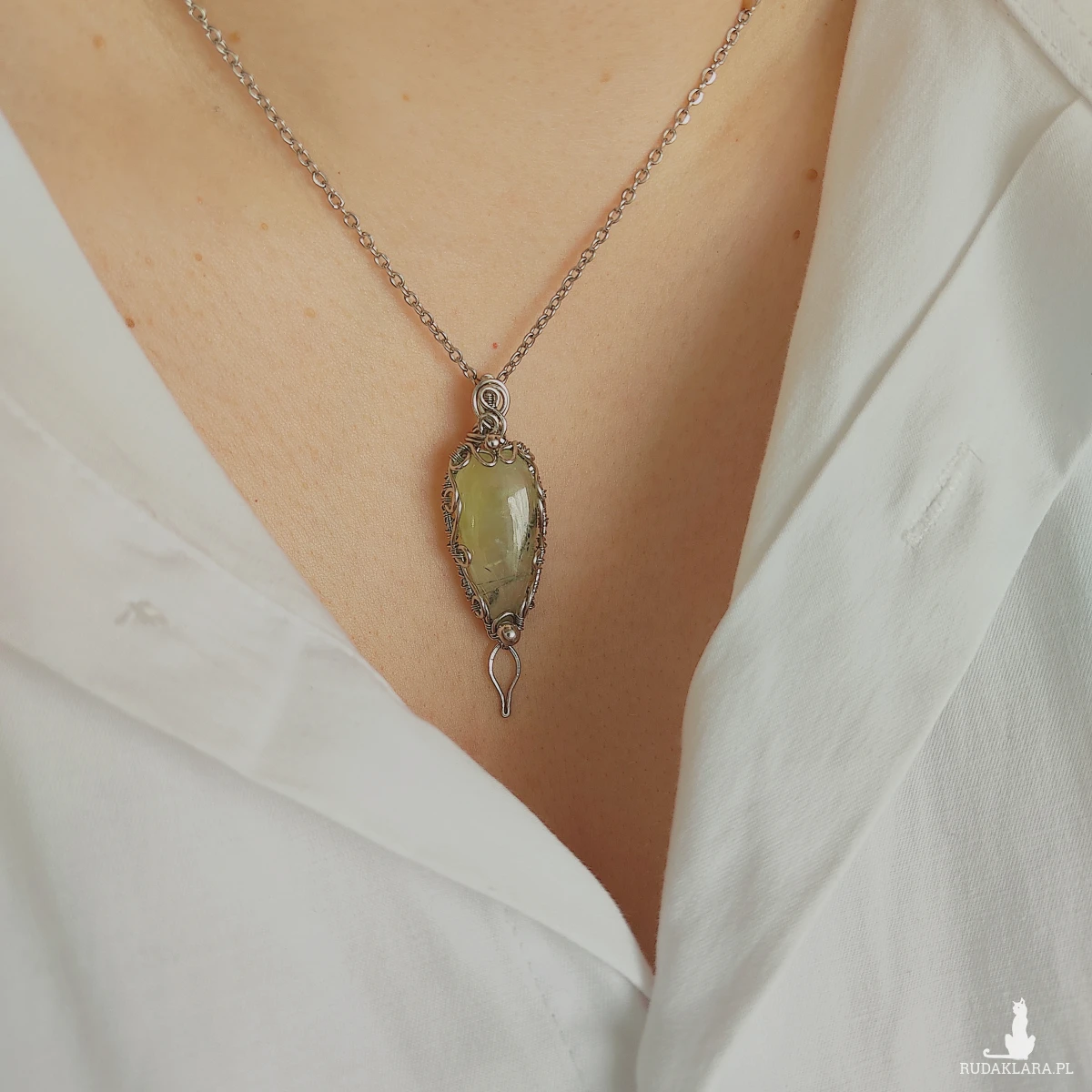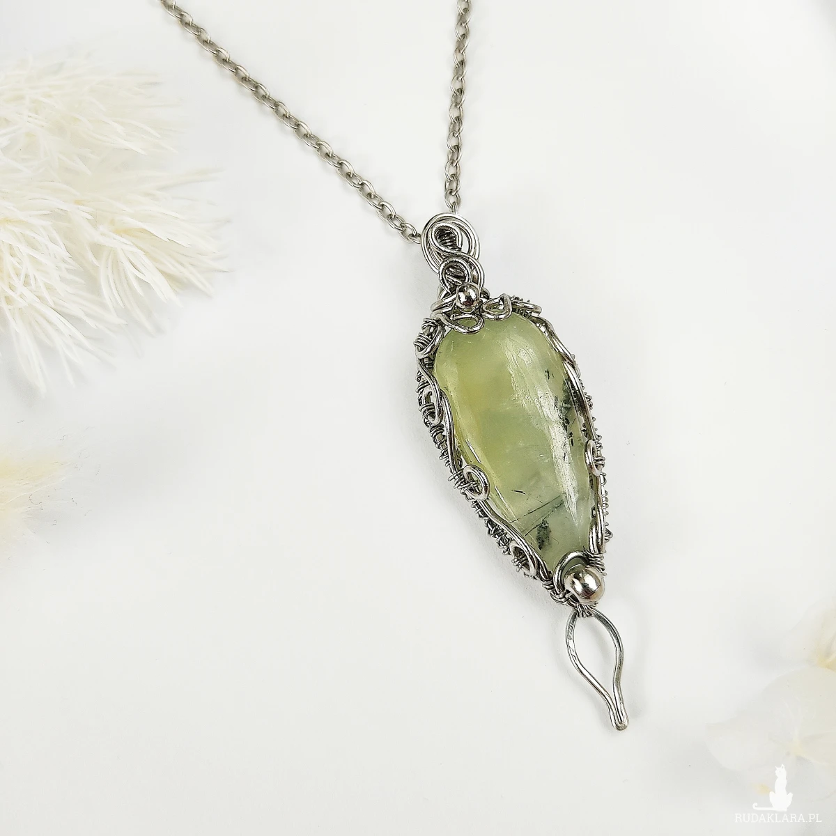 Naszyjnik został wykonany ręcznie w Polsce, z dbałością o najmniejszy detal. Do jego stworzenia użyto hipoalergicznej stali chirurgicznej, co sprawia, że jest bezpieczny dla skóry i odporny na działanie czasu. Prehnit, starannie oprawiony w finezyjną plecionkę z drutu, przyciąga wzrok i zachwyca swoją naturalną urodą.