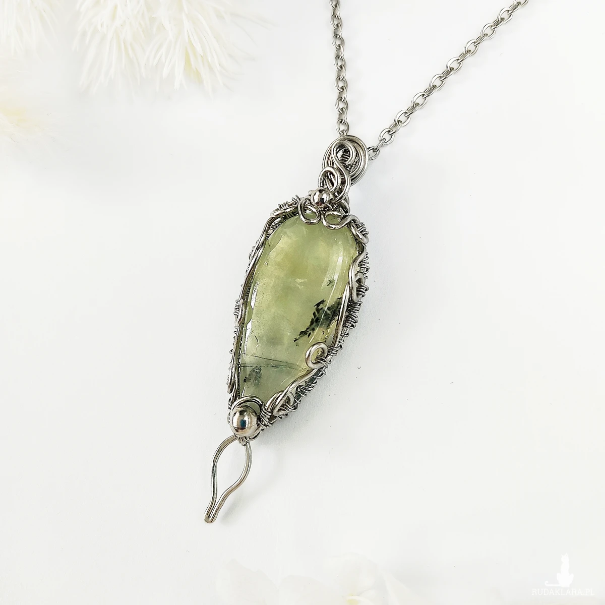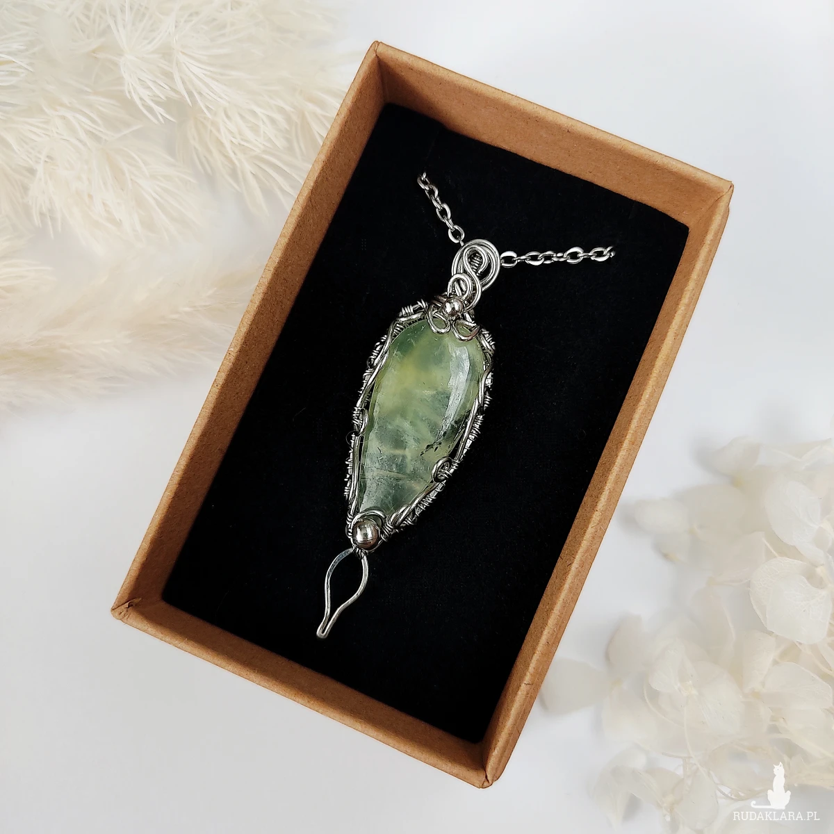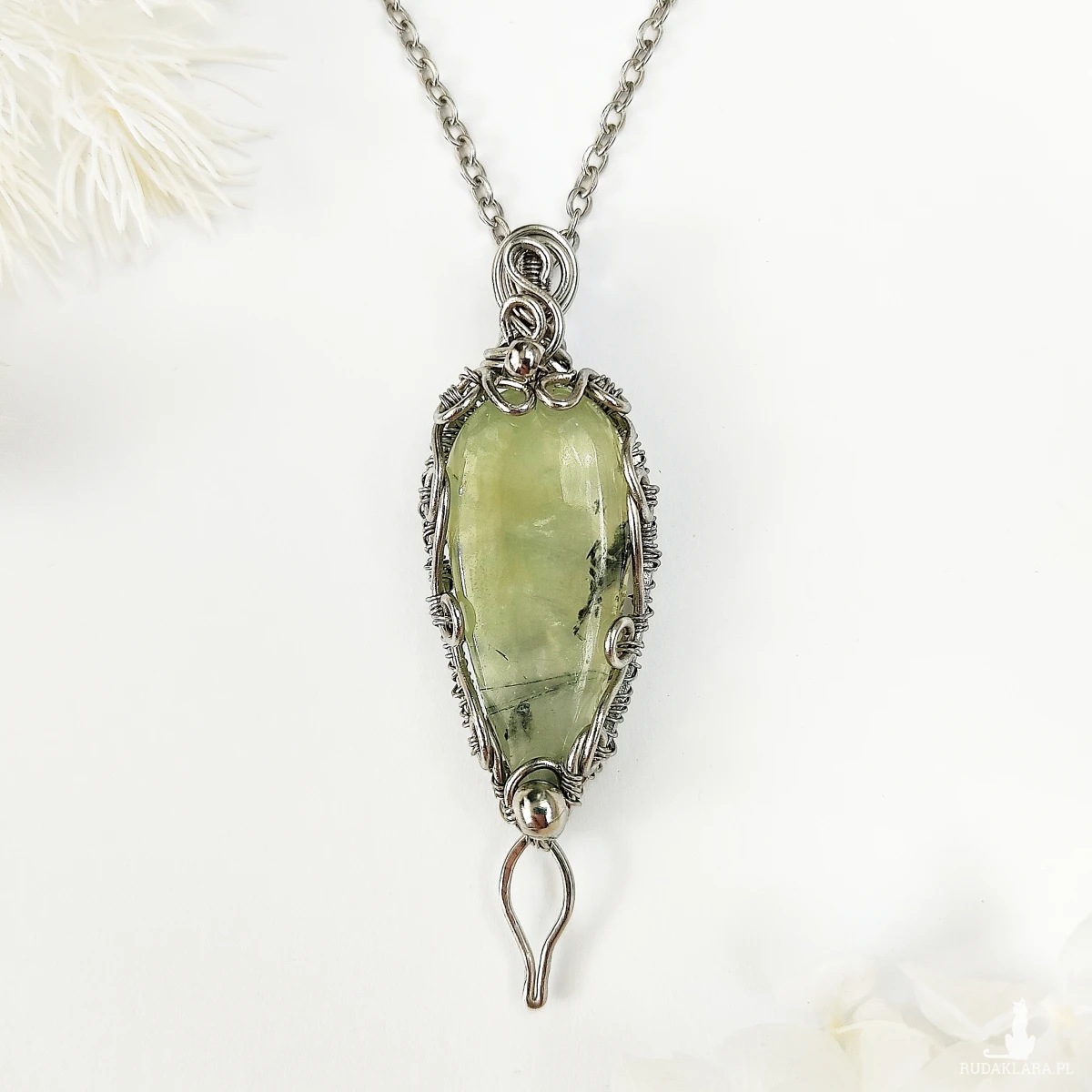Naszyjnik został wykonany ręcznie w Polsce, z dbałością o najmniejszy detal. Do jego stworzenia użyto hipoalergicznej stali chirurgicznej, co sprawia, że jest bezpieczny dla skóry i odporny na działanie czasu. Prehnit, starannie oprawiony w finezyjną plecionkę z drutu, przyciąga wzrok i zachwyca swoją naturalną urodą.