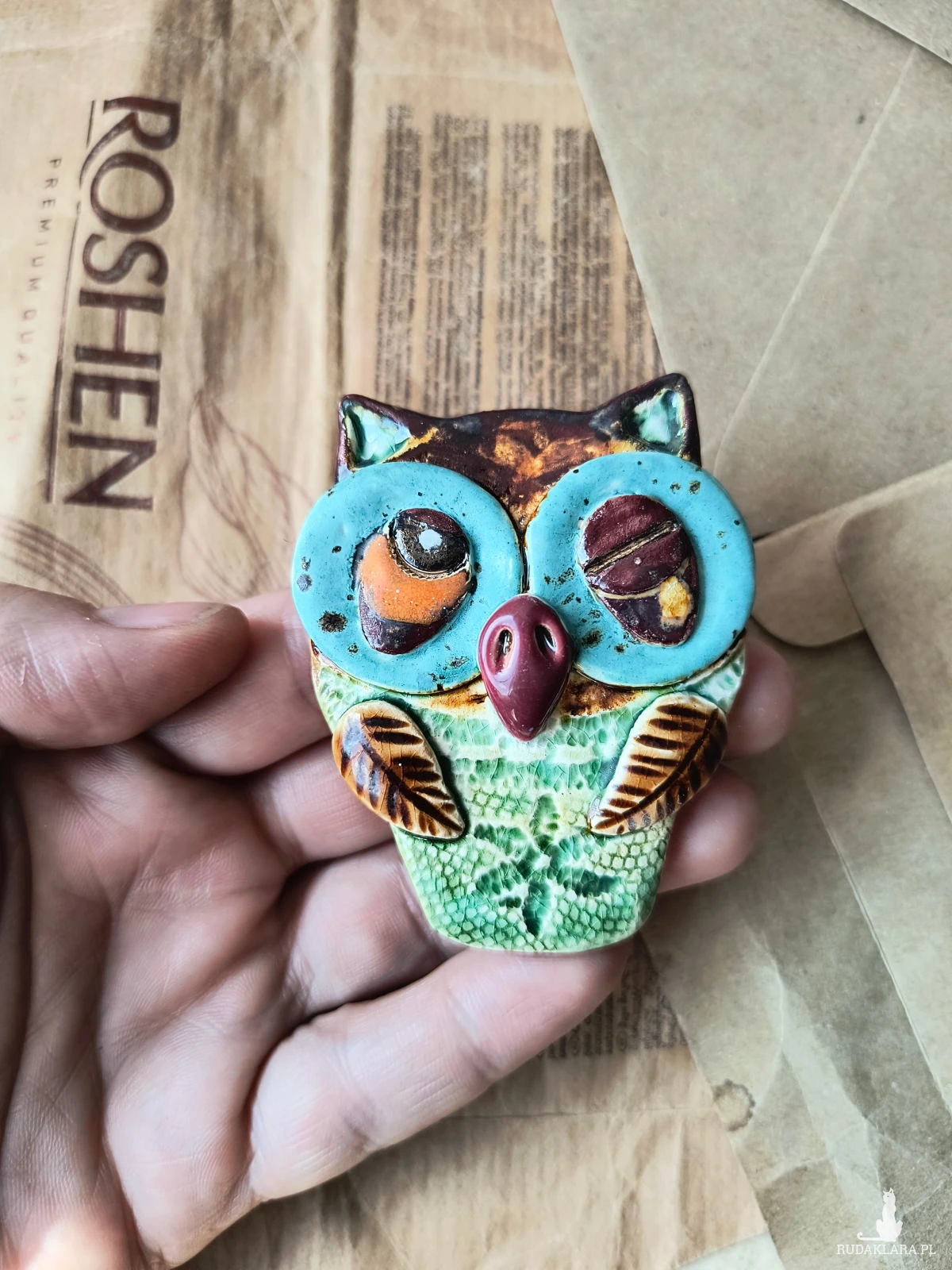 Broszka ceramiczna sówka wykonana z gliny szamotowej, wypalona na biskwit, a następnie szkliwiona w temp. ok 1260 stopni C. Wymiary ok 5,5 cm x 5 cm. Polecam wszystkim miłośniczkom nietuzinkowej biżuterii.