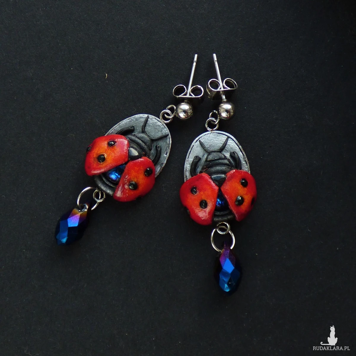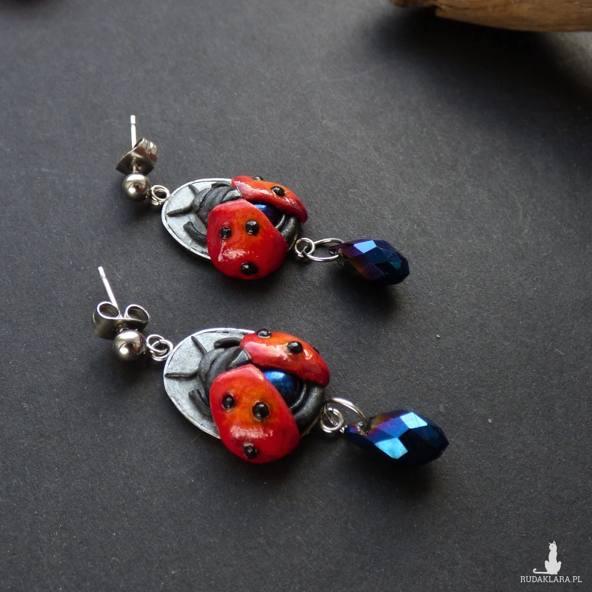 Kolczyki przedstawiające biedronkę w chwili rozkładania skrzydeł – uchwycone w locie, pełne energii i bajkowego uroku! Miniaturowa rzeźba wykonana ręcznie z glinki polimerowej pokazuje czerwone pokrywy skrzydeł i granatowy odwłok wykonany z połyskującego szklanego koralika.